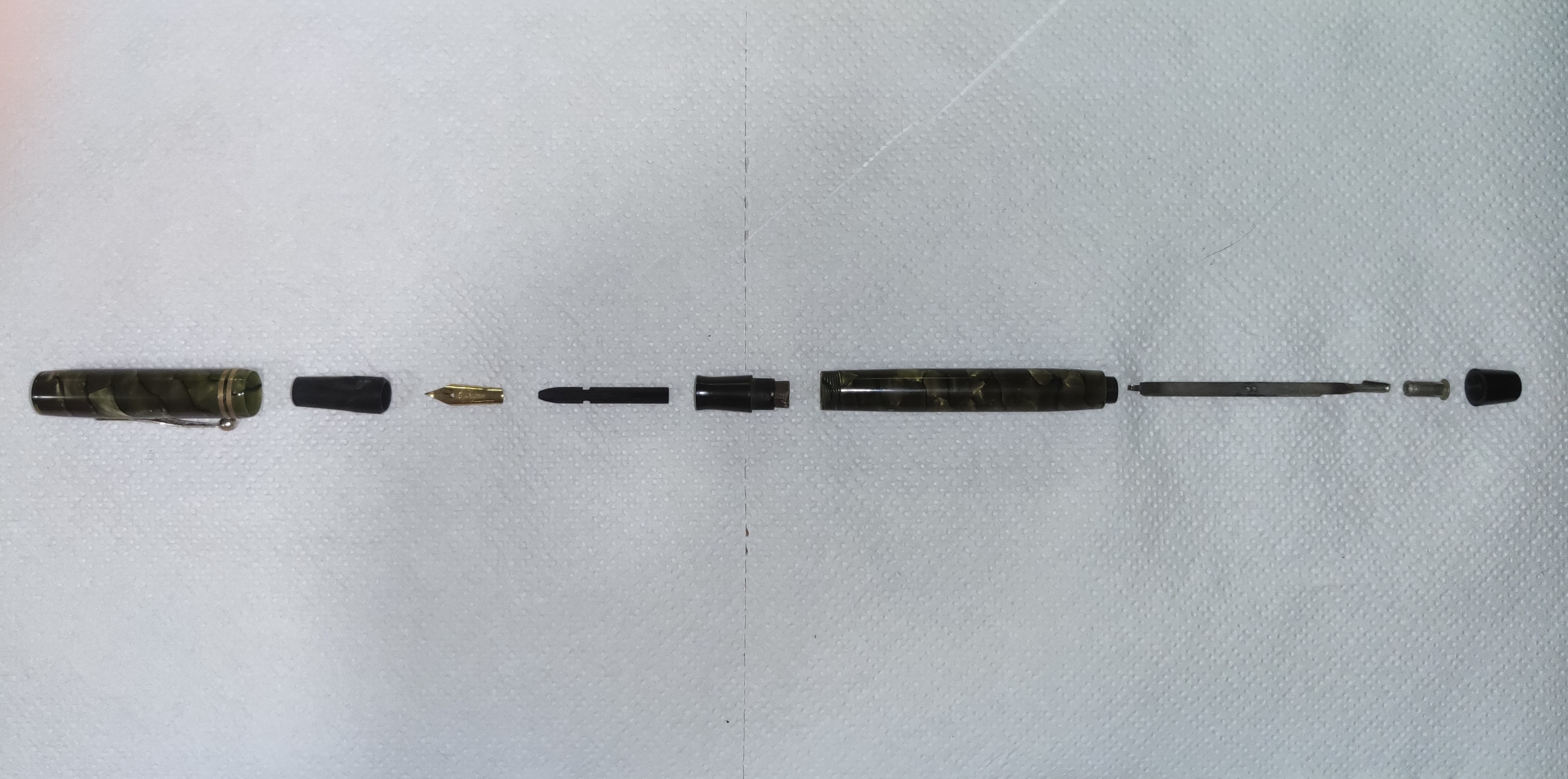 Pare davvero molto simile all'ultima penna che mi è arrivata, presa un po' come una cavia per tentare il primo restauro. Sulla mia c'è scritto the Hoover 873. Lo smontaggio è stato piuttosto semplice...ora dovrei raddrizzare il pennino e montare una nuova sacca. Se procederai con il restauro sarei curioso di conoscere i passaggi, intanto ti allego una foto "dell'esploso" della mia casomai potesse esserti d'aiuto
