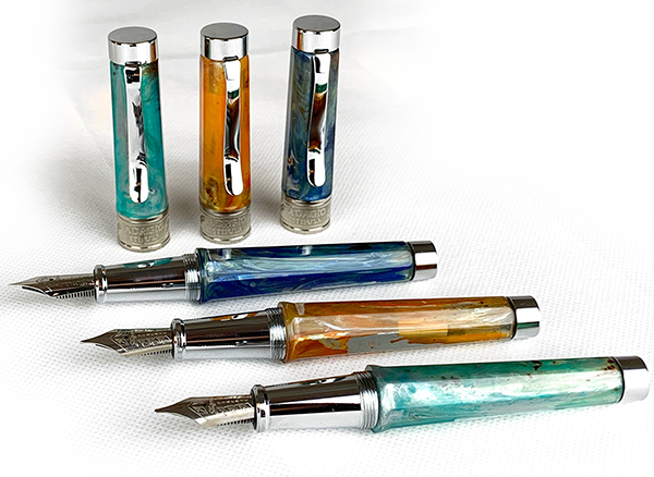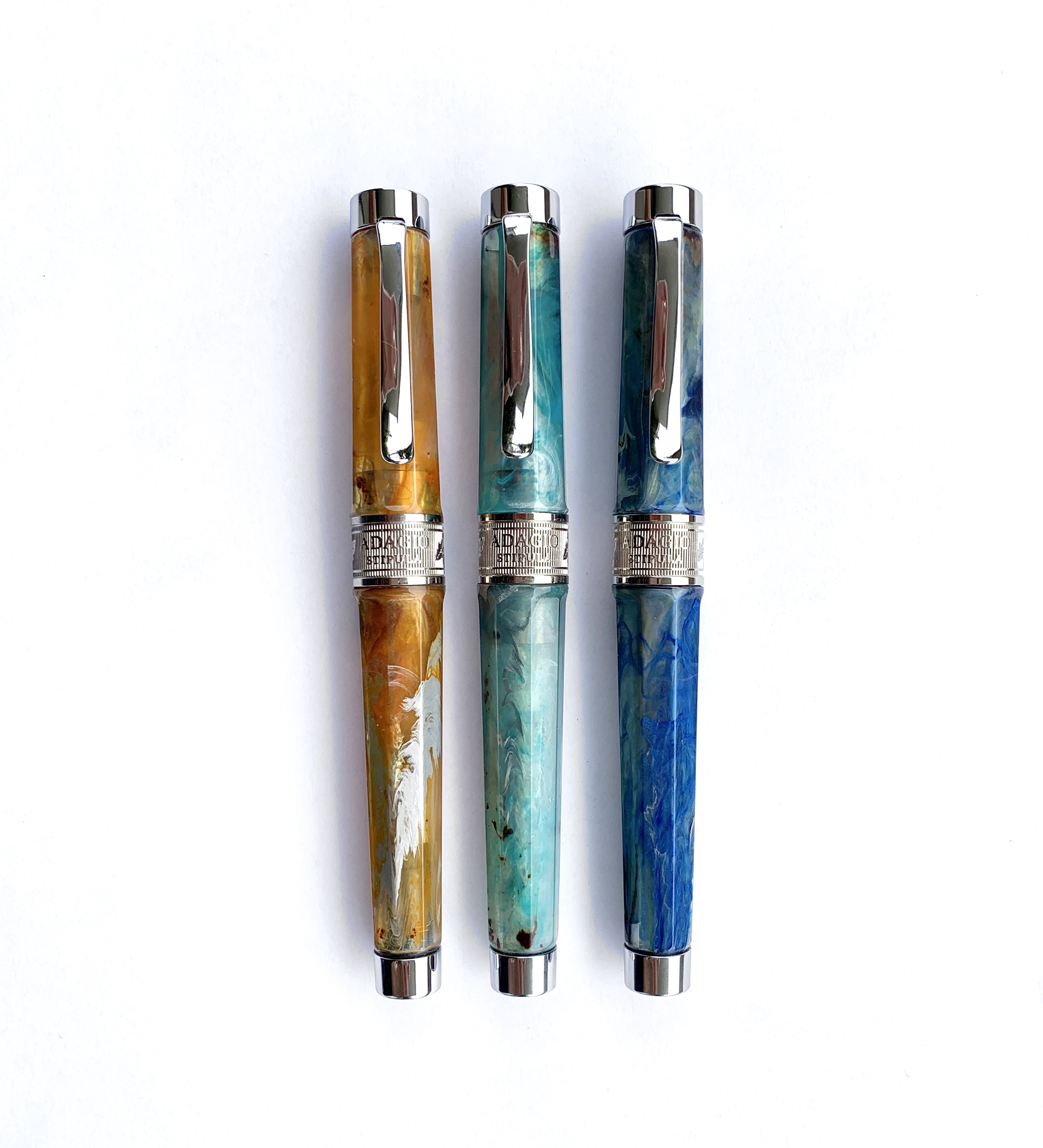 Un mix di resine traslucide, in alcuni punti quasi trasparenti, in altri lattiginose, in altri metallizzati, in 3 colori stupendi che sarebbe difficile decidere qual è il più bello.