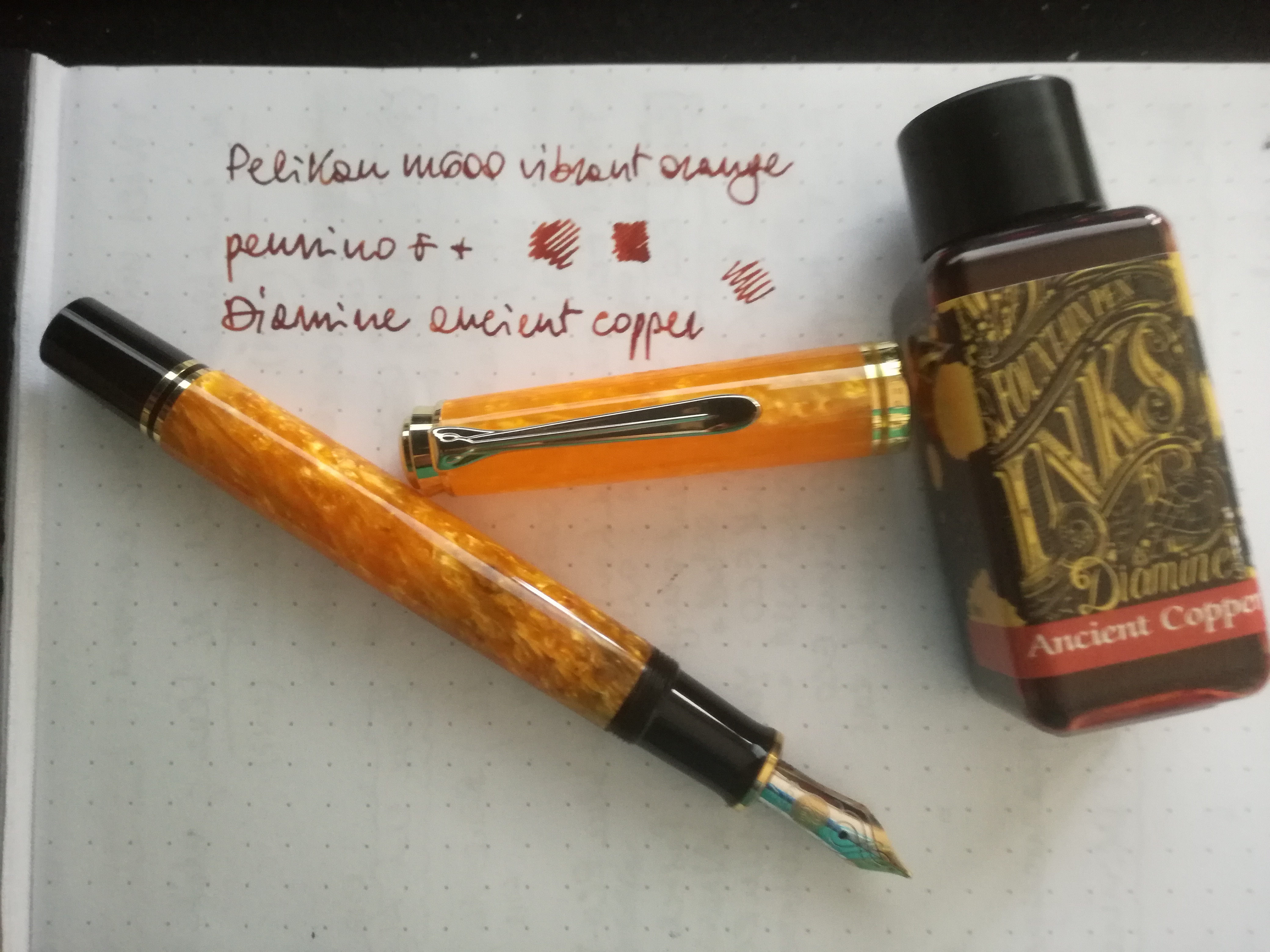 - Pelikan m600 Vibrant Orange pennino F + Diamine Ancient Copper (uella!!)