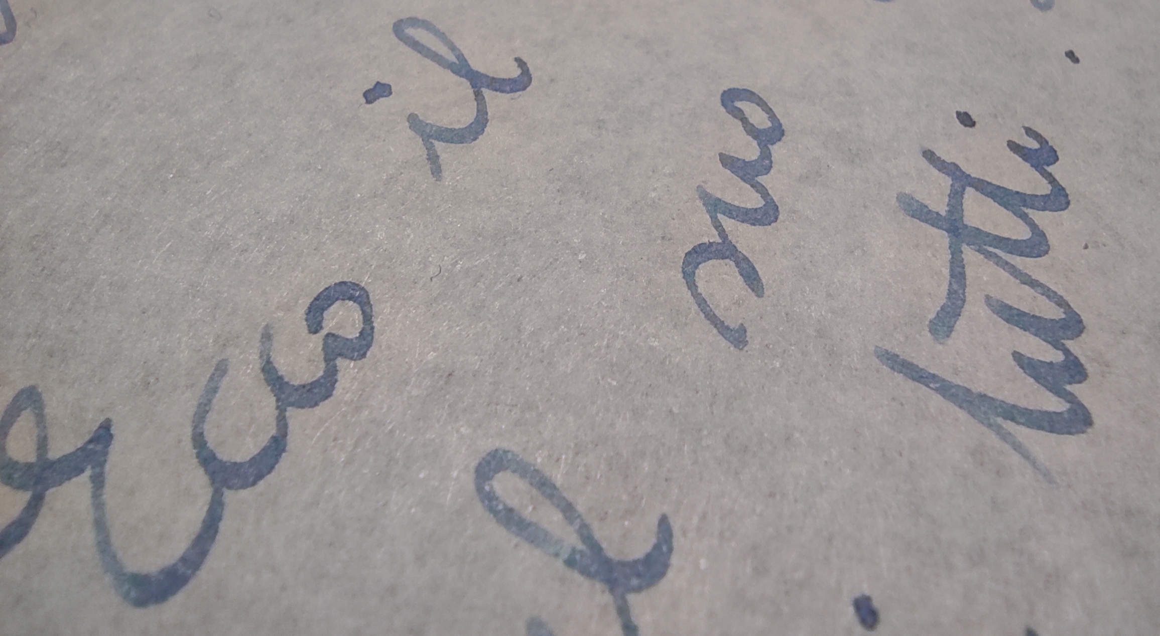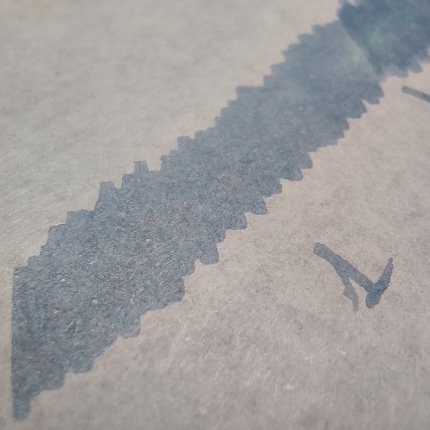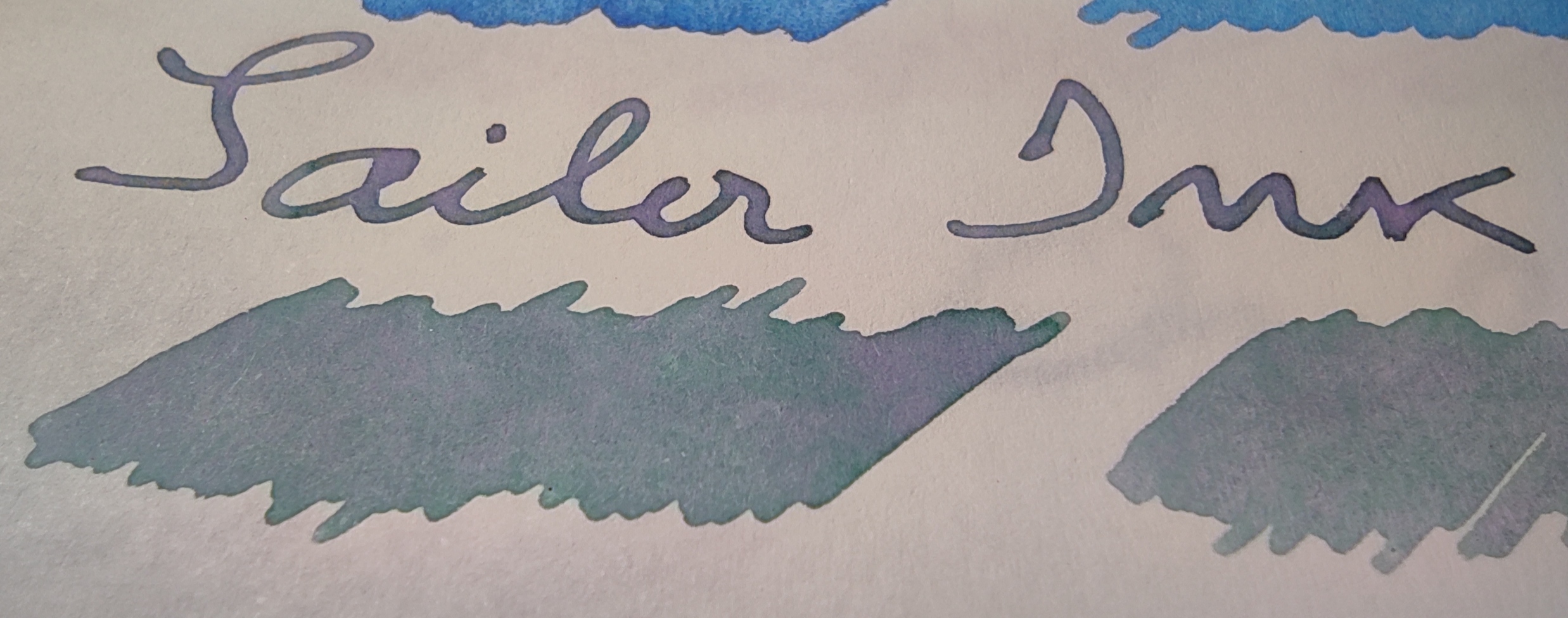 Guardando da vicino si vede che il colore è fatto di due componenti, un rosa-lavanda e un verde acqua. Per notare la separazione, la carta Schizza&Strappa (sopra) richiede ingrandimenti da ragioner Filini, mentre la Tomoe (sempre sia lodata, sotto) permette all'inchiostro di rivelare senza remore tutta la sua magia. L'anglosfera chiama questo tipo di inchiostri double shaders e altri nomi, io li trovo ipnotici e seducenti.