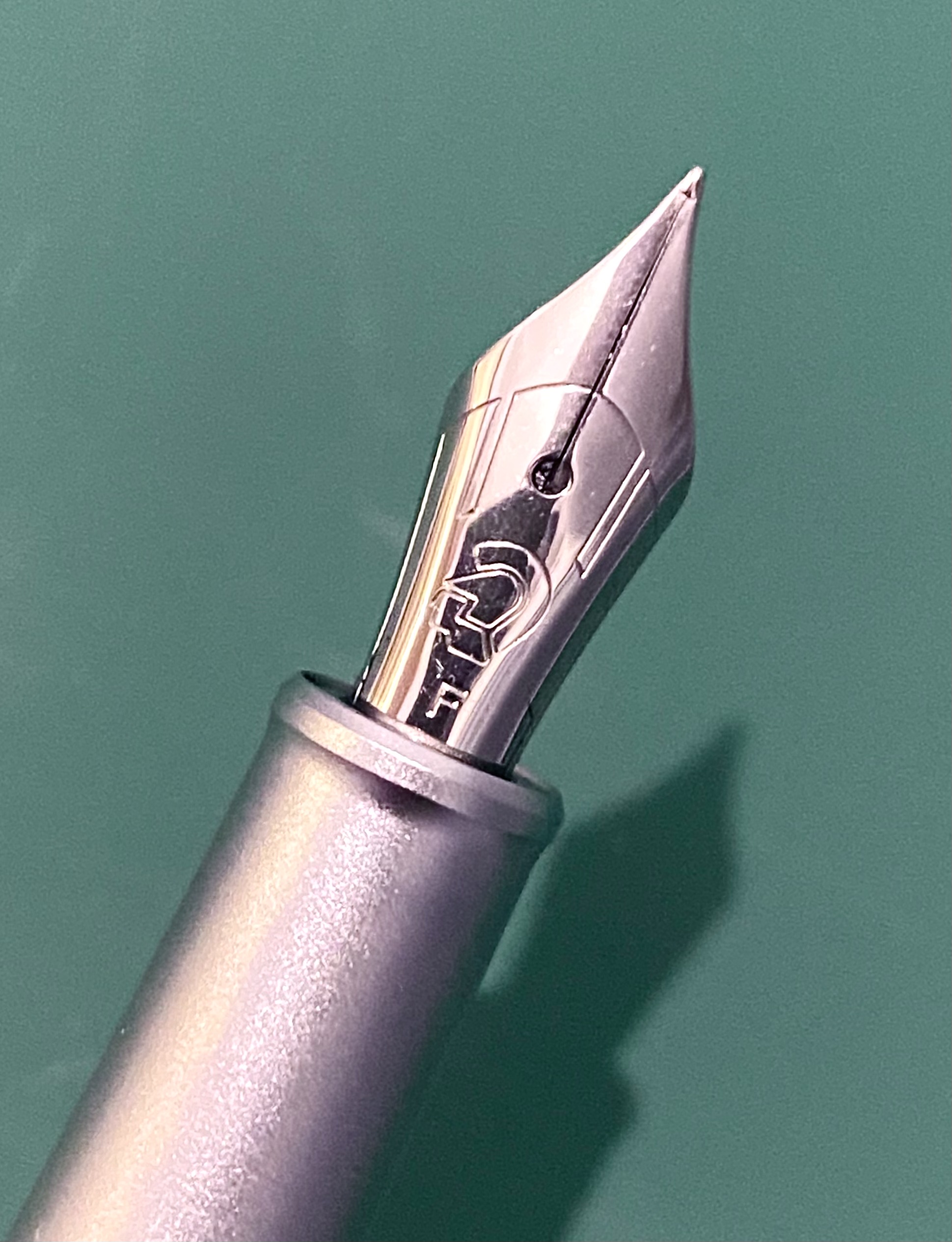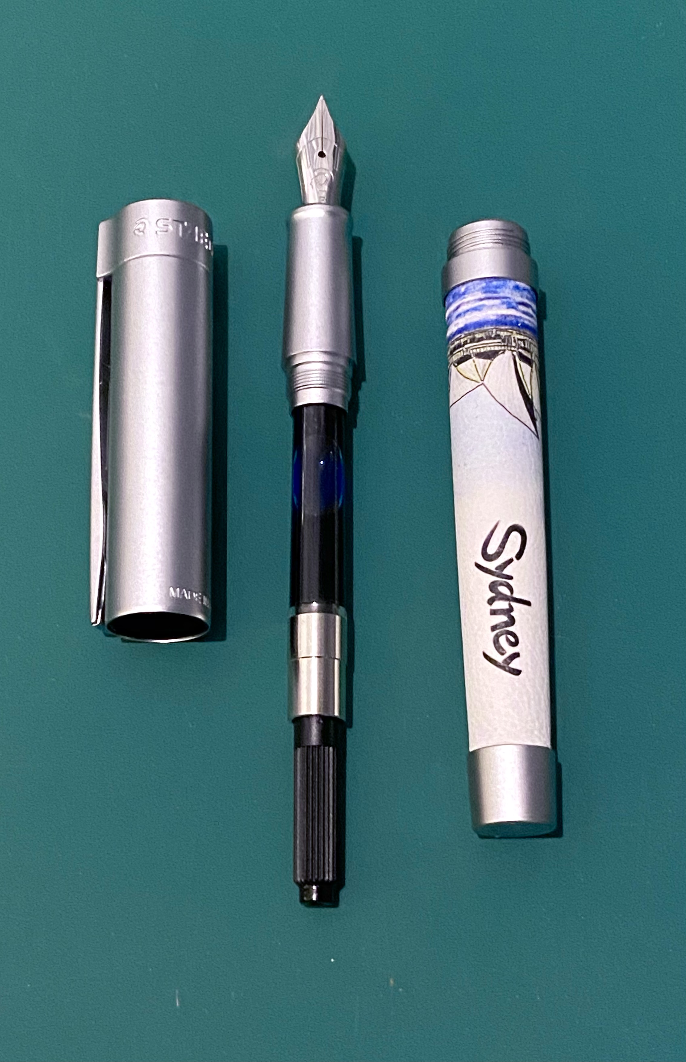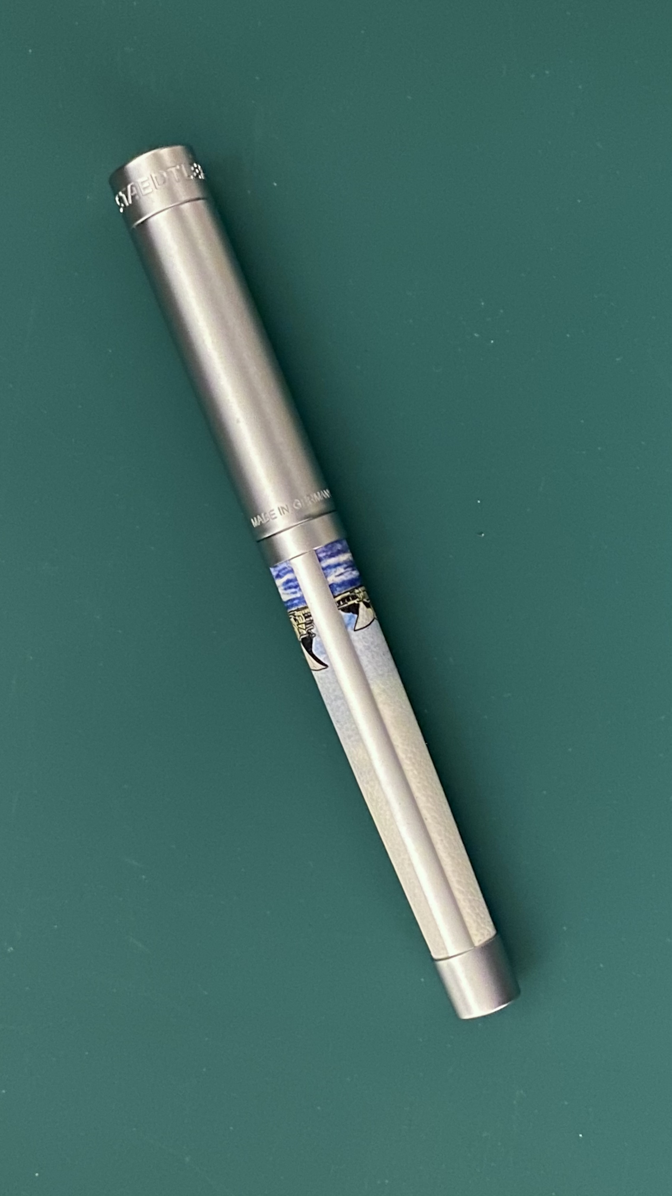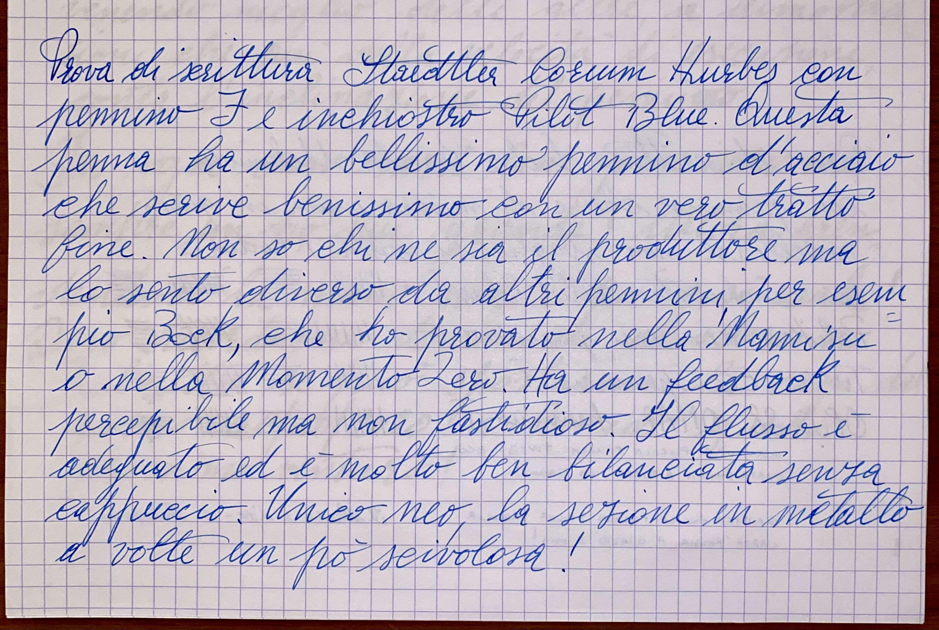 La penna risulta molto ben bilanciata ma va usata senza calzare il cappuccio. Ci ho provato e si aggancia coprendo solo la parte metallica, il tutto sembra abbastanza instabile e rende la penna lunghissima e sbilanciata verso la parte posteriore. Chiaramente è pensata per essere usata senza. La qualità costruttiva mi sembra veramente molto molto alta (probabilmente la penna meglio costruita che abbia avuto finora) e si nota in piccoli particolari come l’attacco della clip, le incisioni (nette, pulite e senza sbavature o imprecisioni) nel cappuccio (sulla sommità il logo del produttore, più in basso la scritta Staedtler e in basso la classica “made in Germany”) e nella giuntura della fascia di pelle che ricopre il fusto coperta da una fascia di metallo lungo tutto il corpo. Da notare che il cappuccio si avvita con un giro soltanto e la suddetta fascia di metallo può trovarsi solo in due posizioni rispetto alla clip del cappuccio: perfettamente allineata o ruotata esattamente di 180 gradi (si vedrà bene in foto) segno che la filettatura del corpo è stata realizzata esattamente con questo obiettivo. La qualità dei materiali sembra ottima e coerente con il resto. Il cappuccio come detto è a vite mentre il converter ad innesto ed entra abbastanza in profondità da risultare molto stabile. Dopo averla pulita, asciugata e caricata ha cominciato a scrive in maniera ineccepibile fin da subito. Il tratto F è veramente fine, e il flusso adeguato, non eccessivo da pasticciare scrivendo piccolo ma nemmeno troppo asciutto da compromettere la scrittura veloce. Unico neo, la presa sulla sezione in metallo satinato in alcune circostanze può risultare un poco incerta, ma niente di tragico. Nel complesso è una gran bella penna, se piace il genere moderno, ottimamente costruita e che funziona molto molto bene. Il prezzo di listino di 260€ dal sito del produttore secondo me è veramente esagerato a meno che non si attribuisca un qualche valore artistico al disegno fatto a mano. Comunque avendola pagata soltanto 43€ la reputo assolutamente al di sopra delle mie aspettative. Come sempre allego qualche foto e una piccola prova di scrittura.