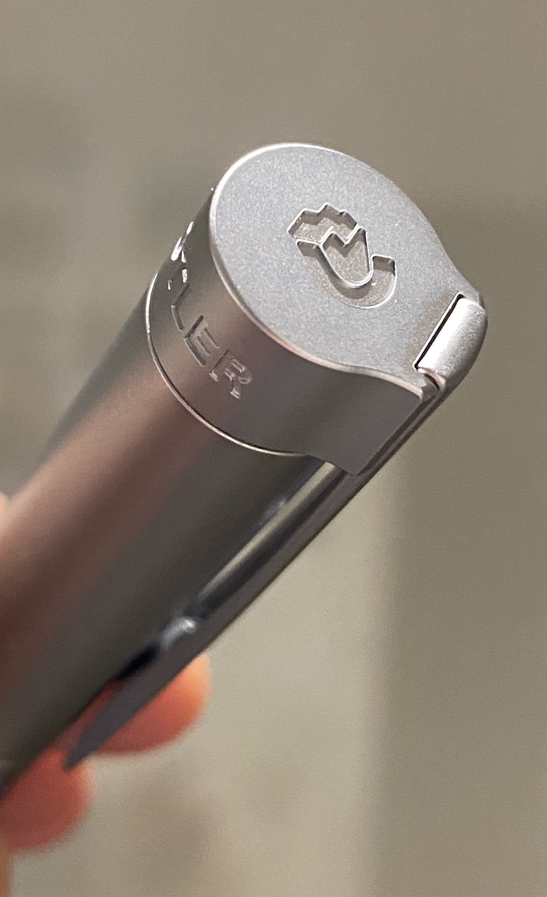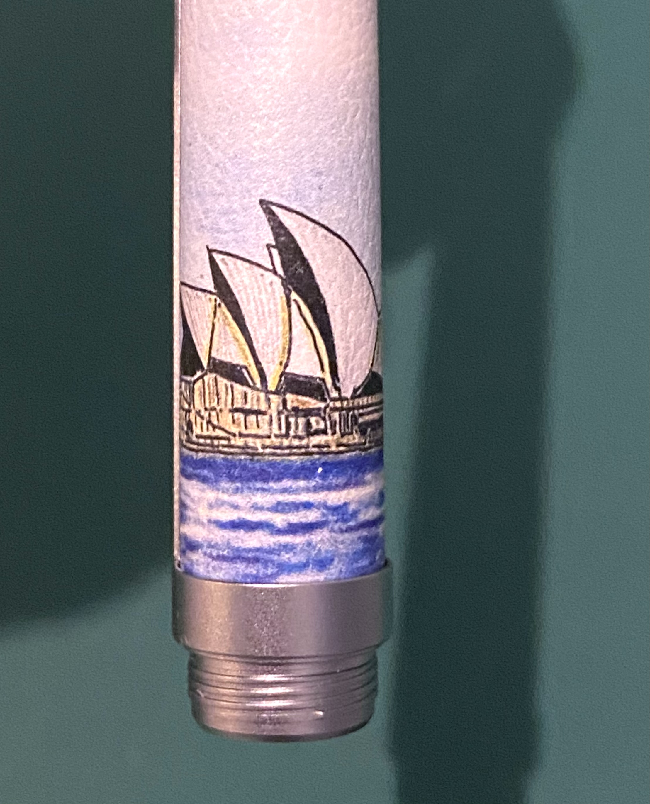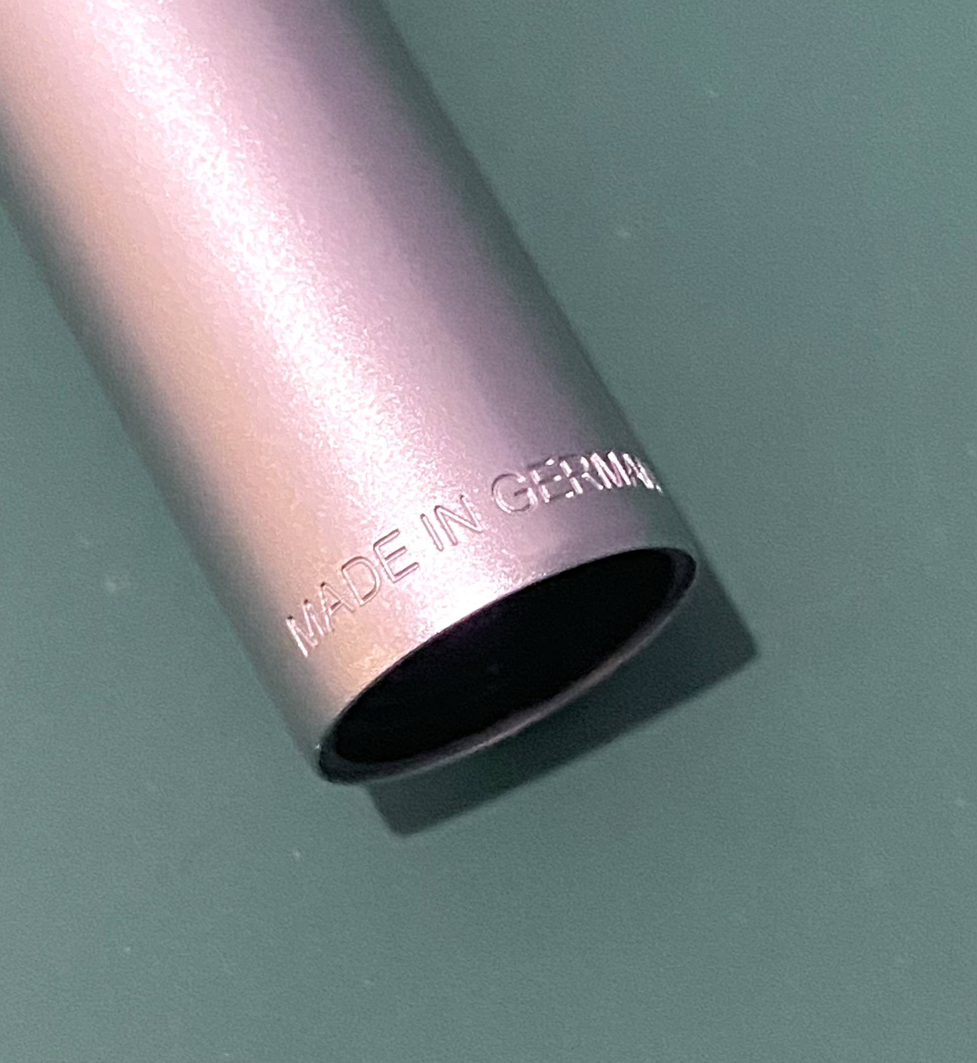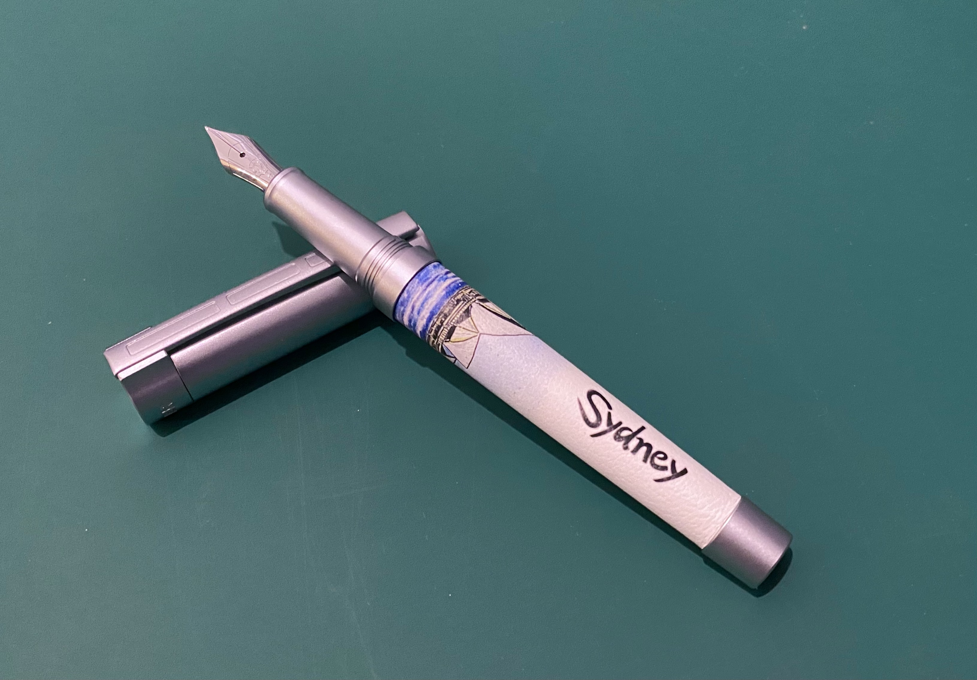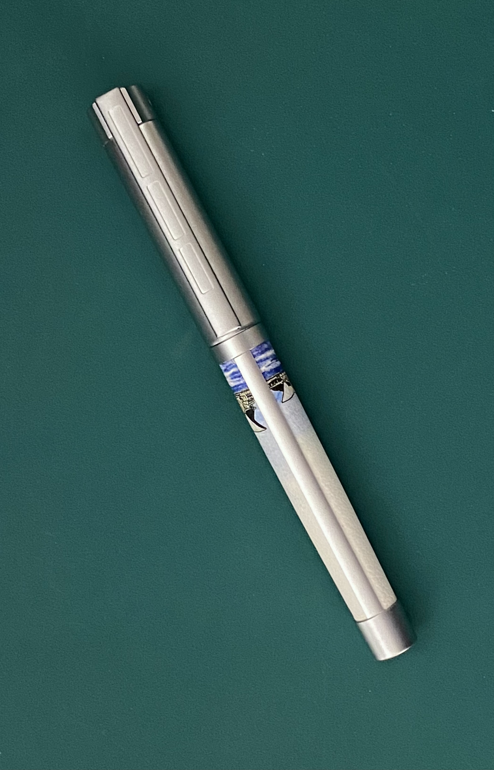La penna risulta molto ben bilanciata ma va usata senza calzare il cappuccio. Ci ho provato e si aggancia coprendo solo la parte metallica, il tutto sembra abbastanza instabile e rende la penna lunghissima e sbilanciata verso la parte posteriore. Chiaramente è pensata per essere usata senza. La qualità costruttiva mi sembra veramente molto molto alta (probabilmente la penna meglio costruita che abbia avuto finora) e si nota in piccoli particolari come l’attacco della clip, le incisioni (nette, pulite e senza sbavature o imprecisioni) nel cappuccio (sulla sommità il logo del produttore, più in basso la scritta Staedtler e in basso la classica “made in Germany”) e nella giuntura della fascia di pelle che ricopre il fusto coperta da una fascia di metallo lungo tutto il corpo. Da notare che il cappuccio si avvita con un giro soltanto e la suddetta fascia di metallo può trovarsi solo in due posizioni rispetto alla clip del cappuccio: perfettamente allineata o ruotata esattamente di 180 gradi (si vedrà bene in foto) segno che la filettatura del corpo è stata realizzata esattamente con questo obiettivo. La qualità dei materiali sembra ottima e coerente con il resto. Il cappuccio come detto è a vite mentre il converter ad innesto ed entra abbastanza in profondità da risultare molto stabile. Dopo averla pulita, asciugata e caricata ha cominciato a scrive in maniera ineccepibile fin da subito. Il tratto F è veramente fine, e il flusso adeguato, non eccessivo da pasticciare scrivendo piccolo ma nemmeno troppo asciutto da compromettere la scrittura veloce. Unico neo, la presa sulla sezione in metallo satinato in alcune circostanze può risultare un poco incerta, ma niente di tragico. Nel complesso è una gran bella penna, se piace il genere moderno, ottimamente costruita e che funziona molto molto bene. Il prezzo di listino di 260€ dal sito del produttore secondo me è veramente esagerato a meno che non si attribuisca un qualche valore artistico al disegno fatto a mano. Comunque avendola pagata soltanto 43€ la reputo assolutamente al di sopra delle mie aspettative. Come sempre allego qualche foto e una piccola prova di scrittura.