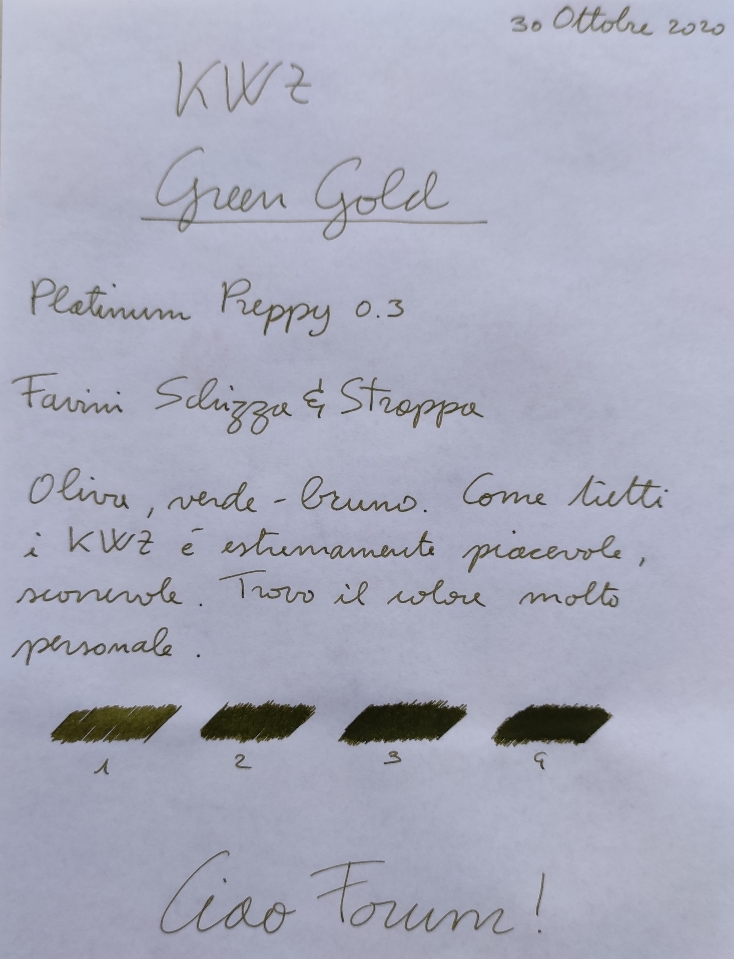 Concordo con Ghiandaia: è un inchiostro molto gradevole e piacevole da usare, anche per la sua tonalità verde oliva che scurisce in poco tempo. Mi piace molto (a dire il vero è proprio il marchio KWZ a piacermi in genere).