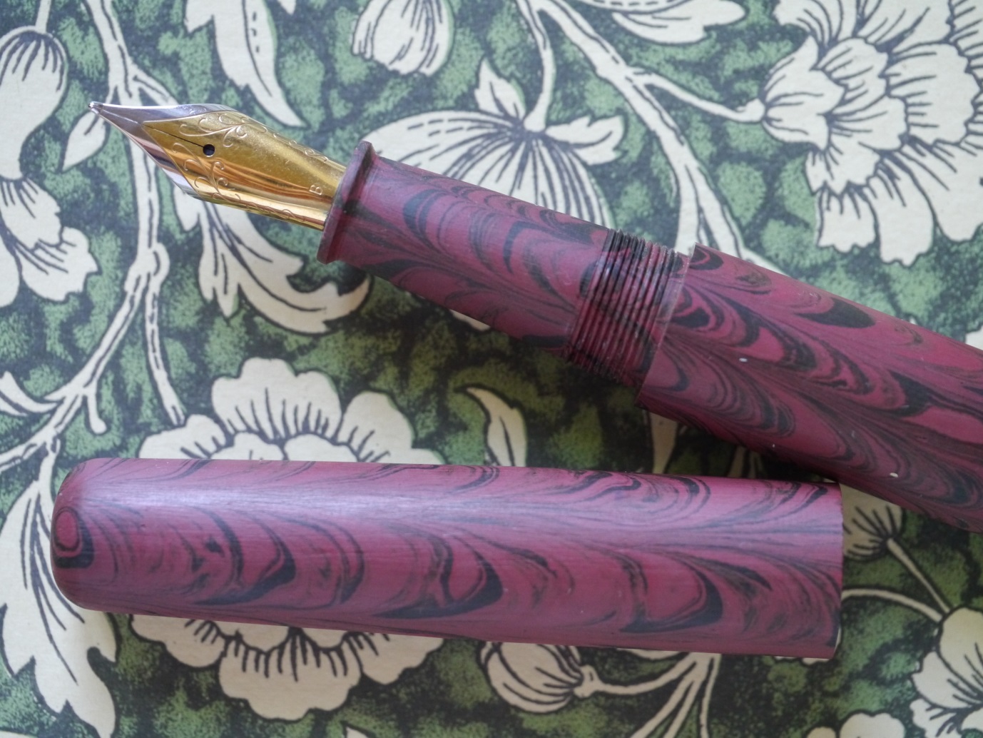 in particolare si tratta di una 4C in regular ebanite red ripple, finitura bakul, riempimento CC e pennino Jowo B