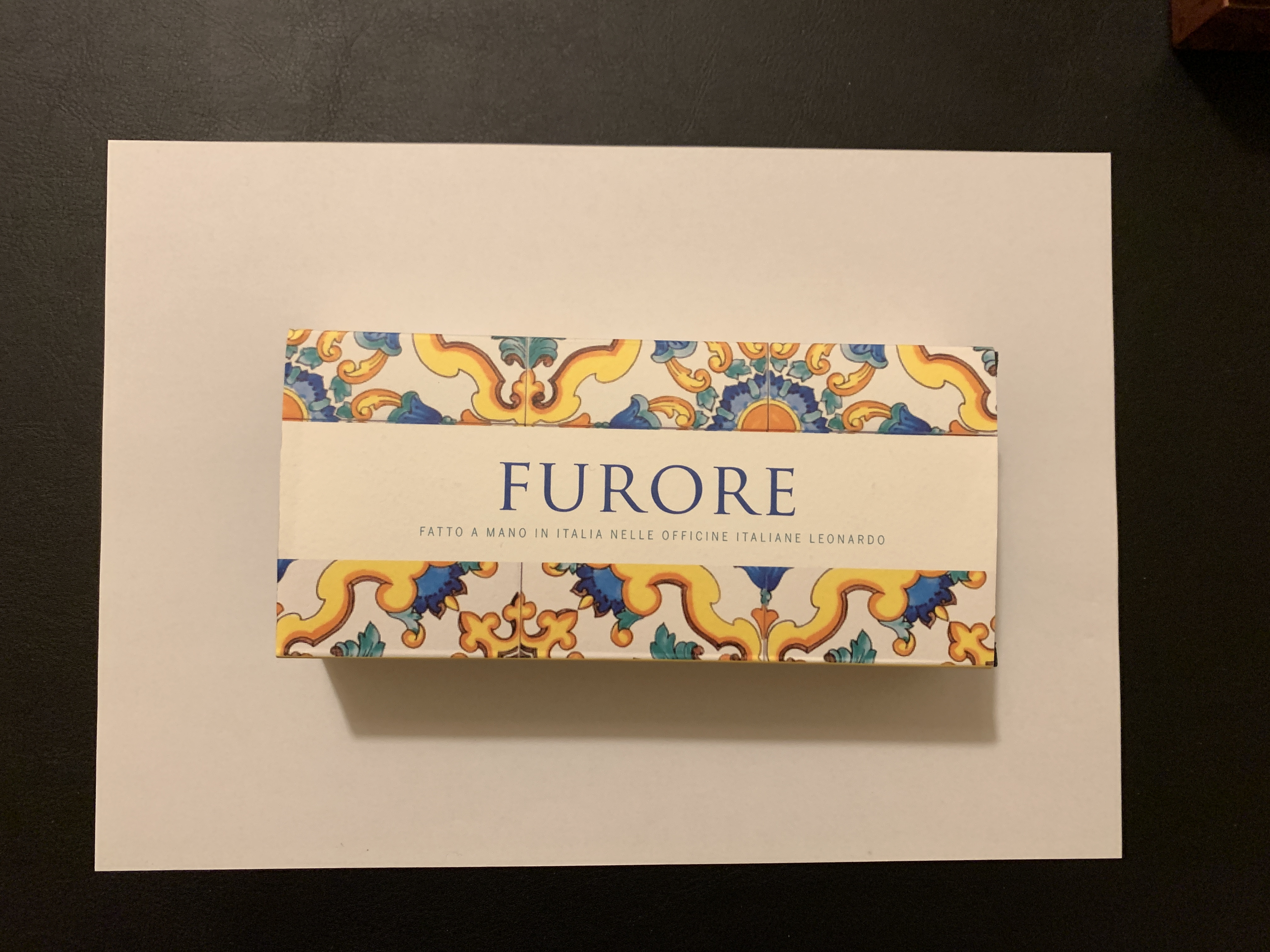 Partiamo dalla confezione, inizialmente fotografata accanto alla boccetta di Pilot Iroshizuku Kon Peki che ho intenzione di dedicare alla penna in questione. La scatola vera e propria è avvolta da due controscatole in cartoncino, una prima con una stampa personalizzata per il modello "Furore" e una seconda in nero opaco con stampato in nero il nome della ditta produttrice.