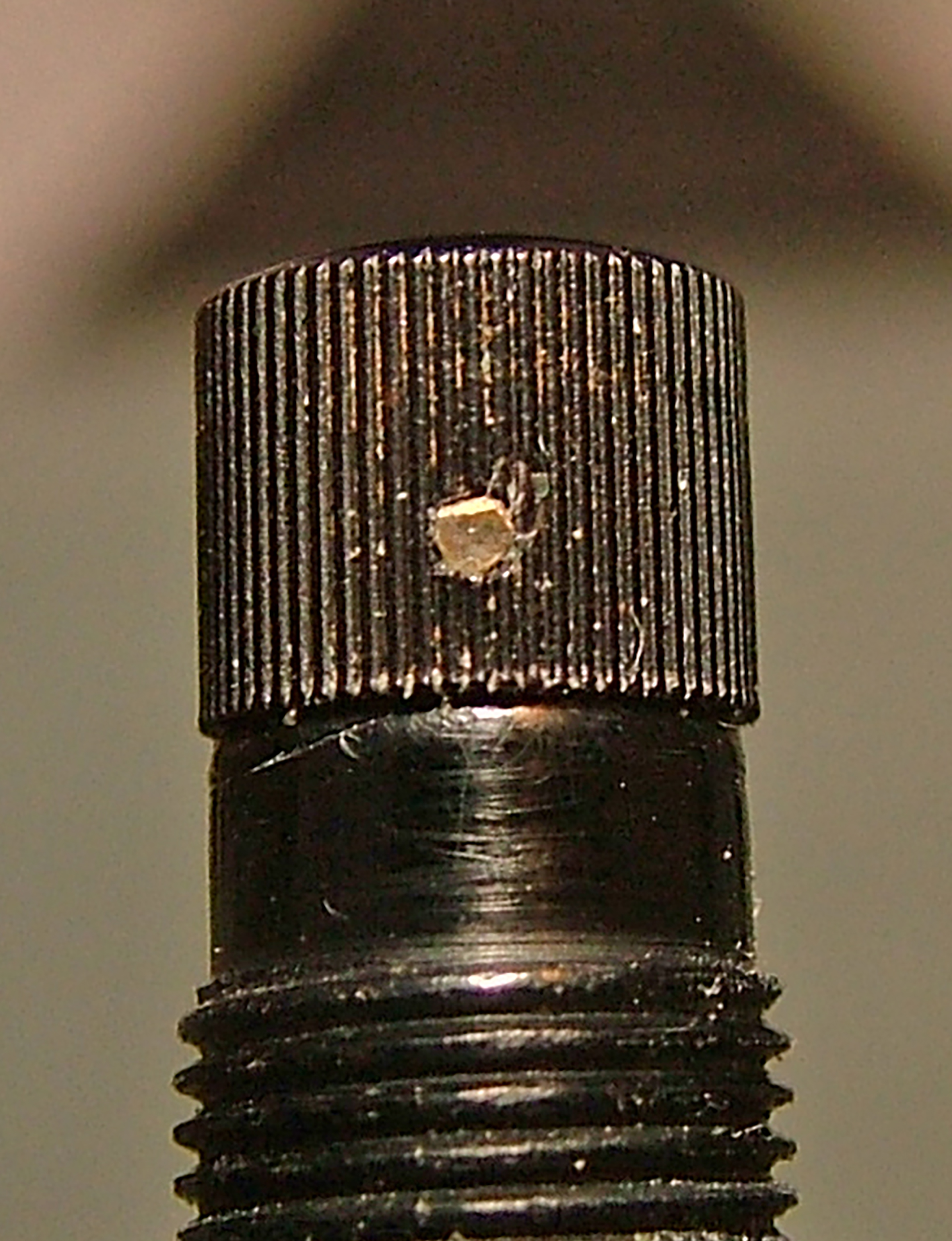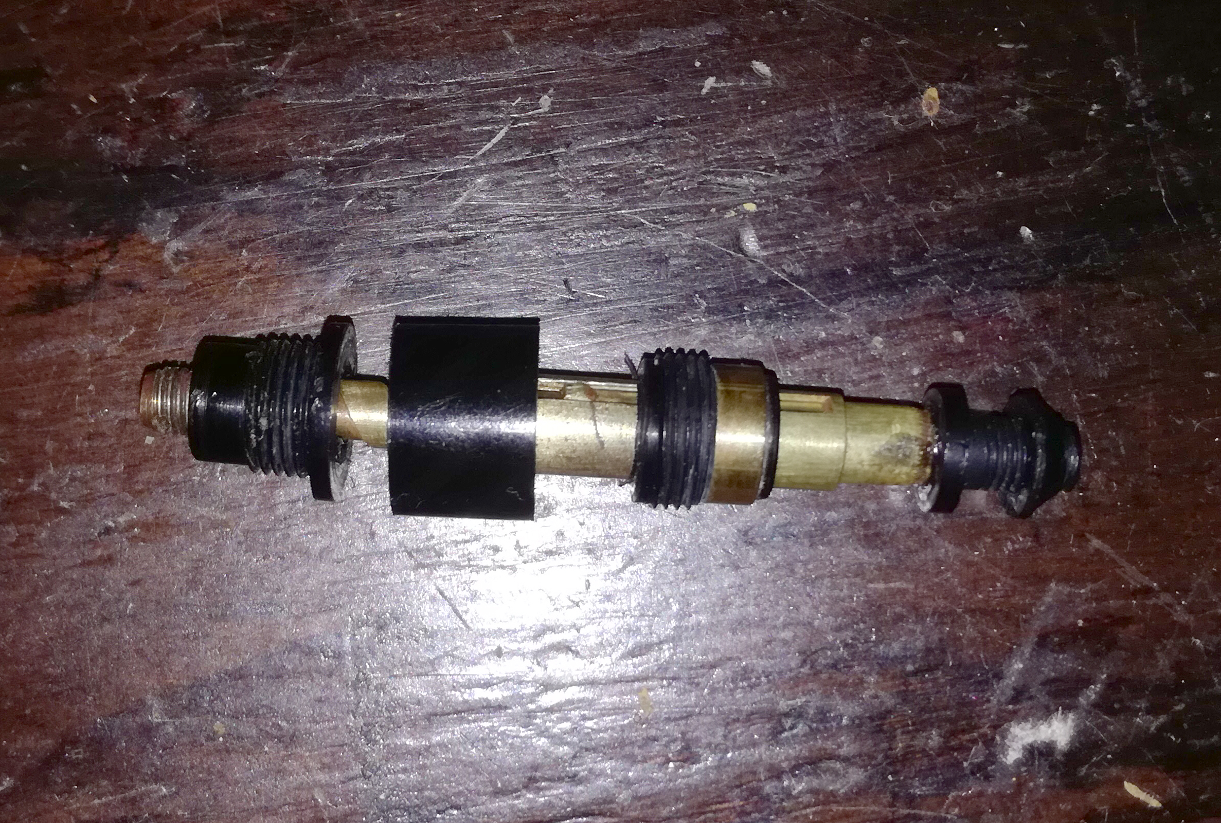 Dovevo trovare un cilindro più grande delle dimensioni della penna da riparare, ma con uno spessore tale che mi consentisse di scartavetrarne una parte senza assottigliare troppo la celluloide e che mi permettesse di saldarci la filettatura superiore ed inferiore del pezzo originale, il pezzo scelto è stato una parte del fusto dello stiloforo Omas. (foto 4)