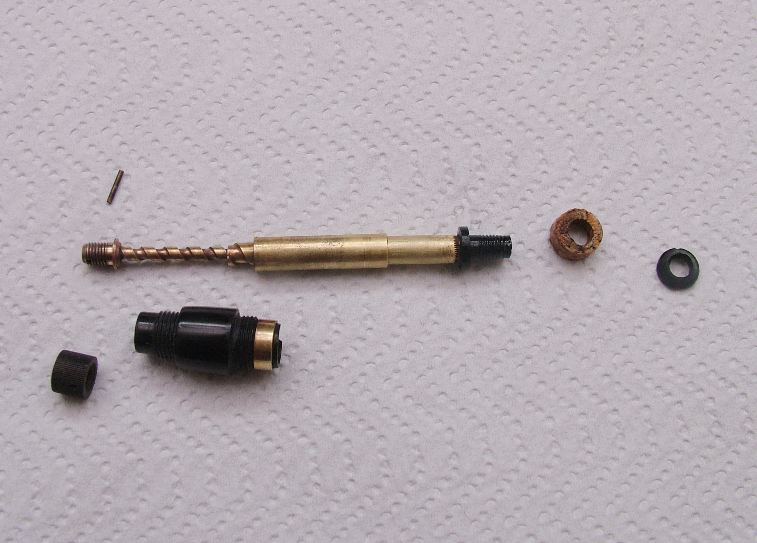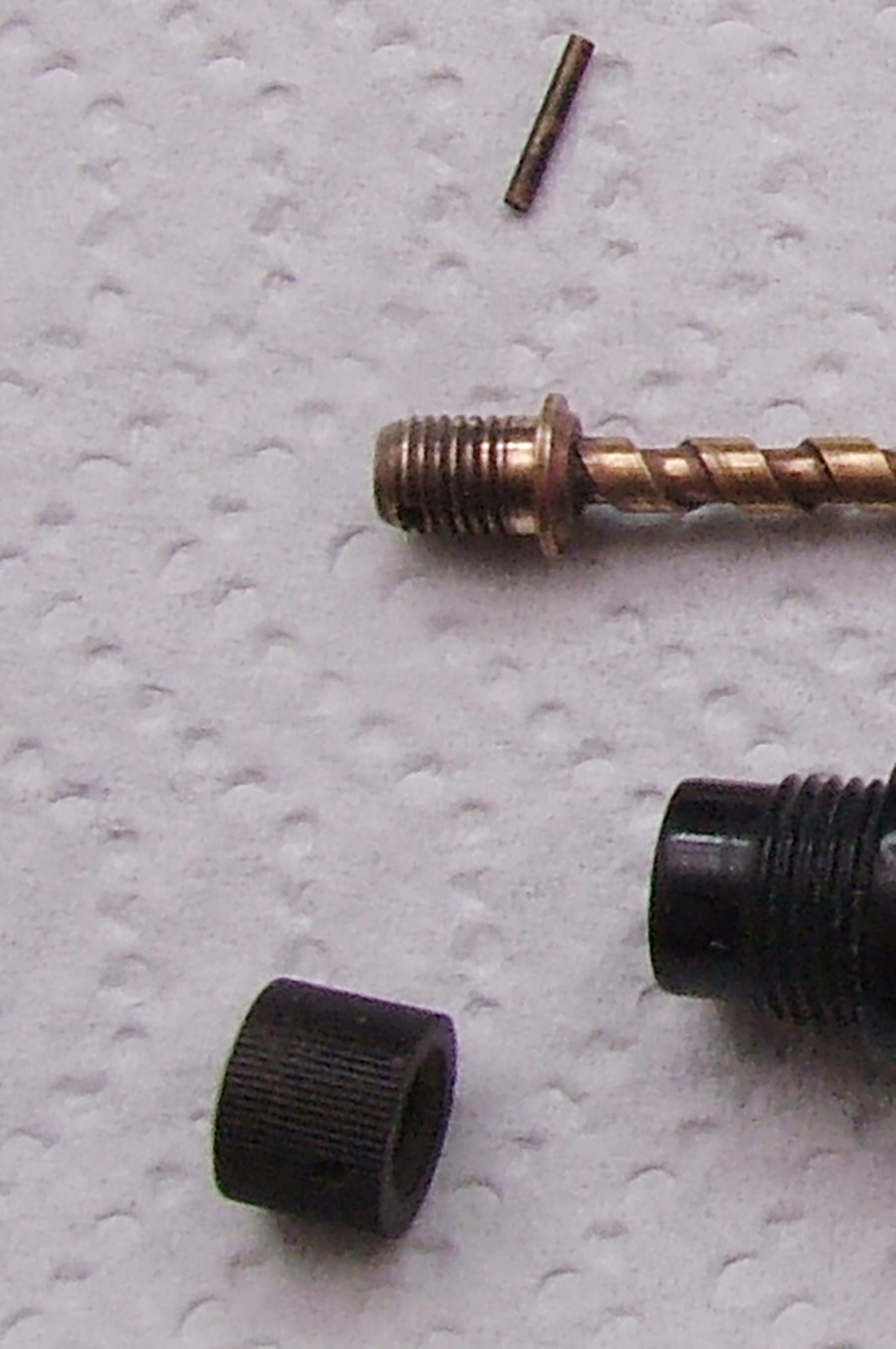 Per smontare quel che resta del pistone, bisogna levare la spinetta che fissa la manopolina di rotazione dell'albero telescopico del pistone , una volta estratta si svita la manopolina e si estrae l'alberino, che nel mio caso era ossidato e bloccato.(Foto 2 e 3)
