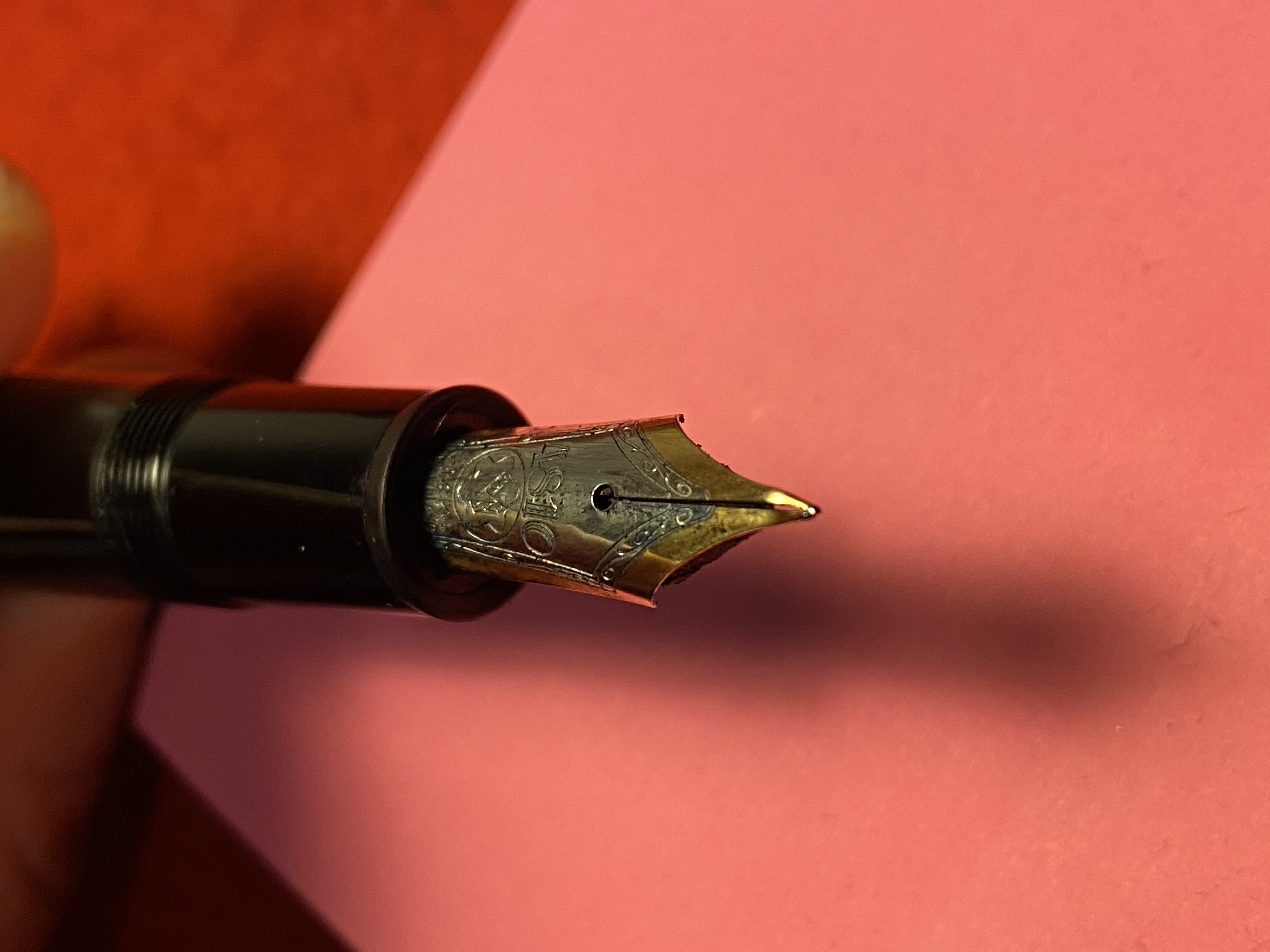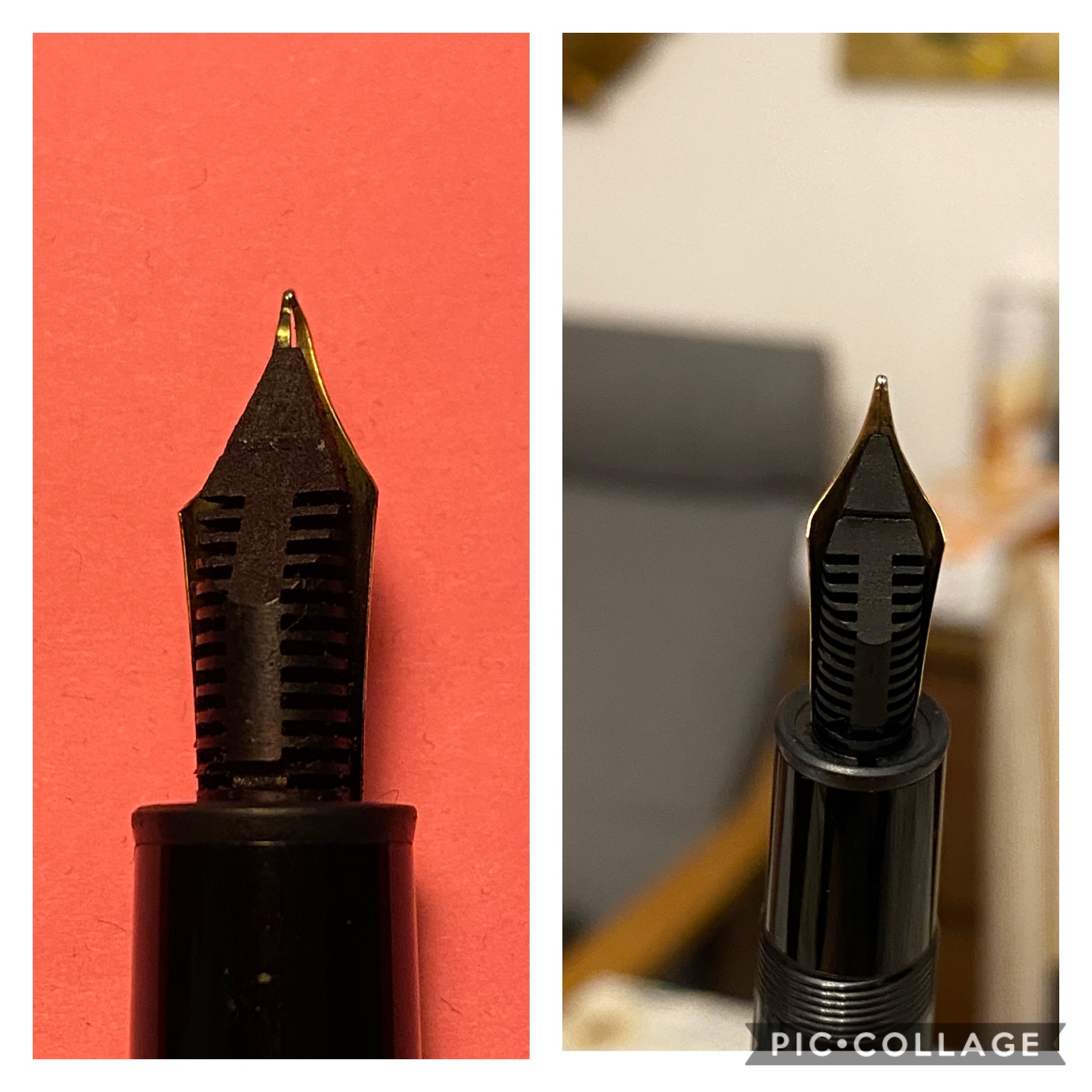 Come vedrete nelle foto il pennino è piegato “io dico non di tanto” L’ho fatta vedere in una bottega e mi è stato detto che non si può riparare, ma ho visto nel forum che alcune penne maggiormente danneggiate, hanno acquistato nuova vita e credo, spero, che si possa fare lo stesso.