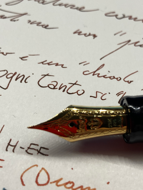 Il pennino è ovviamente la sua peculiarità: a mio parere è rigido, davvero molto rigido. Ma mi piace un sacco, perché scivola bene, anche se ogni tanto, non capisco perché, mi scappa un tratto più spesso, più carico di inchiostro.
