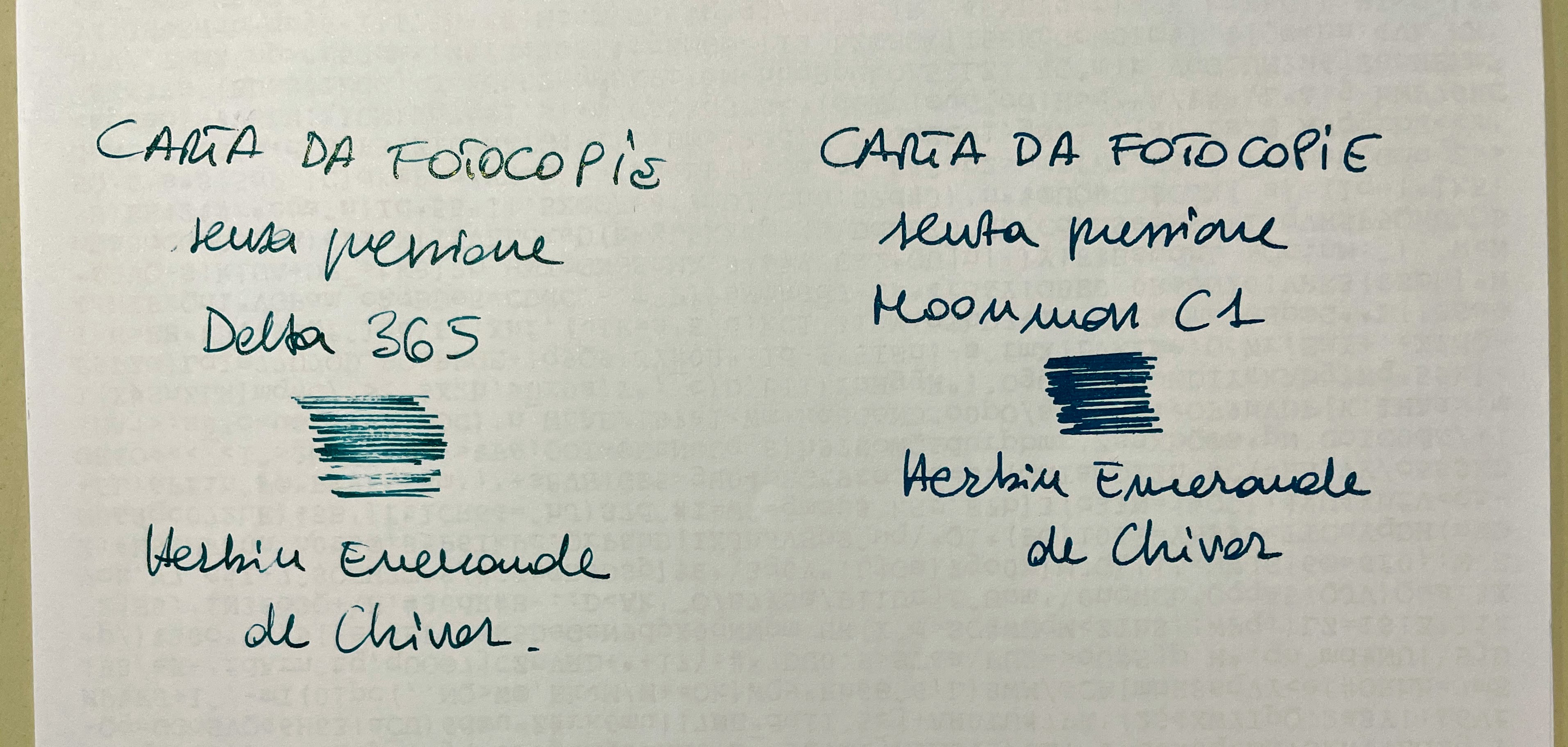 Carta da fotocopie perché è tipicamente molto permeabile, e non soffre del comportamento "patinato" che le carte più nobili hanno con certi inchiostri e pennini.stefanoc ha scritto: ↑martedì 23 febbraio 2021, 14:58 ... Metto una foto comparativa di scrittura su carta da fotocopia (come mail la carta da fotocopie GPMP ?) tra la Delta e la Moonman C1 che al momento è il mio riferimento in quanto a flusso abbondante e scorrevolezza, entrambe provate senza fare pressione.