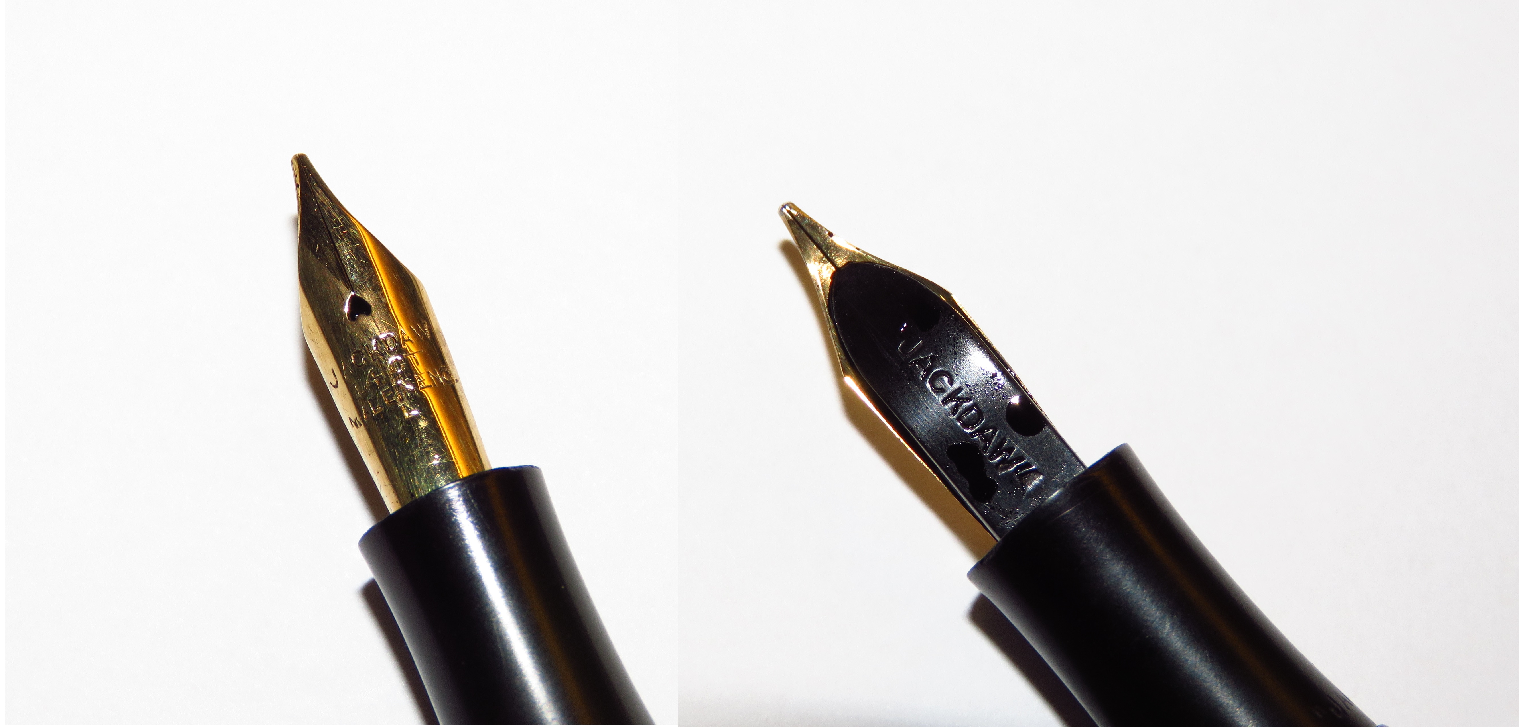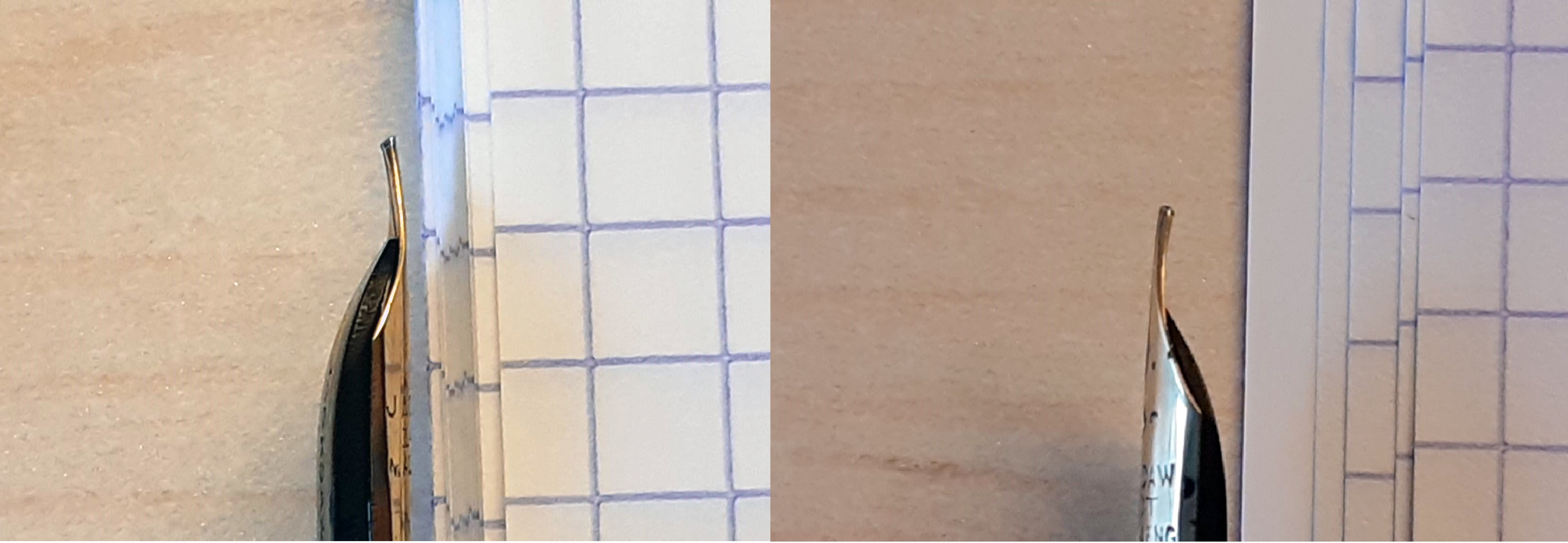 La premessa è che il pennino deve essere perfettamente a punto, non deve grattare perchè disallineato, deve avere un buon contatto con l'alimentatore e deve essere montato dritto sull'alimentatore stesso (non ruotato). Fare aggiustamenti successivi ai vari assetti comporta di nuovo il disallineamento dei rebbi ed il pennino probabilmente gratterà e scriverà di nuovo male.