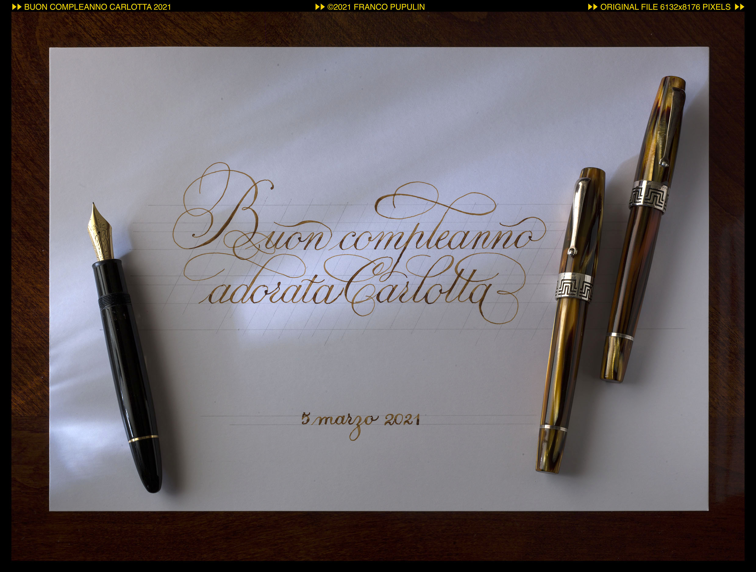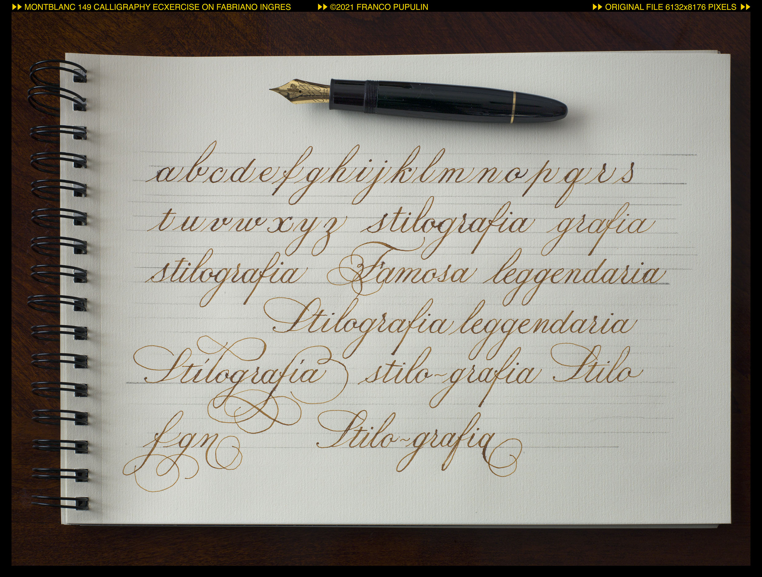 Con il pennino giusto e una mano allenata, entrano ancora in gioco altri fattori, come l’inchiostro e la carta. Qui vi allego un paio di immagini di scritte eseguite con la Calligraphy su carte che non uso quasi mai - sono troppo lisce e “burrose”per i mie gusti - ma che, evidentemente, si prestano molto bene per il lavoro calligrafico ed esaltano le caratteristiche sfumature dell’inchiostro. La prima è un cartoncino Bristol di Canson e la seconda la carta color crema di un blocco che possiedo da molti anni e che solo reca sulla copertina la scritta “Stilografica”, senza indicazioni del produttore.