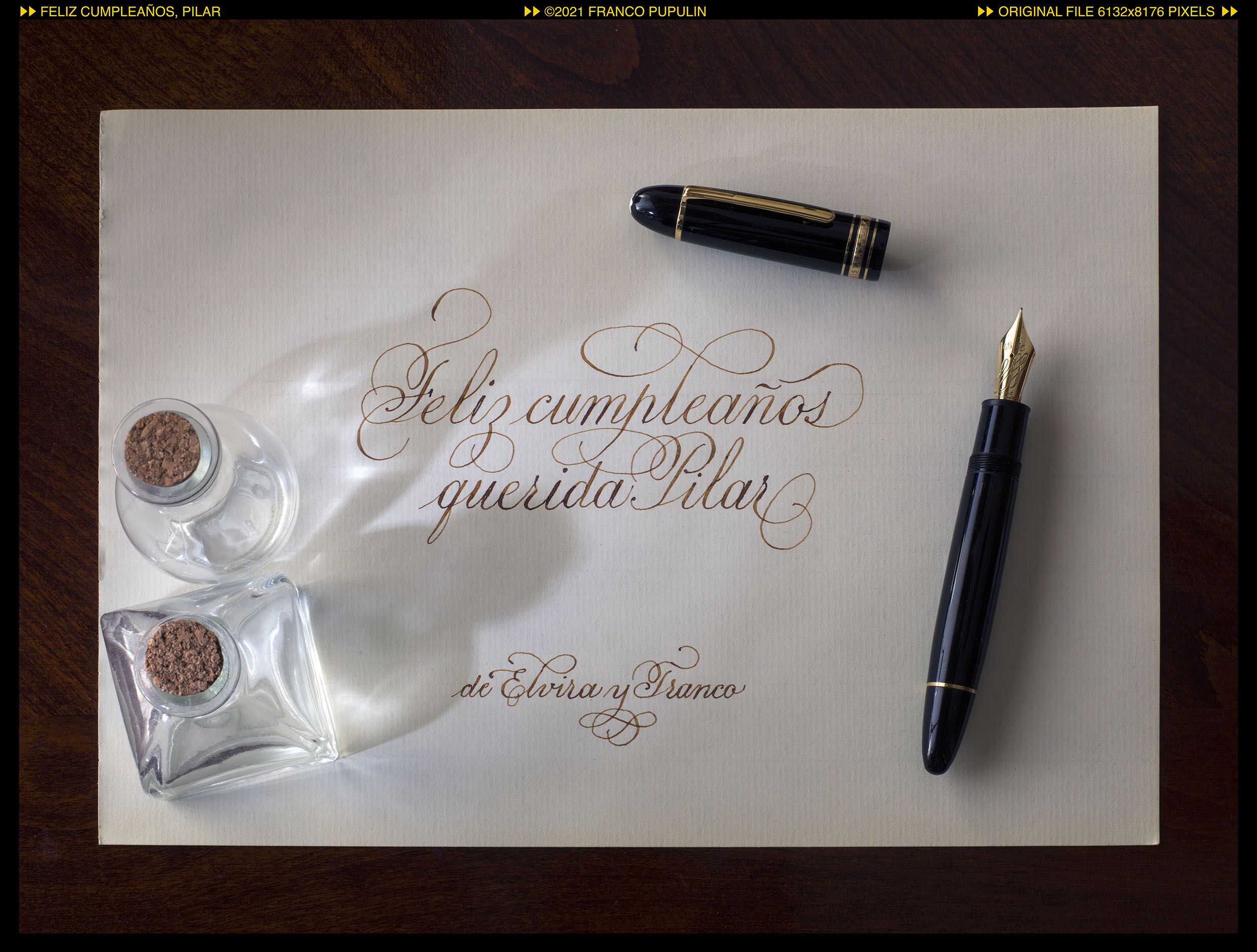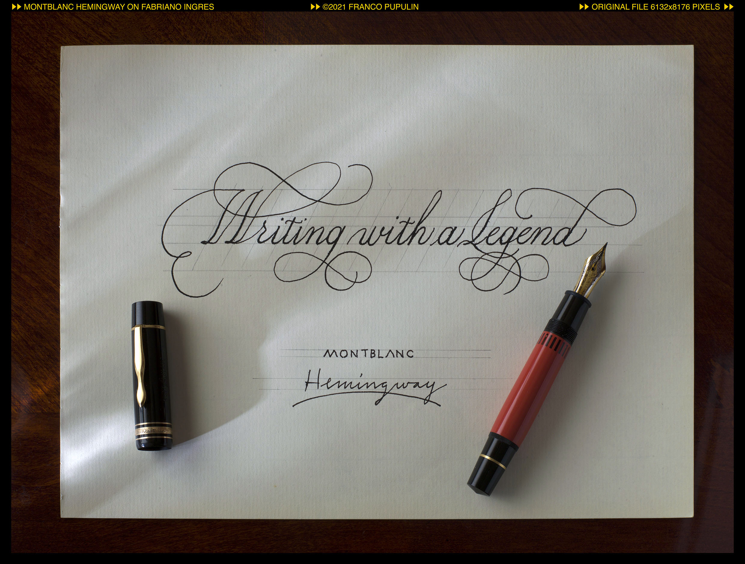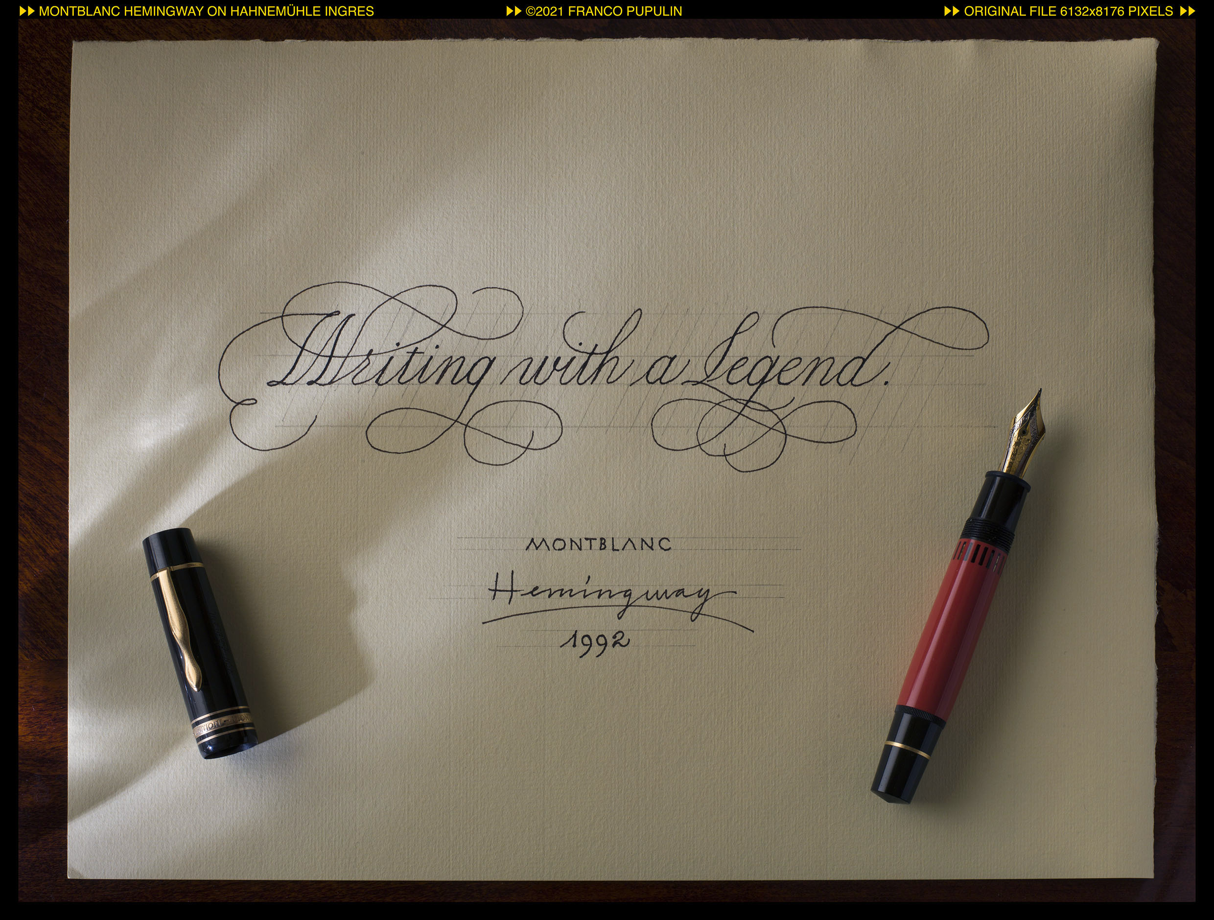 Lo farò usando queste due penne per scrivere, ”calligraficamente”, la stessa cosa. È una cosa che penso davvero: per ragioni un po’ diverse, entrambe le penne sono “leggende” nel mondo della stilografica. Quello che presento non è, comunque, un test, perché le due penne usano inchiostri diversi: Diamine Golden Brown nella Montblanc Calligraphy e Rohrer & Klingner Sepia nella Hemingway. Sono entrambi inchiostri ben lubrificati ma, forse, non comparabili tra loro.