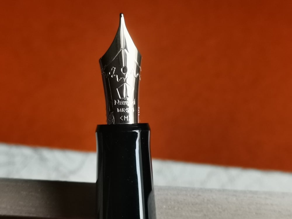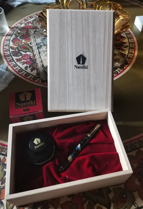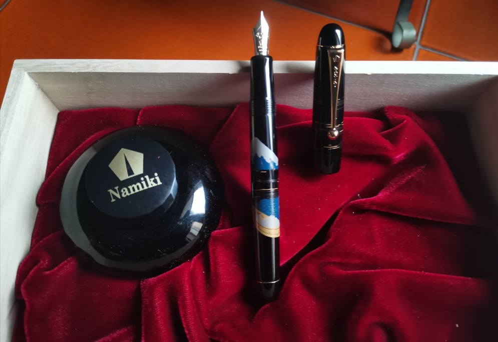 La Namiki qui fotografata ha un ottimo pennino M, che scrive in maniera scorrevole. Ha un bel disegno che rappresenta il Monte Fujiyama e una barca con pescatori. Ispirazione dai dipinti ukiyoe. La confezione con cui viene offerta è una tradizionale confezione regalo in legno (insieme a una confezione d’inchiostro).
