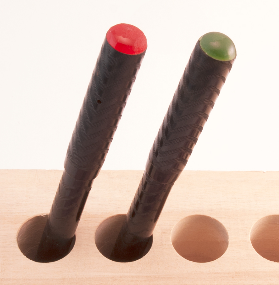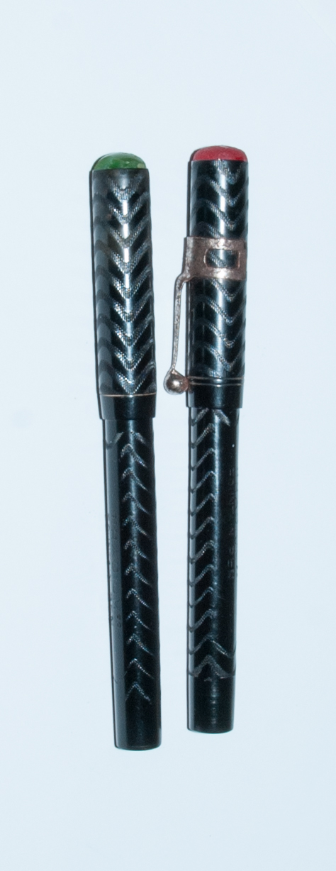 Non sono del tutto identiche: a parte le testine dei cappucci di colore differente, una delle due ha una serie di scanalature sulla sezione, ma si tratta di sottili cerchi sovrapposti, per cui non serviva ad avvitare il cappuccio, ma probabilmente a facilitare la presa durante la scrittura. L'altra ha la sezione liscia. Alla base dei cappucci c'è una lieve scanalatura circolare, singola in uno e doppia nell'altro. Il fatto che non siano identiche mi fa immaginare una produzione semi-artigianale.