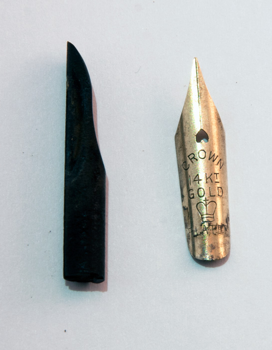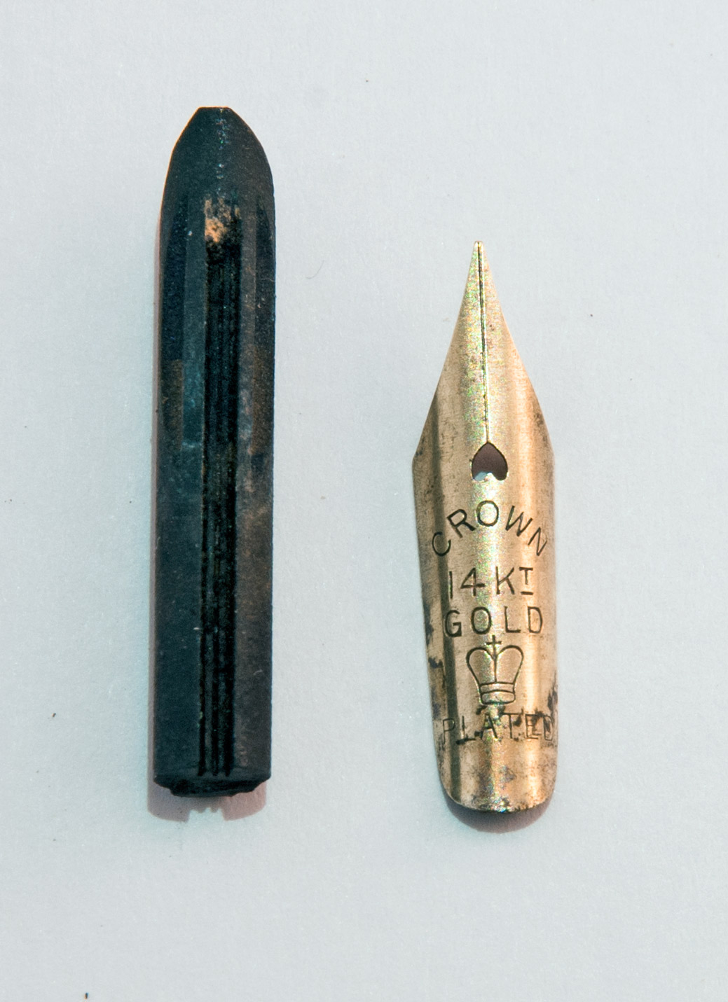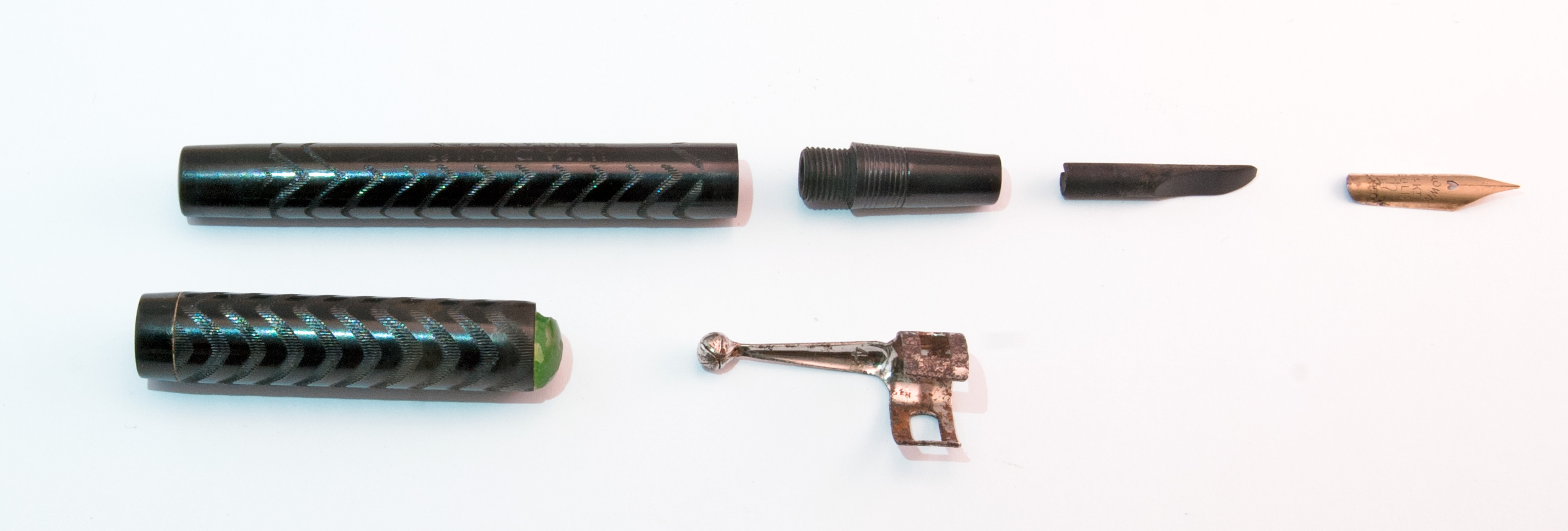 Ho cercato senza successo qualche informazione sulla marca, ma a quanto pare la "RADIUM" fountain pen ha fatto il possibile per far perdere le tracce della sua esistenza. Le due penne, a contagocce, sono molto simili alle Waterman d'inizio Novecento. Considerata l'età, direi siano ben conservate: l'ebanite è lucida, nerissima, le incisioni ben scolpite. Le sezioni si svitano agevolmente e il serraggio al fusto è ottimale in entrambe. Le parti che hanno evidenti segni del tempo sono i due "gioielli" - uno verde l'altro rosso - alla sommità dei cappucci. Hanno abrasioni, e quello verde è scagliato su un lato. I fermagli sono ossidati. Uno dei due conduttori è rotto - ne manca un pezzo! - l'altro invece sembra in buono stato, mentre i due pennini, in metallo placcato oro, sono decisamente da pulire da sporco e incrostazioni di inchiostro. Si tratta di due pennini "CROWN" 14K Gold plated, ed è presente il classico simbolo della corona.