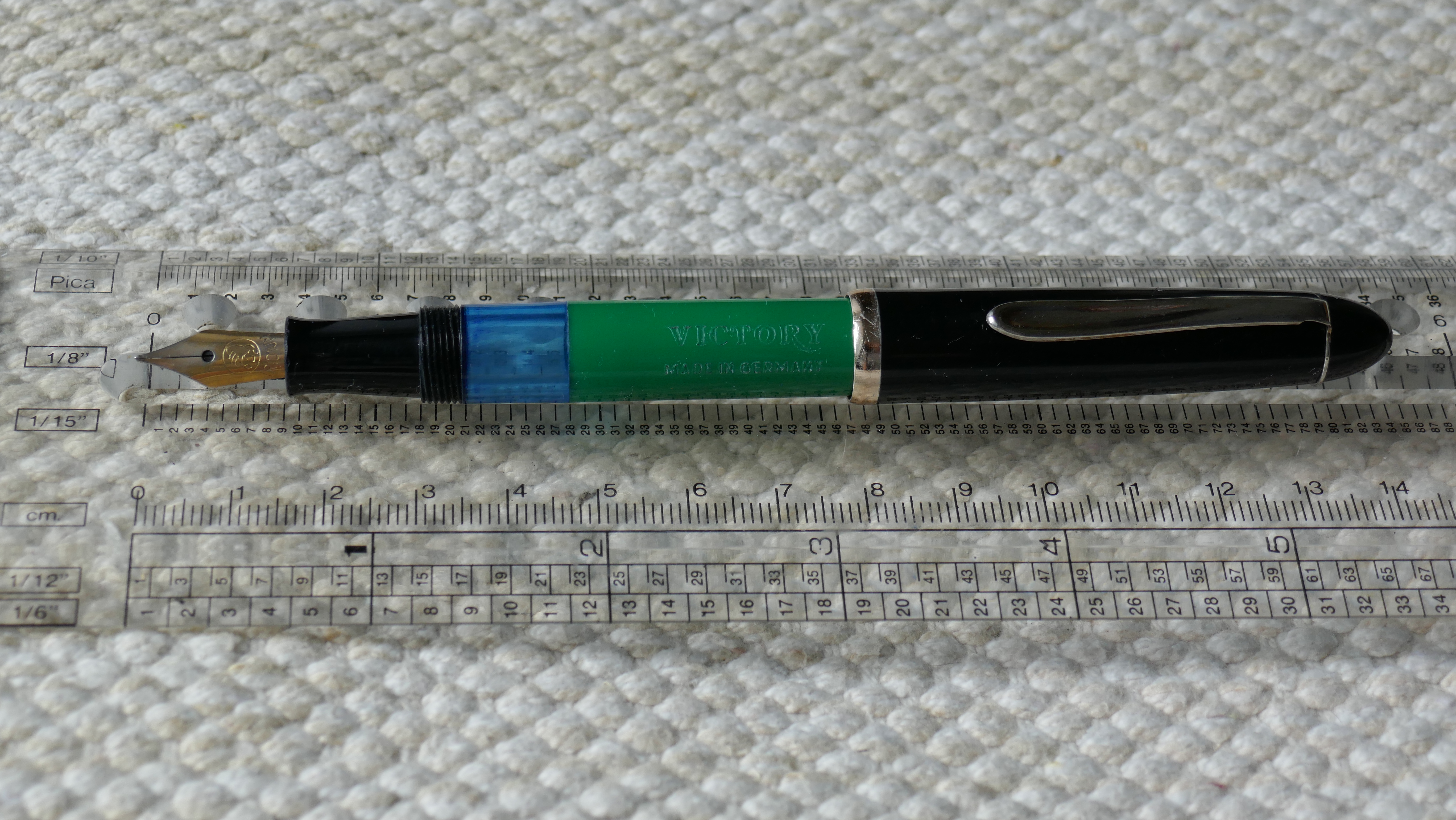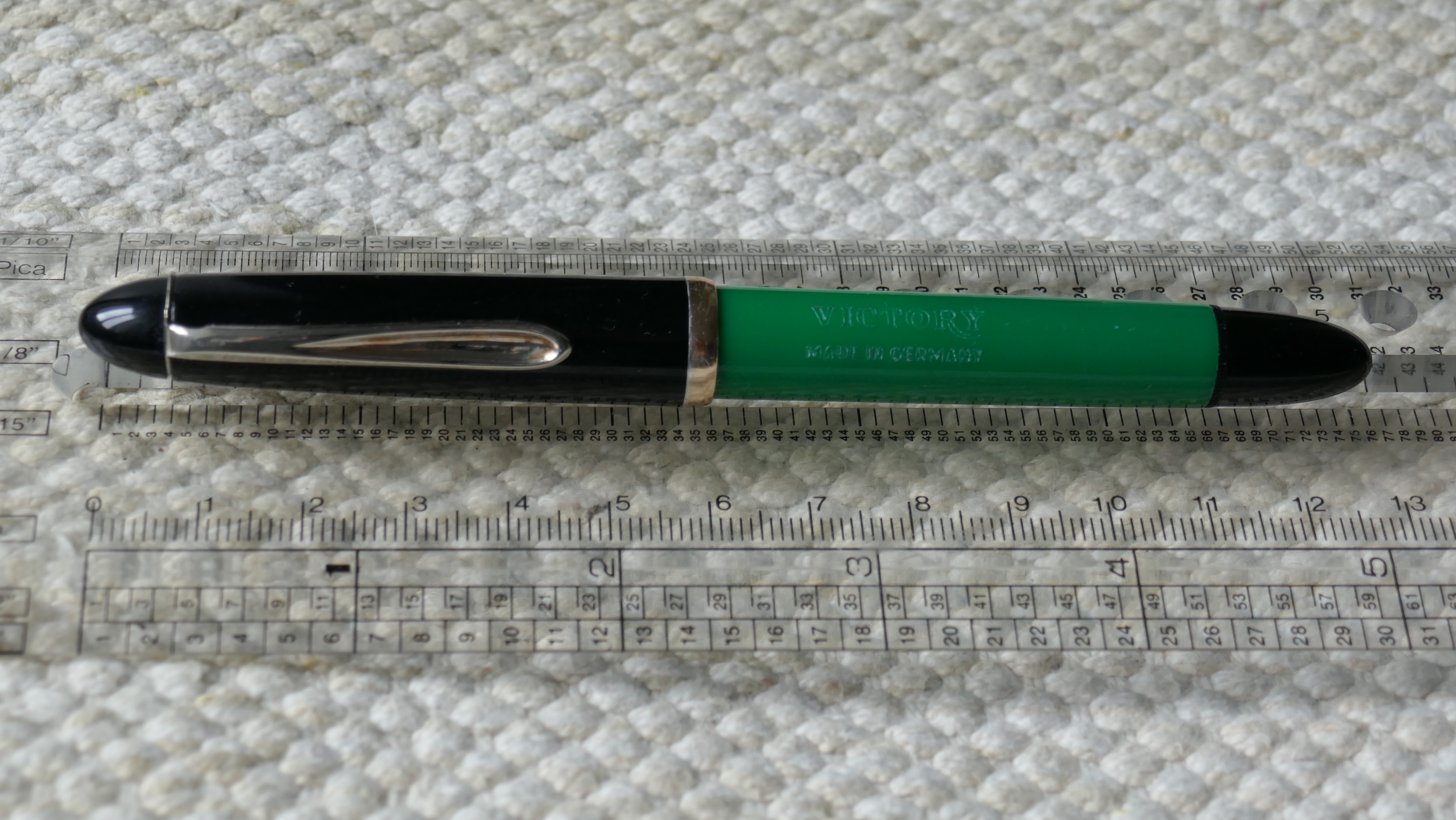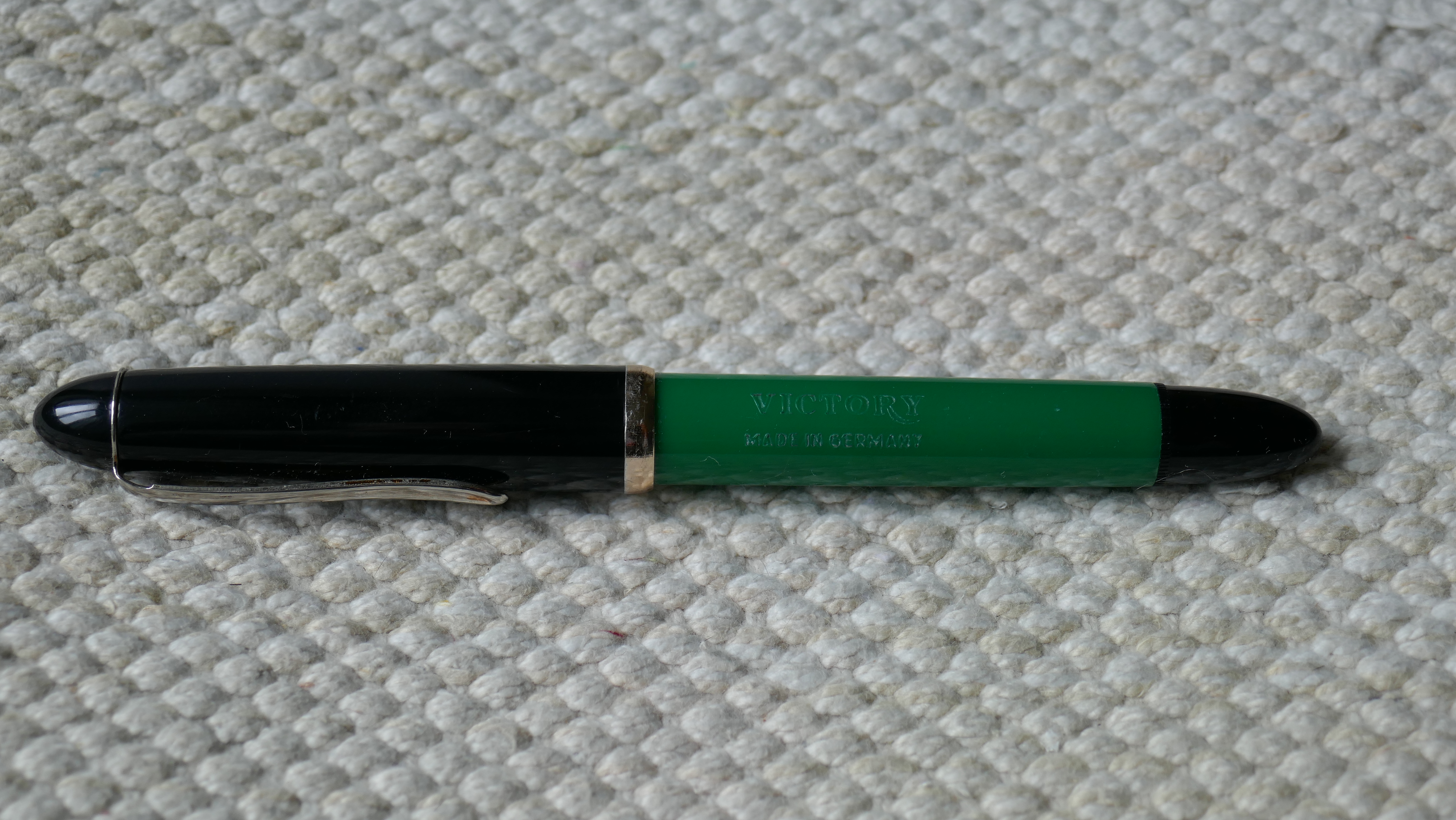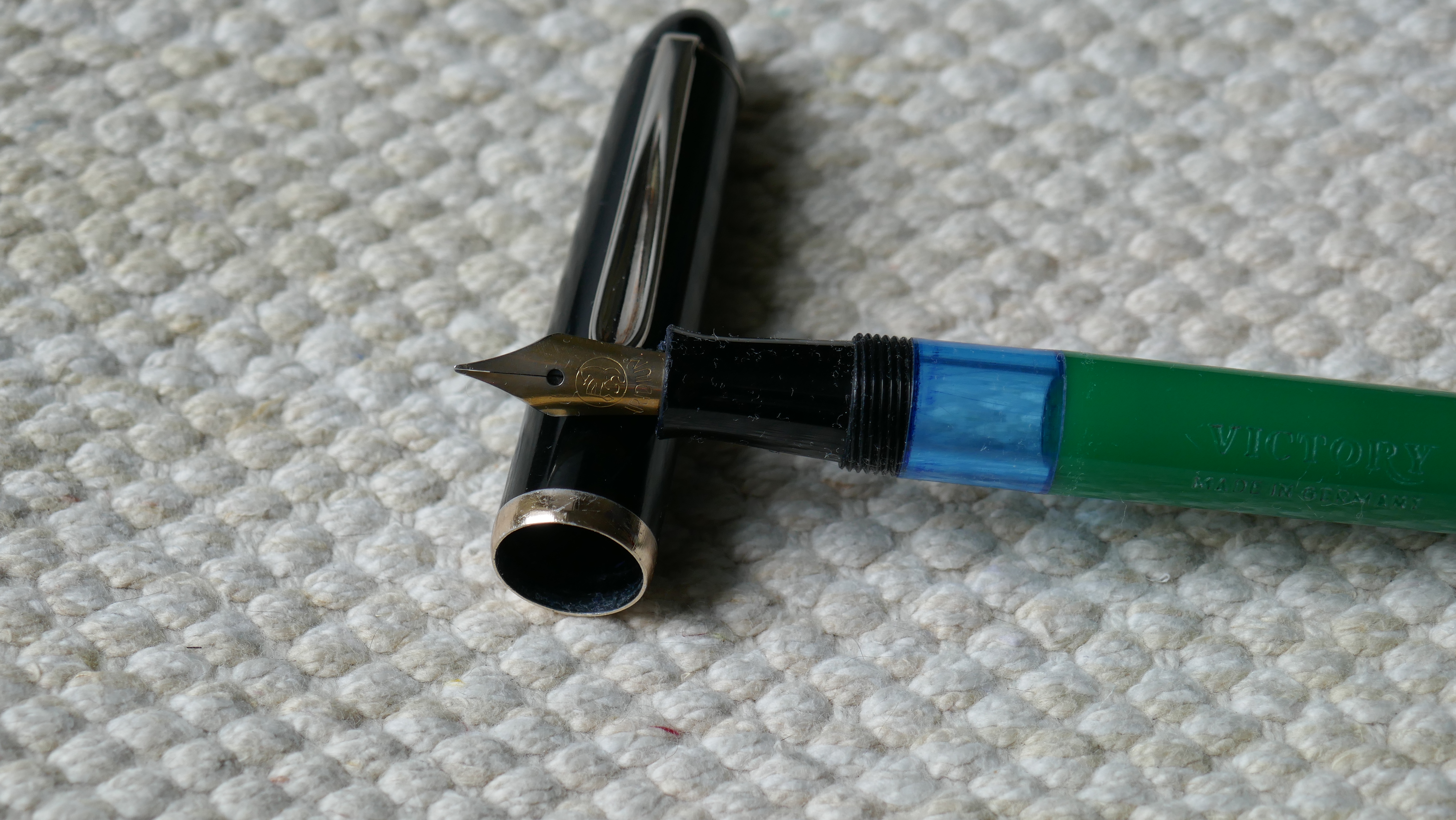 La Victory è stata una casa tedesca (così è scritto sul fusto), di cui non si sa molto, ma che ancora oggi riusciamo a trovare con campioni di stilografiche scolastiche. In particolare oggi parliamo di un esemplare mai usato e ispirato assai chiaramente alla Pelikan M 120, un modello fabbricato tra il 1955 e il 1965 e successivamente tra il 1973 e il 1977. Le plastiche, il conduttore e il pennino non denunciano il minimo segno di inchiostro. Caricamento a pistone. Chiaramente una scolastica, penso anni ‘60, provvista di caricamento a stantuffo, tappo a vite e un pennino Dauer Feder 4 (assai comune all'epoca), lungo due centimetri, leggermente elastico (non flessibile), ma che ci regala un’ottima impressione di scrittura e affidabilità. Una stilografica robusta, dotata di tutte le ottime caratteristiche di una penna scolastica.