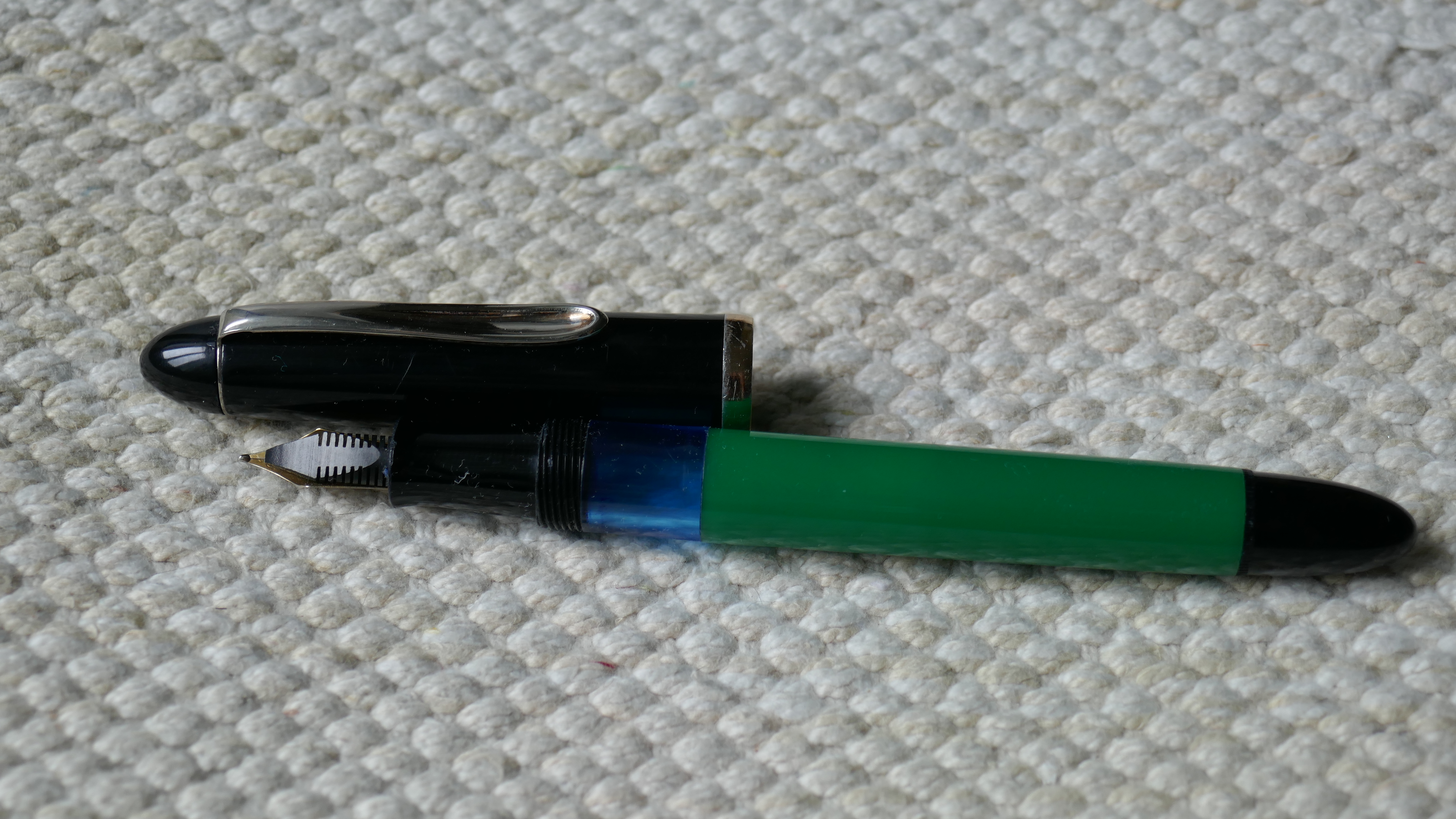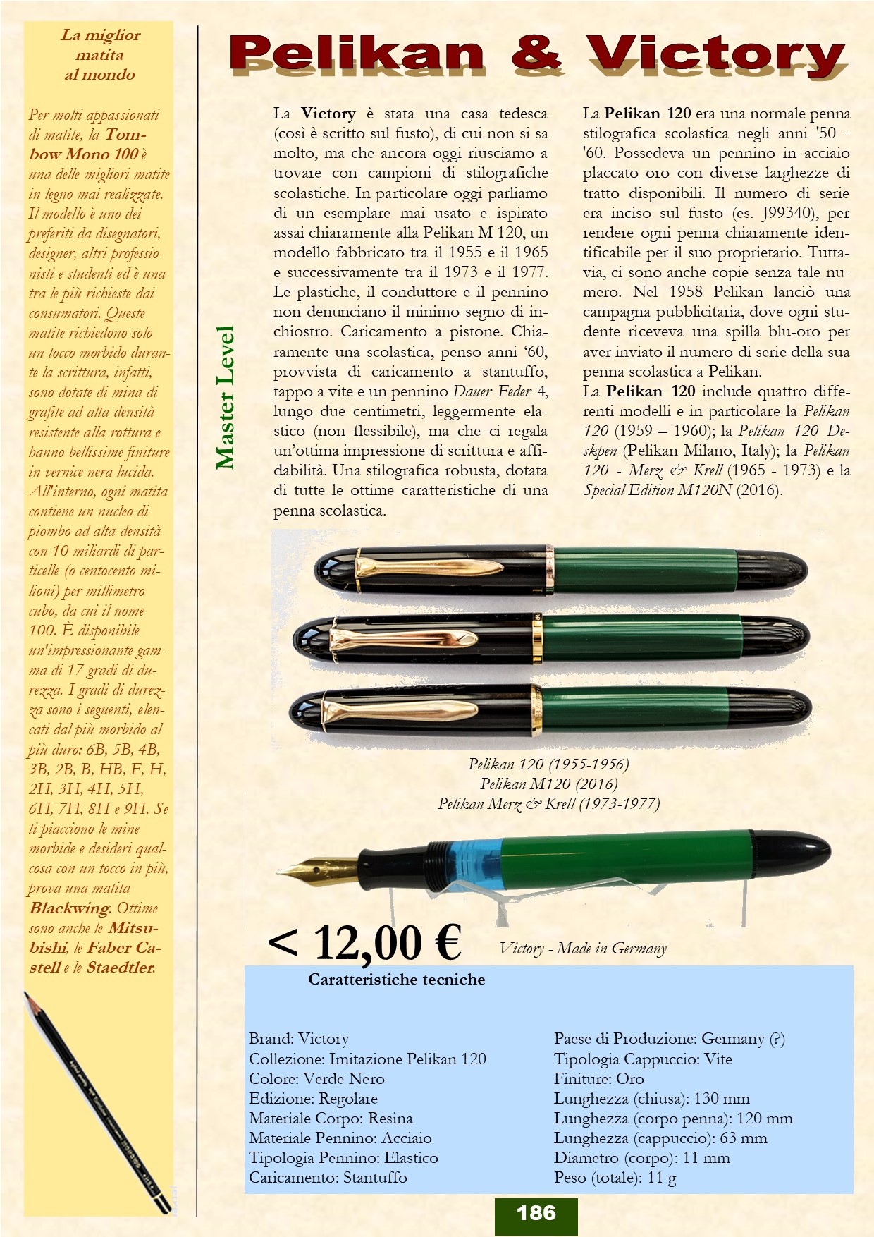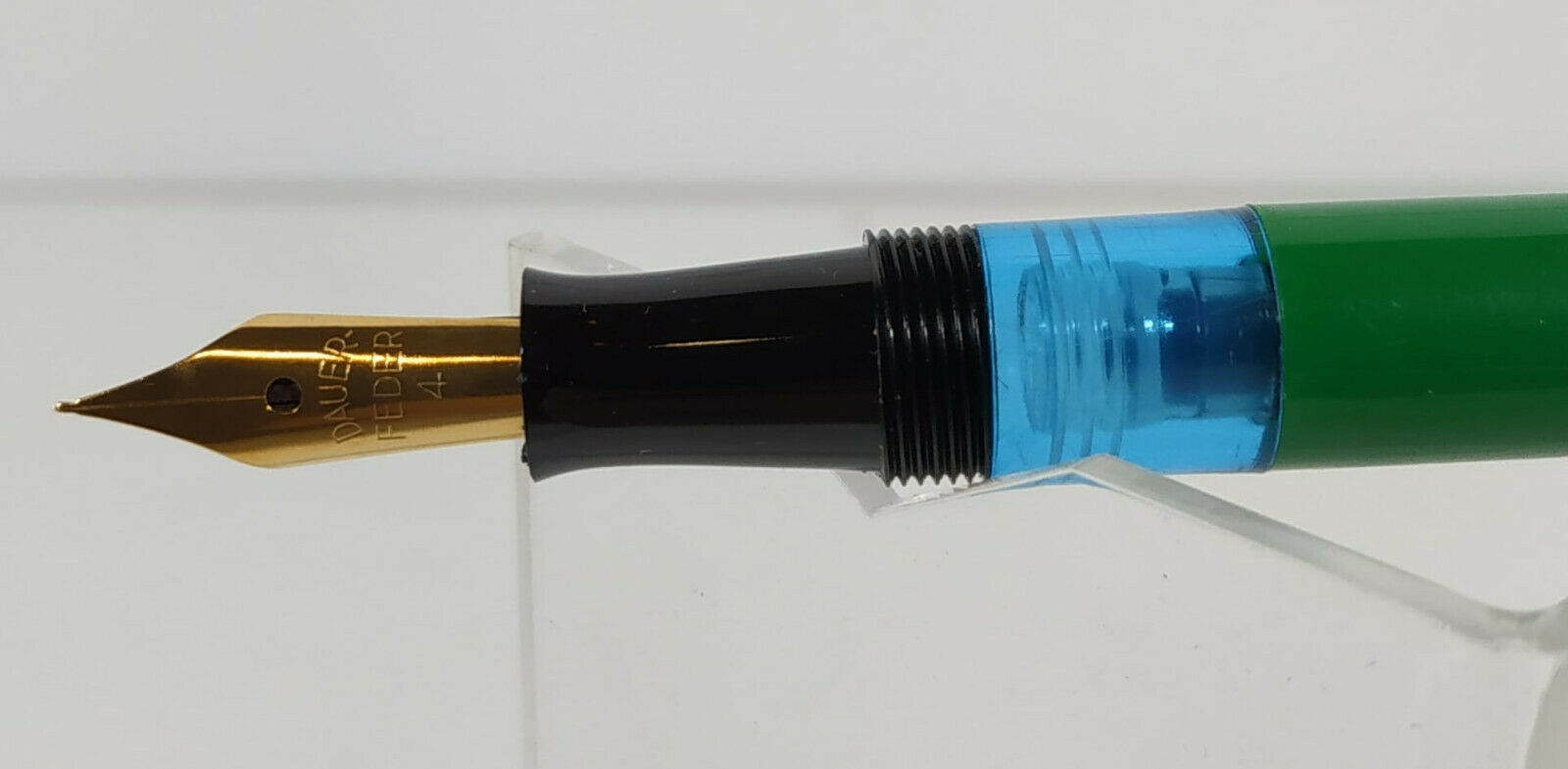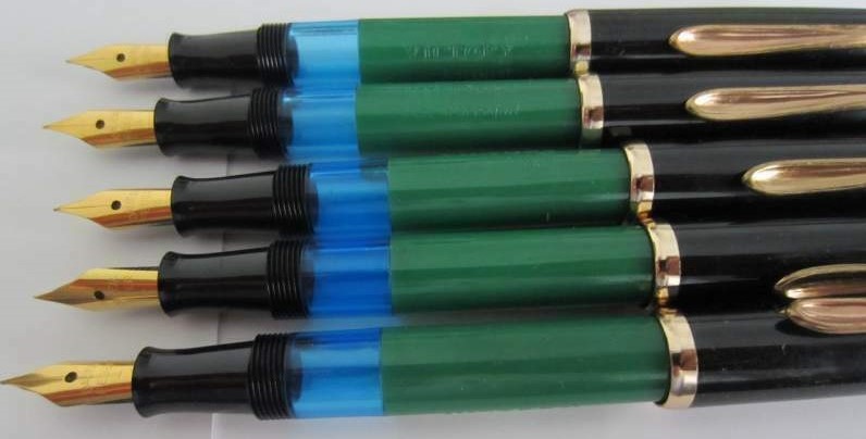 La Victory è stata una casa tedesca (così è scritto sul fusto), di cui non si sa molto, ma che ancora oggi riusciamo a trovare con campioni di stilografiche scolastiche. In particolare oggi parliamo di un esemplare mai usato e ispirato assai chiaramente alla Pelikan M 120, un modello fabbricato tra il 1955 e il 1965 e successivamente tra il 1973 e il 1977. Le plastiche, il conduttore e il pennino non denunciano il minimo segno di inchiostro. Caricamento a pistone. Chiaramente una scolastica, penso anni ‘60, provvista di caricamento a stantuffo, tappo a vite e un pennino Dauer Feder 4 (assai comune all'epoca), lungo due centimetri, leggermente elastico (non flessibile), ma che ci regala un’ottima impressione di scrittura e affidabilità. Una stilografica robusta, dotata di tutte le ottime caratteristiche di una penna scolastica.
