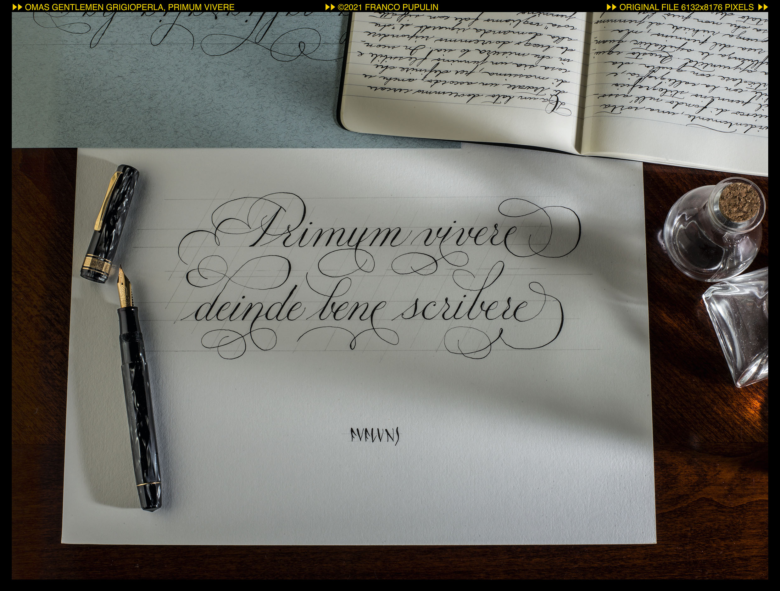 Io, però, non sono principalmente interessato a “fare calligrafia“ nel migliore dei modi: io voglio semplicemente usare gli oggetti che mi sono cari, le mie penne stilografiche, per scrivere in bella grafia! L’accento, qui, è sulla penna stilografica. Quando finisco una delle mie operette imperfette, mi compiaccio di fotografare il risultato accanto alla penna stilografica che lo ha realizzato. La primadonna, per me, è la penna!