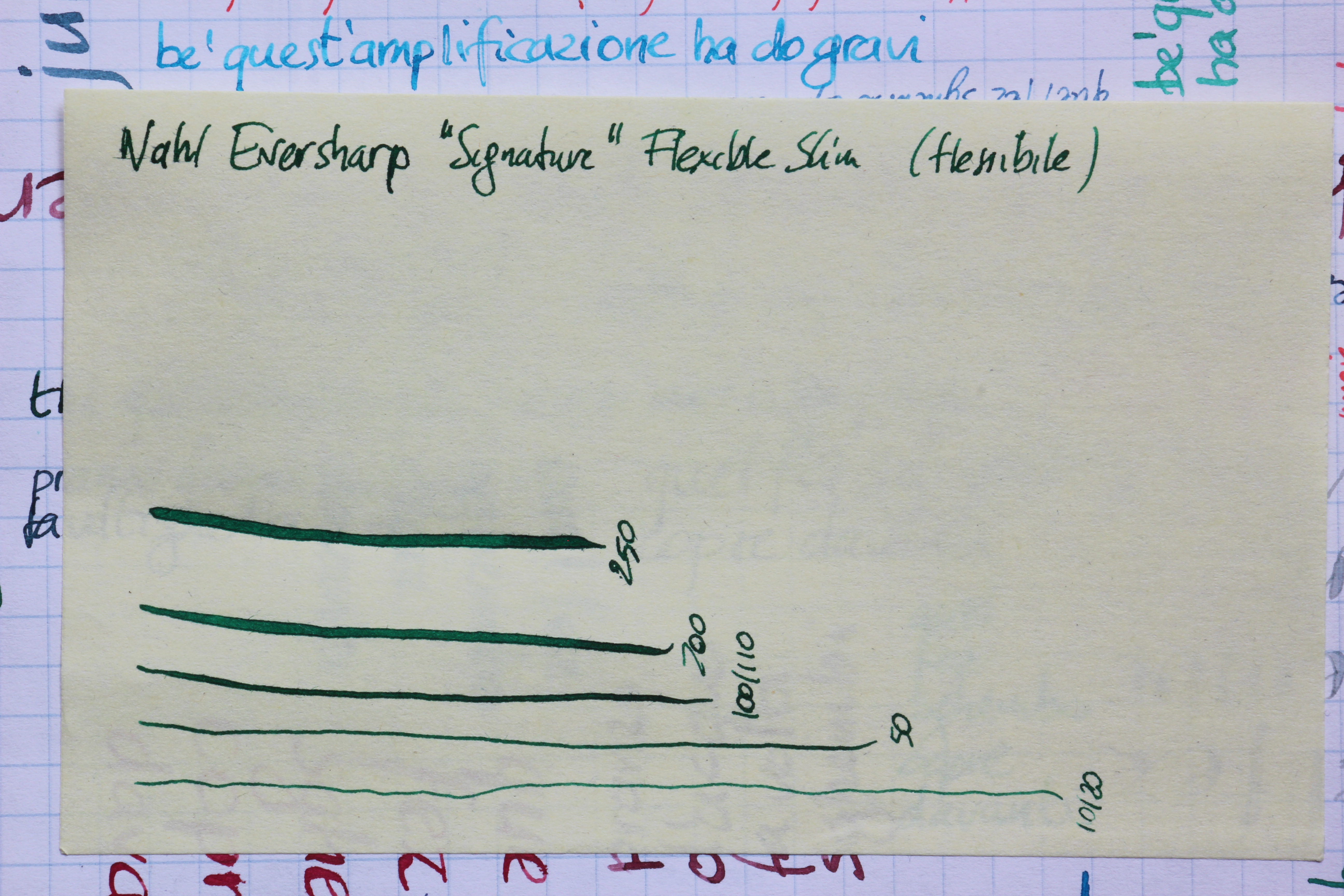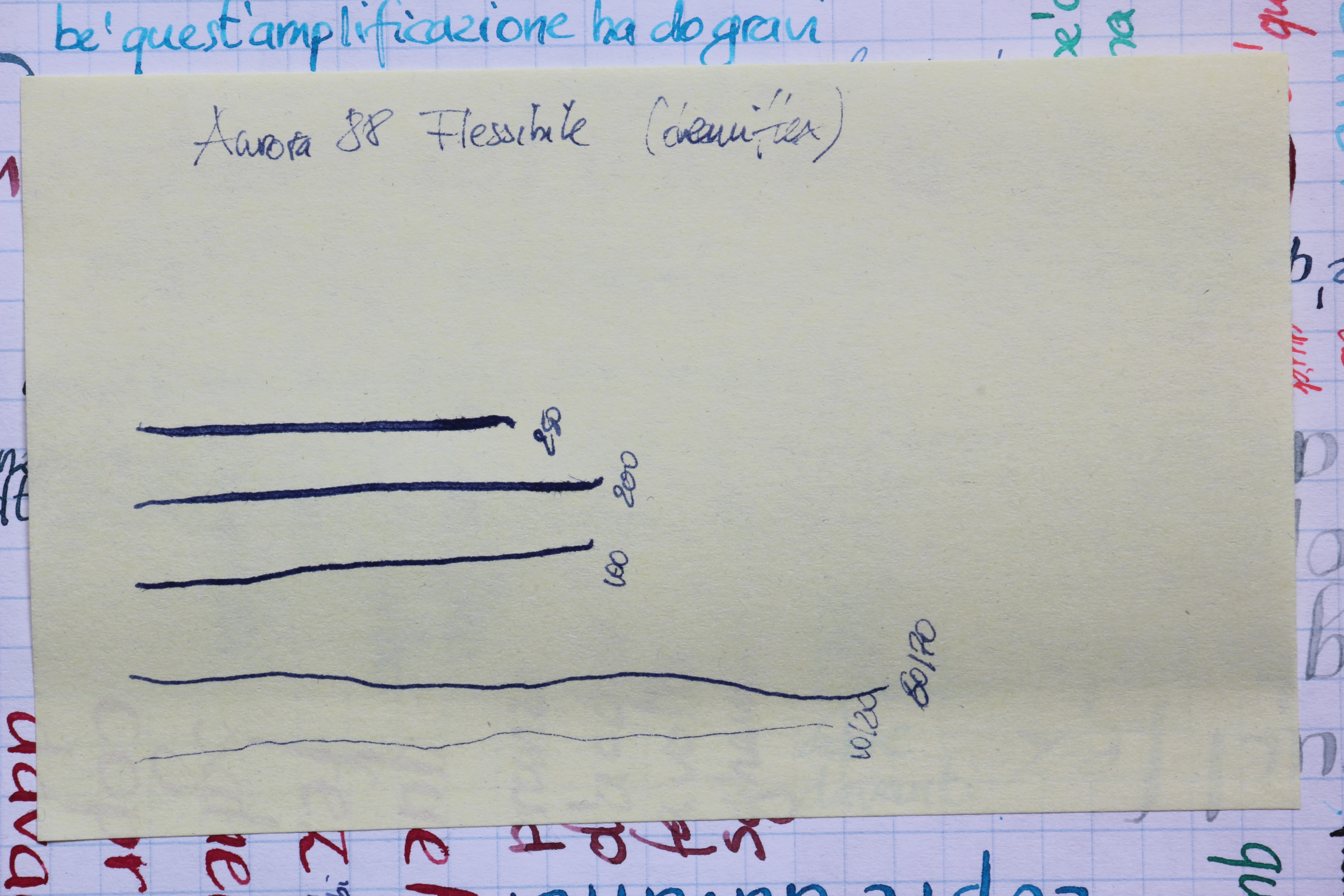 Nell’ultima fotografia di questo lungo intervento vi mostro quello che, a mio avviso, é lecito attendersi in questo senso da un pennino effettivamente flessibile, in gradazione fine o finissima.