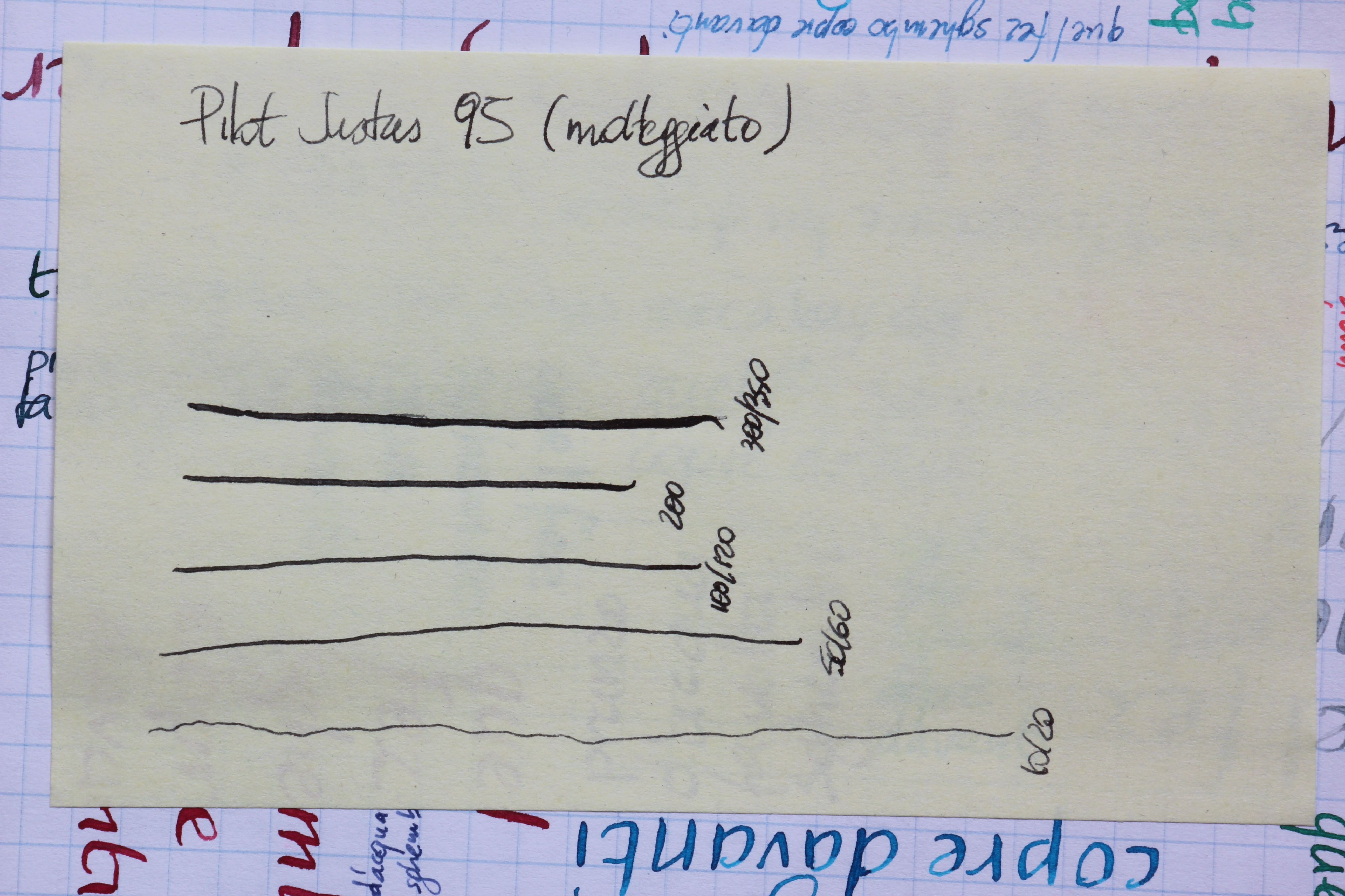 Nelle due ultime linee ho voluto far notare come un pennino realmente extra-fine possa produrre una certa variazione visibile in una riga più sottile (2,7 mm) di quella necessaria perché sia apprezzabile la sottile variazione di un pennino fine (altezza della riga = 3,2 mm).