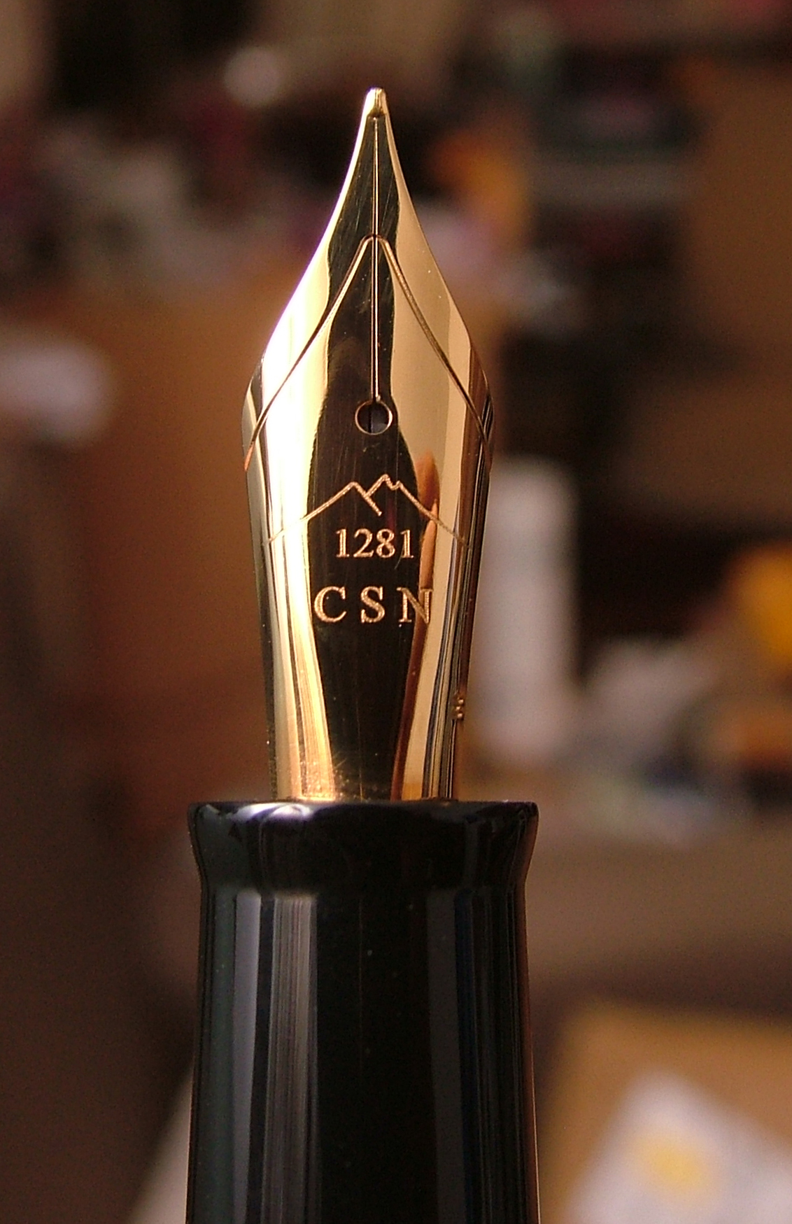 Penna a pistone ricavata da barra piena, con incisione sul fusto del CSN,  sul pennino oltre CSN è presente   il nostro simbolo "il vesuvio" e la sua altezza.