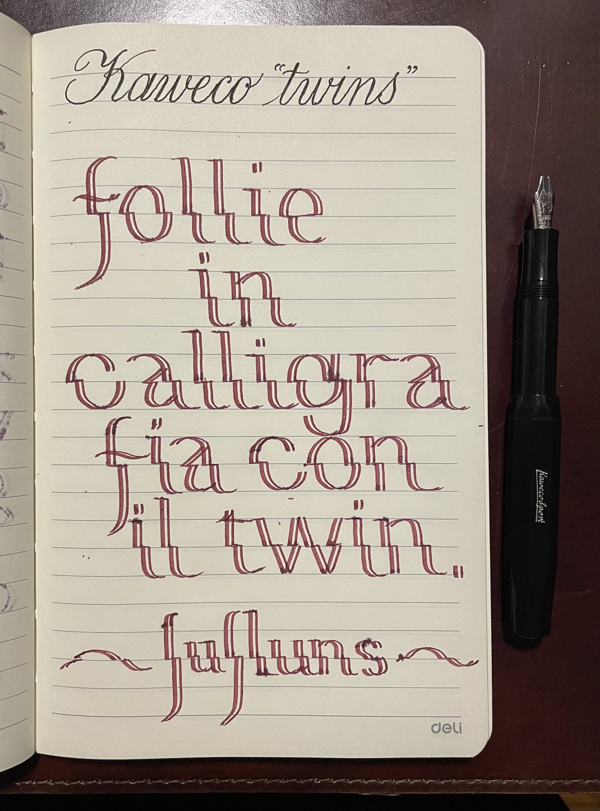 Kaweco commercializza da molti anni questo pennino a tratto doppio, con il nome di "twins nib" (dall'inglese twins, gemelli). Io lo uso solo ogni tanto, ma con grande gusto, e solo per calligrafare qualche scritta un po' fantasiosa.