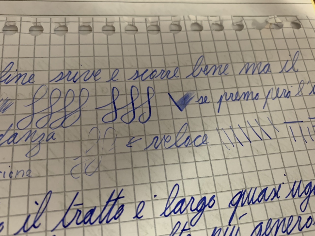 Sembra che non arrivi abbastanza inchiostro alla punta del pennino, ma il flusso sia giusto perché se premo allargando il tratto di inchiostro sulla carta ne arriva in abbondanza.