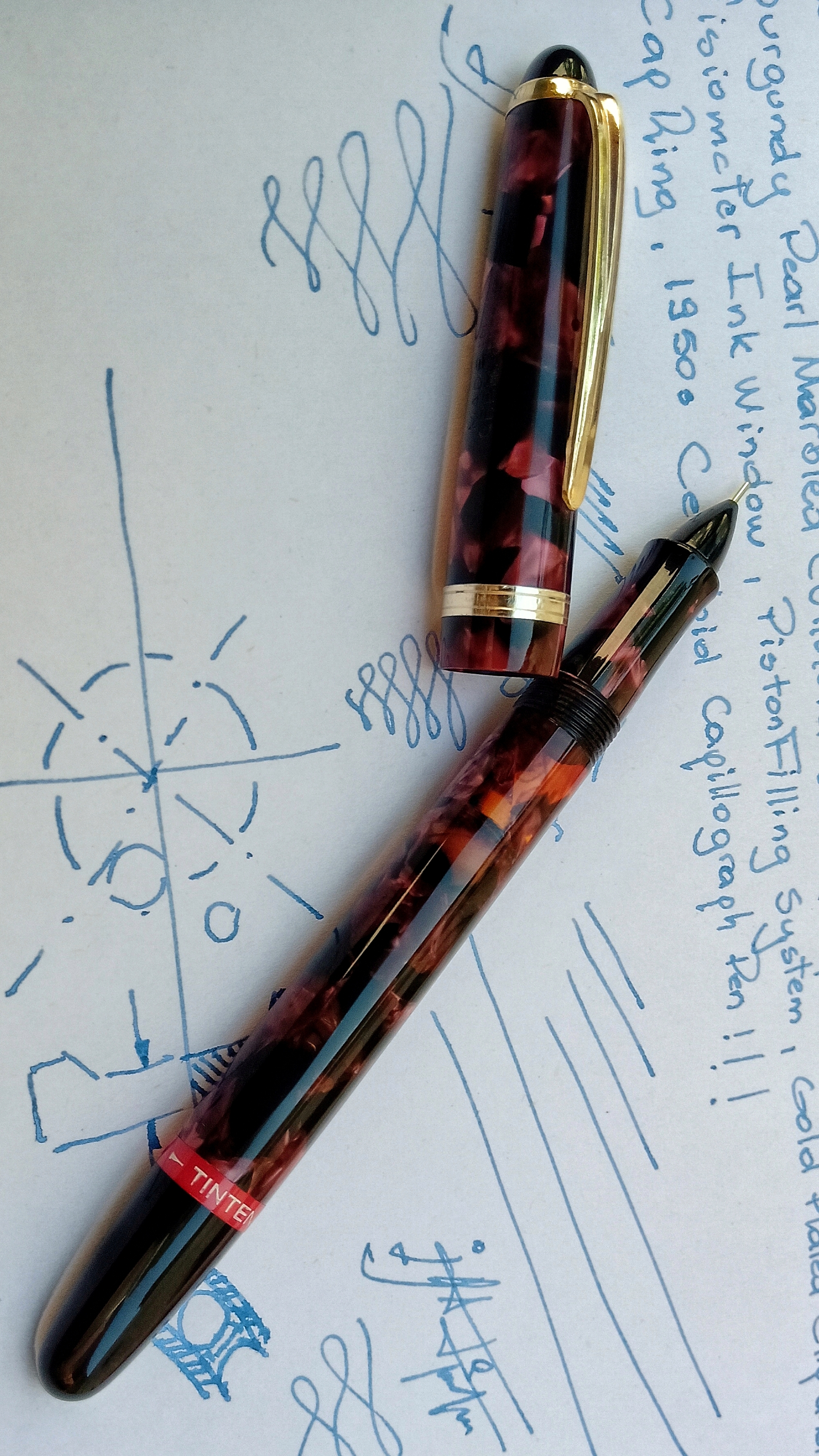 In particolare, quando questa capillografica è entrata nelle mie mani, era in uno stato triste... nonostante il suo oro fosse conservato, il cappuccio aveva subito una notevole deformazione, tutta la celluloide aveva perso la sua lucentezza, e il sistema capillare era completamente bloccato... deformazione e lucentezza non erano un problema, solo pazienza per giorni, ma estrarre il filamento dal tubo era una causa persa...