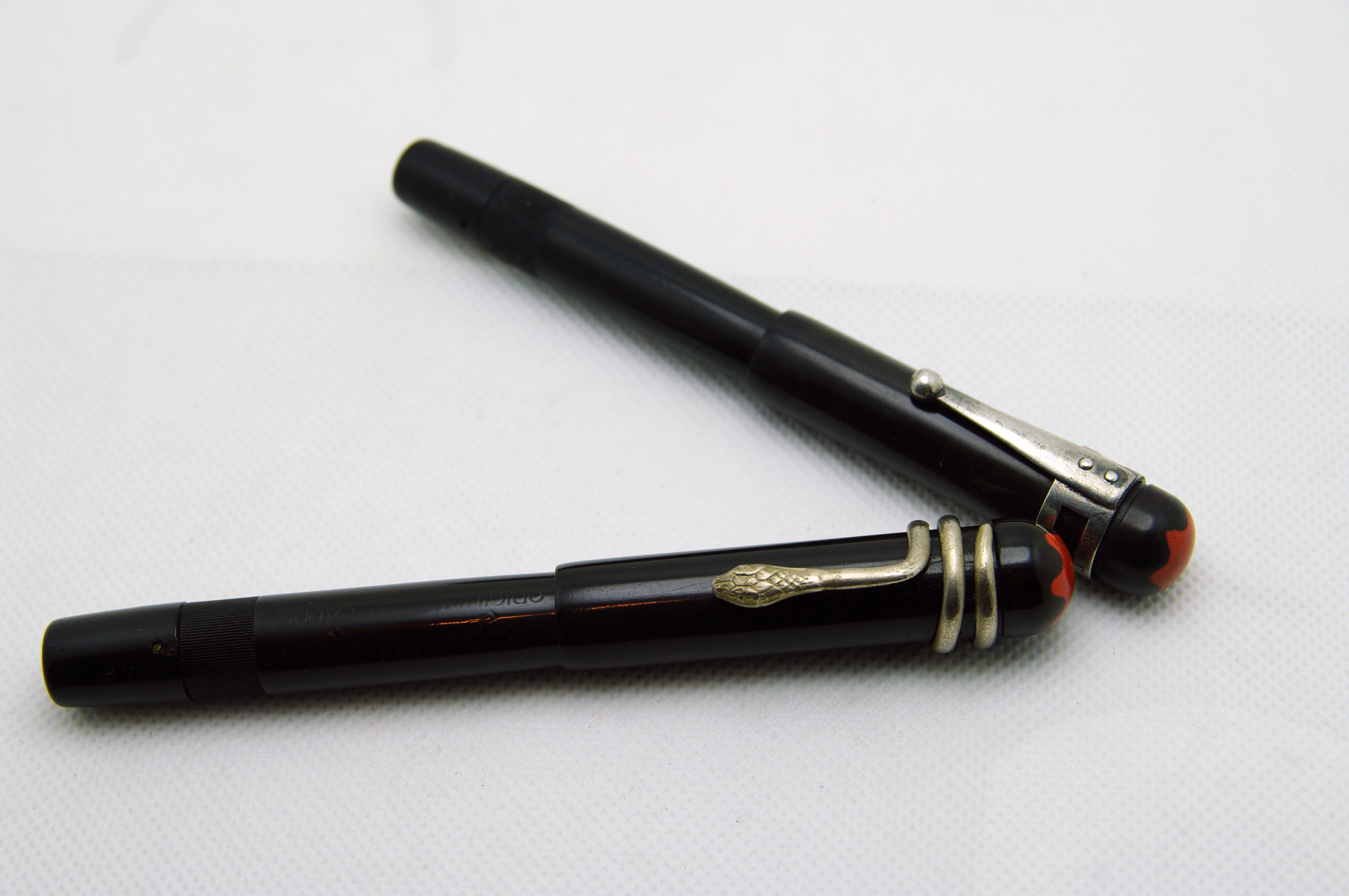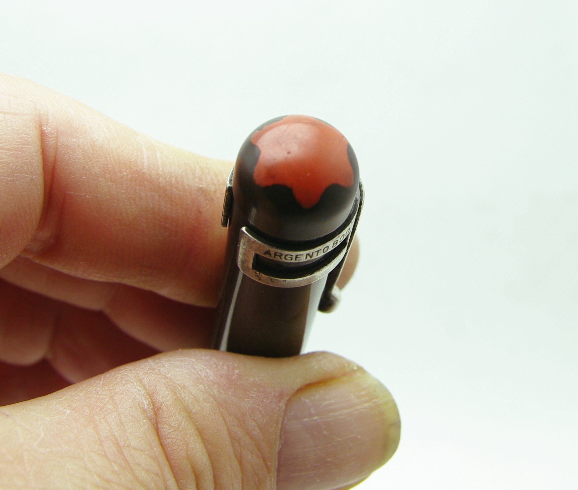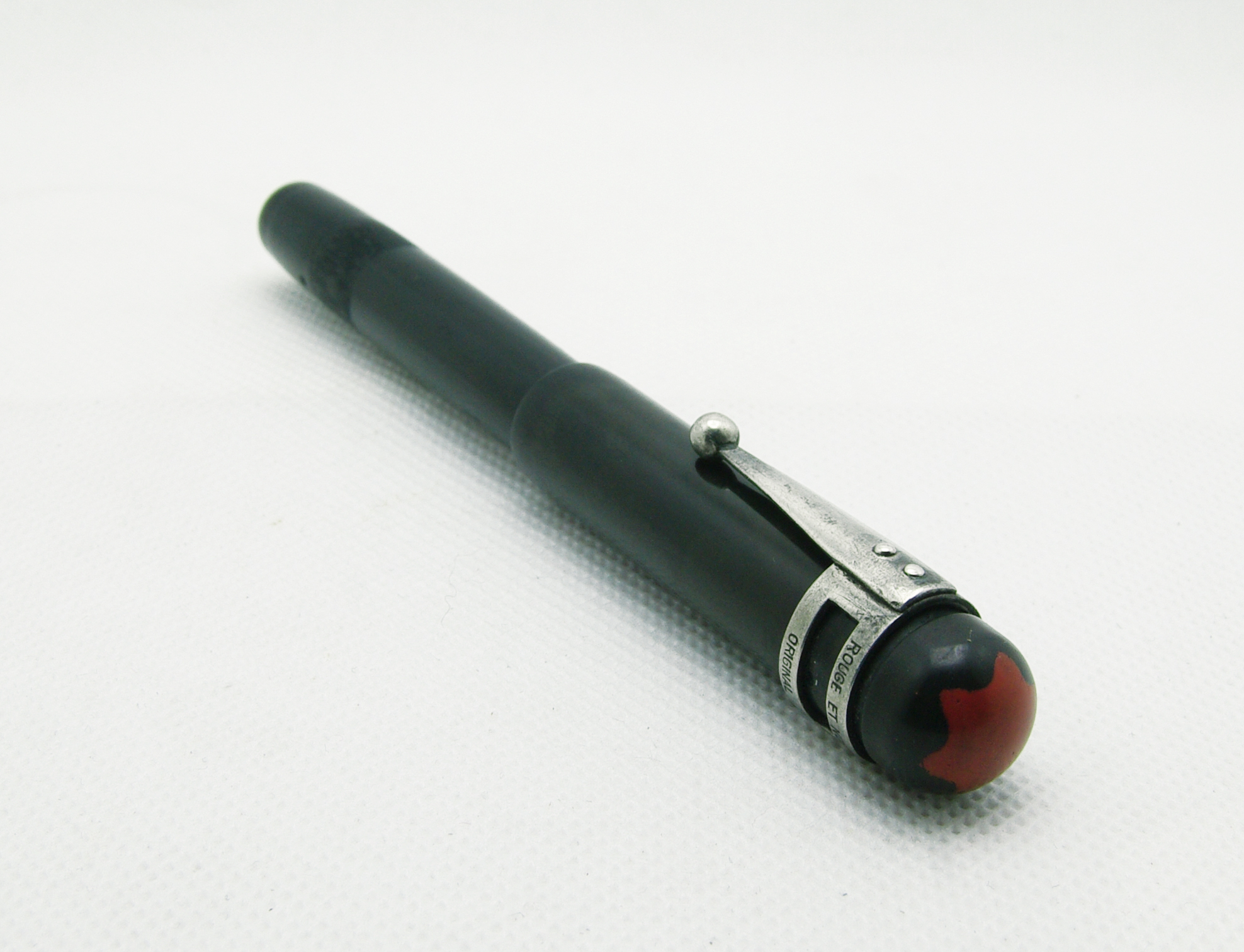 Questa è la mia ultima preda, sono molto felice perchè è perfetta e tutta originale, marcato cappuccio, fusto, pennino e perfino la clip in argento porta il marchio . Purtroppo sul cappuccio e sul fusto le scritte sono molto consumate, ma si può perdonare ad una penna con oltre un secolo di vita.