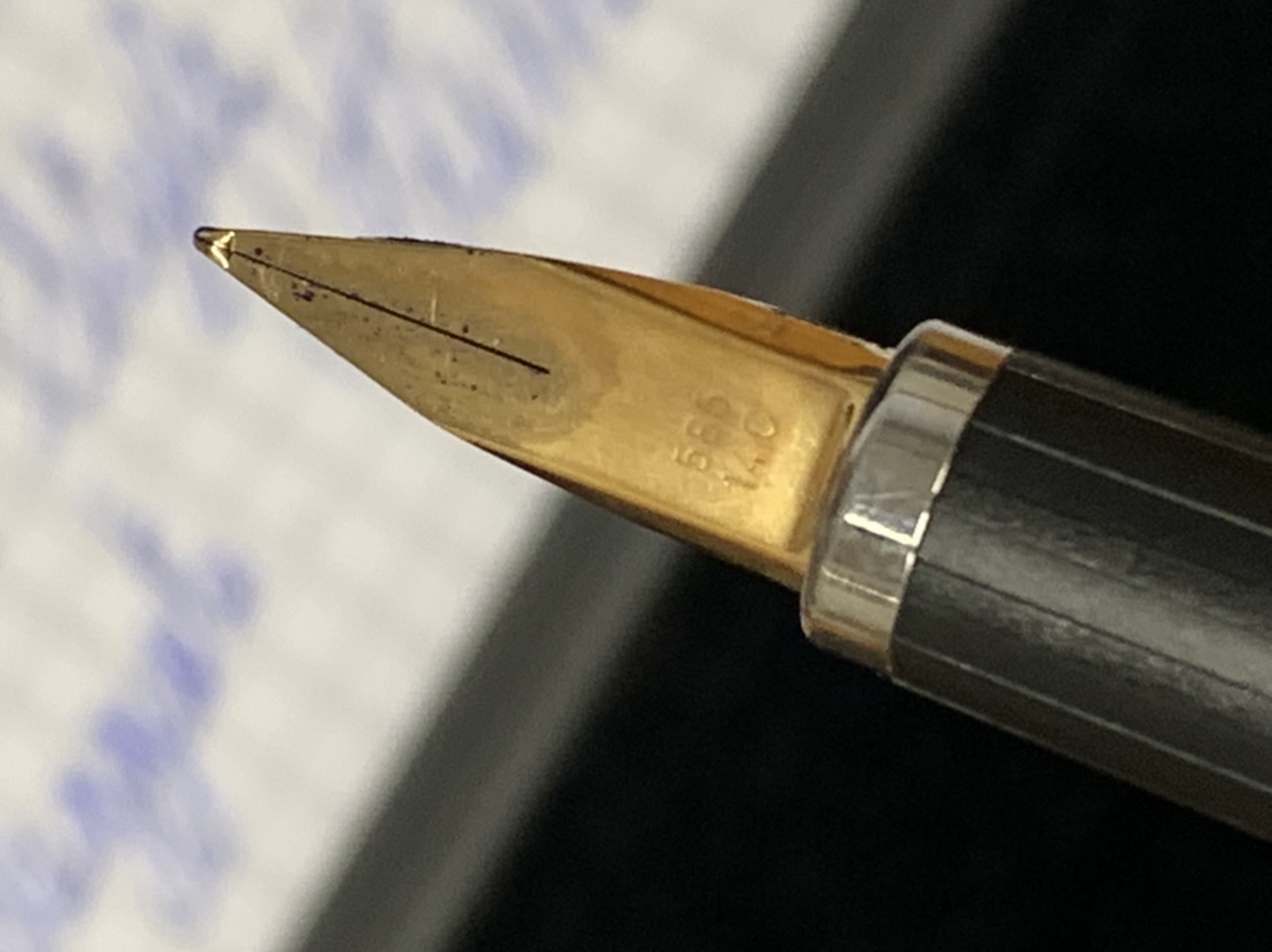 Eh si perché ovviamente quello che conteneva la scatola tutta impiastricciata di colla e polvere era una magnifica Pelikan Signum 560. Corpo in acciaio brunito, clip dorata e pennino in oro 14kt , una volta ripulita sembra nuova.