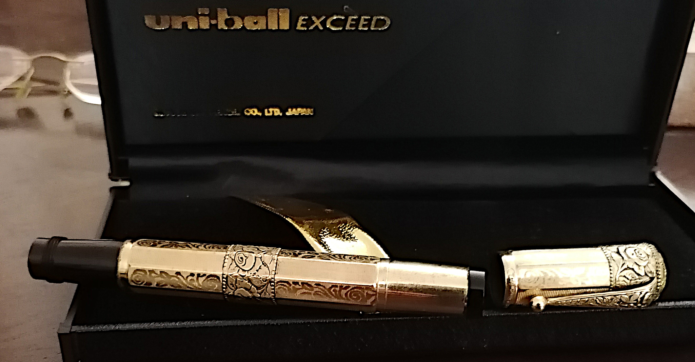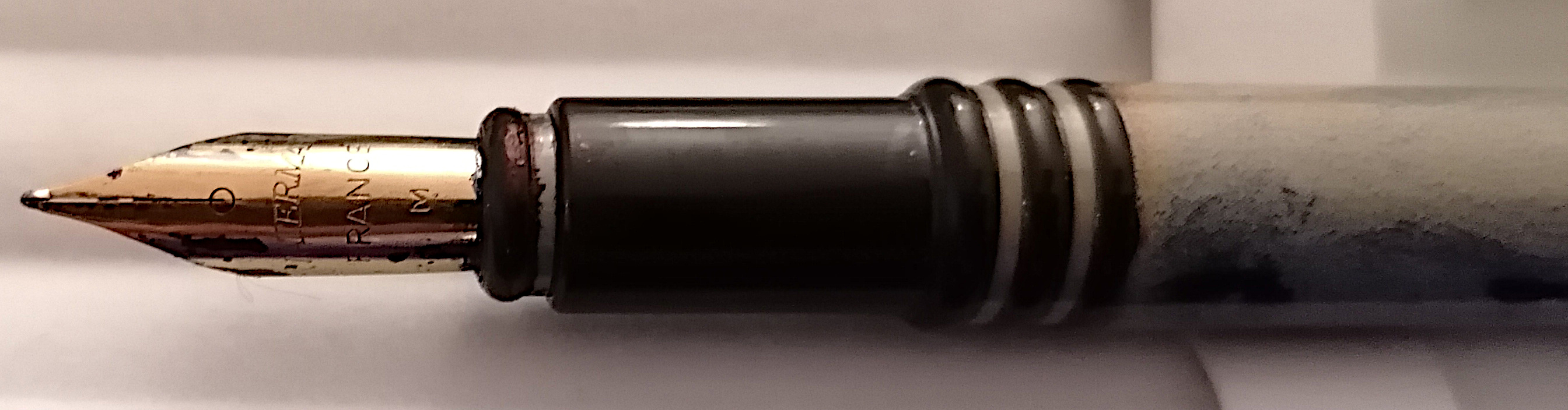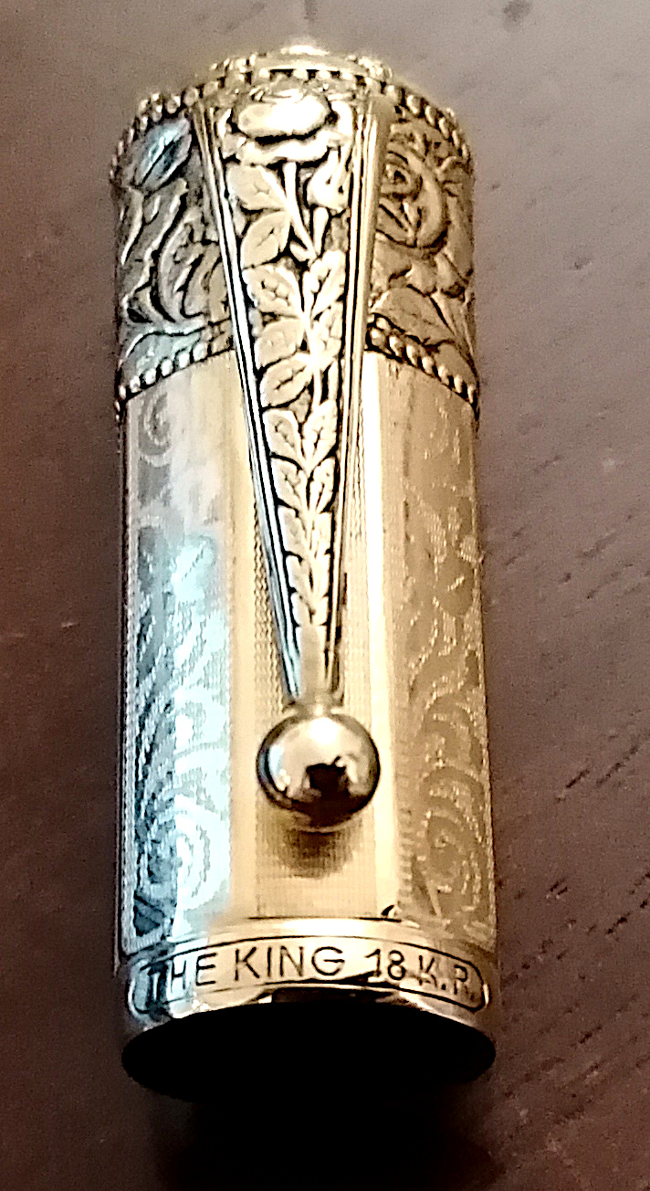Per la terza safety dorata (non credo proprio che possa essere ricondotta alla scatola della Uniball Toshiba - Japan) ho trovato solo sul labbro del cappuccio la scritta "The King 18 K.R.". Quest'ultima è bloccata e devo metterla a bagno per vedere se anche il pennino mi può aiutare a identificarla.