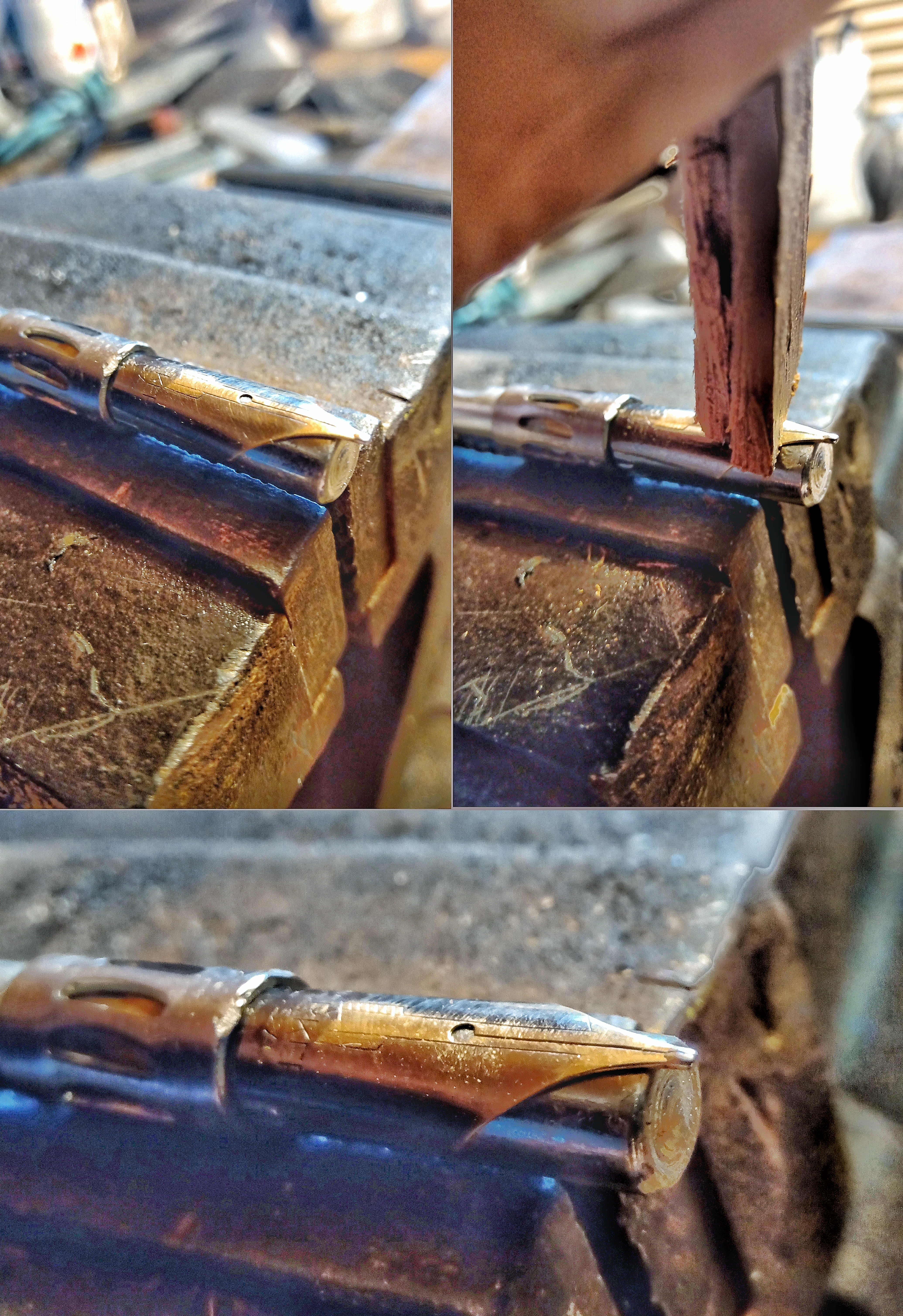 Once an "acceptable" smoothing was achieved, we began a polishing process with 3500 grade emery paper that logically ends up sweeping the microns of gold or platinum mask that the nib had in some parts of its surface (there was very little of the mask left)...