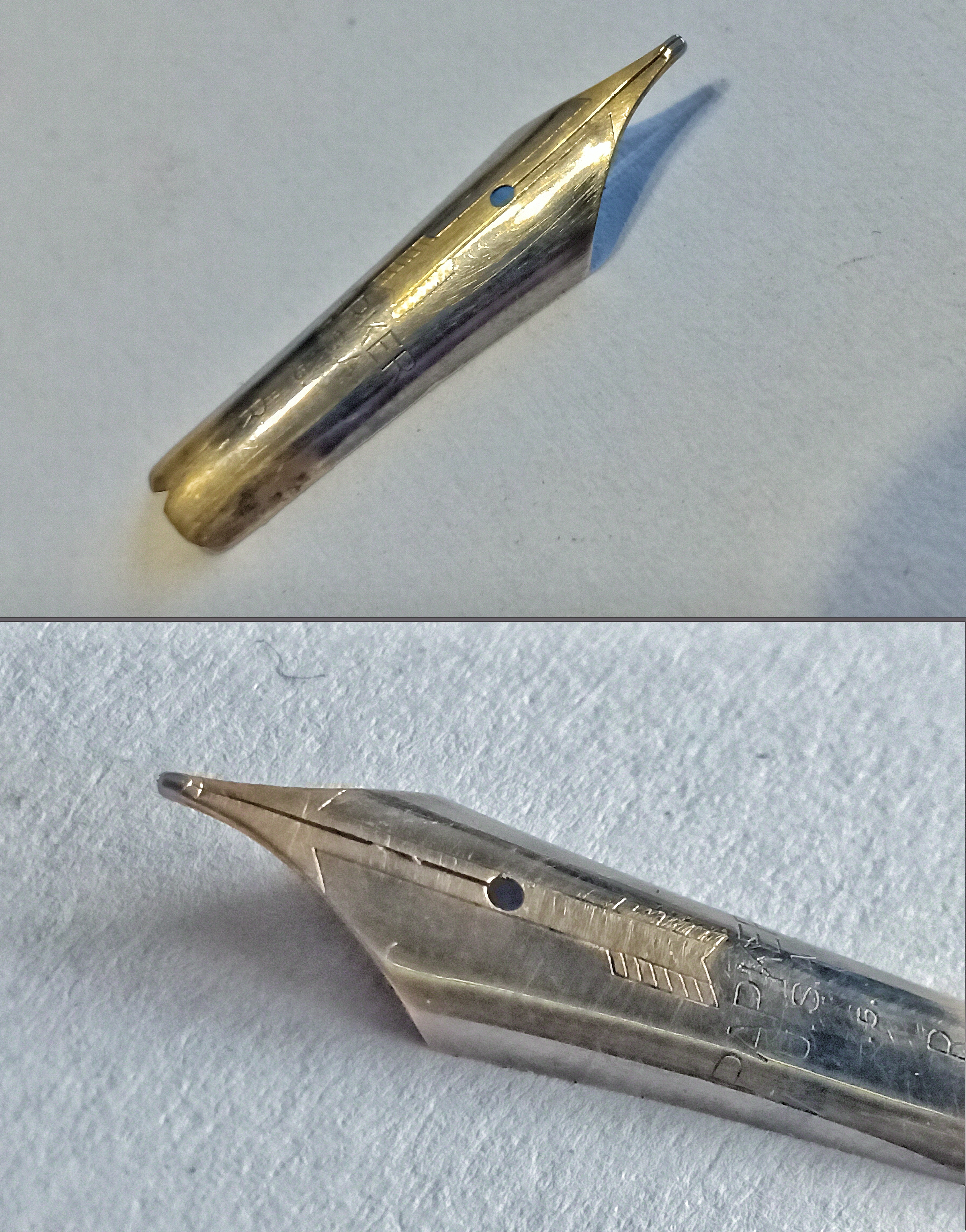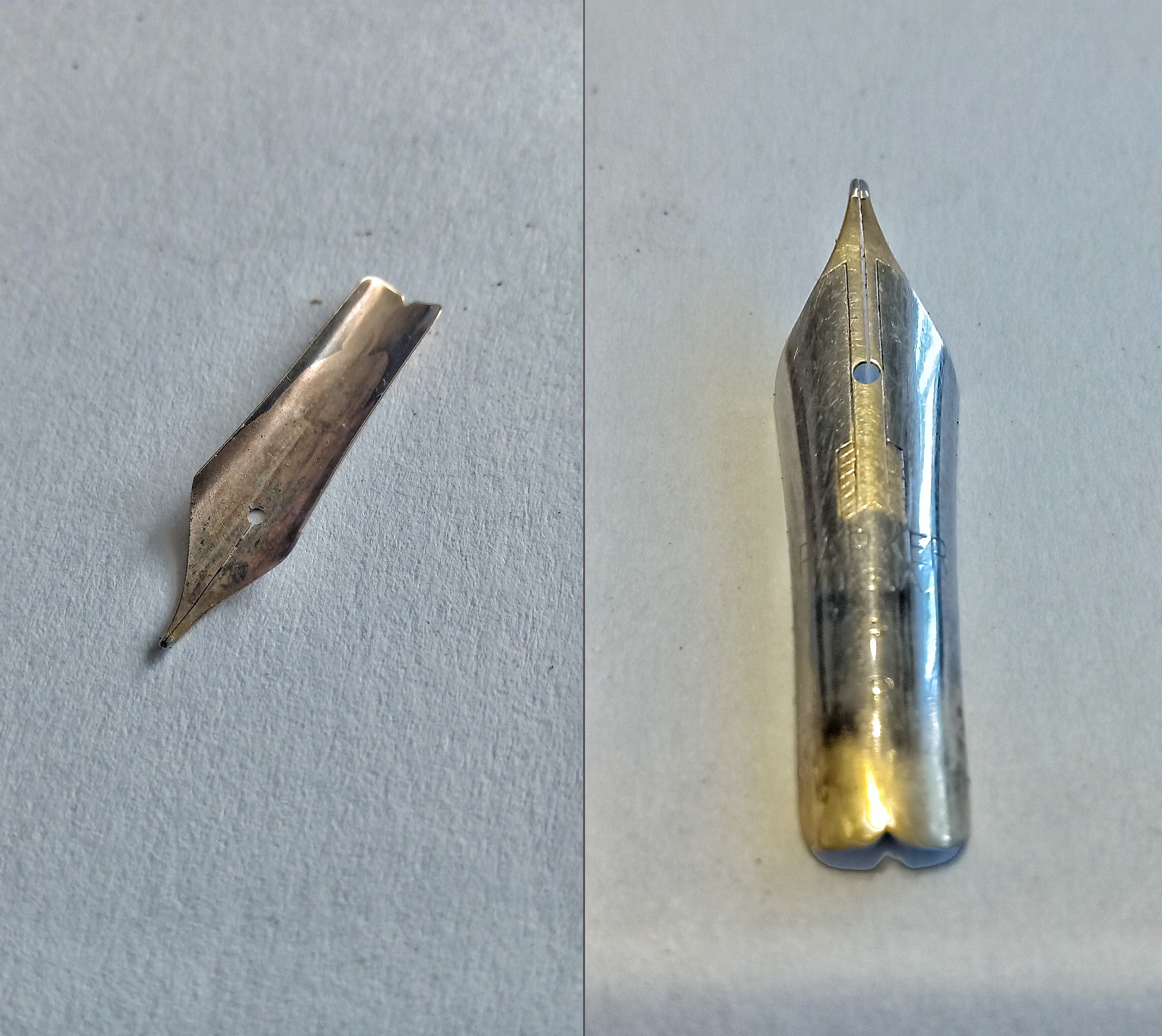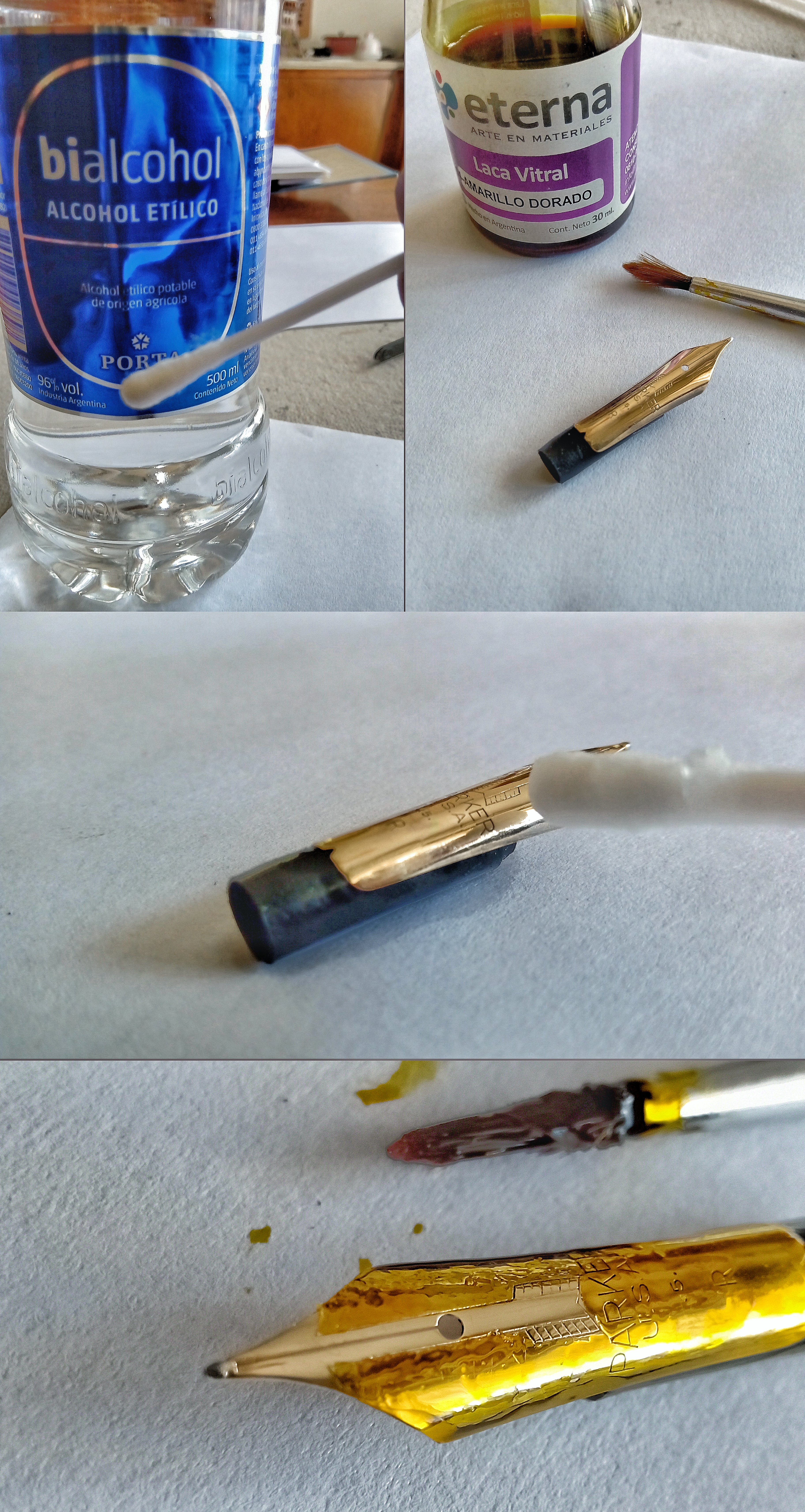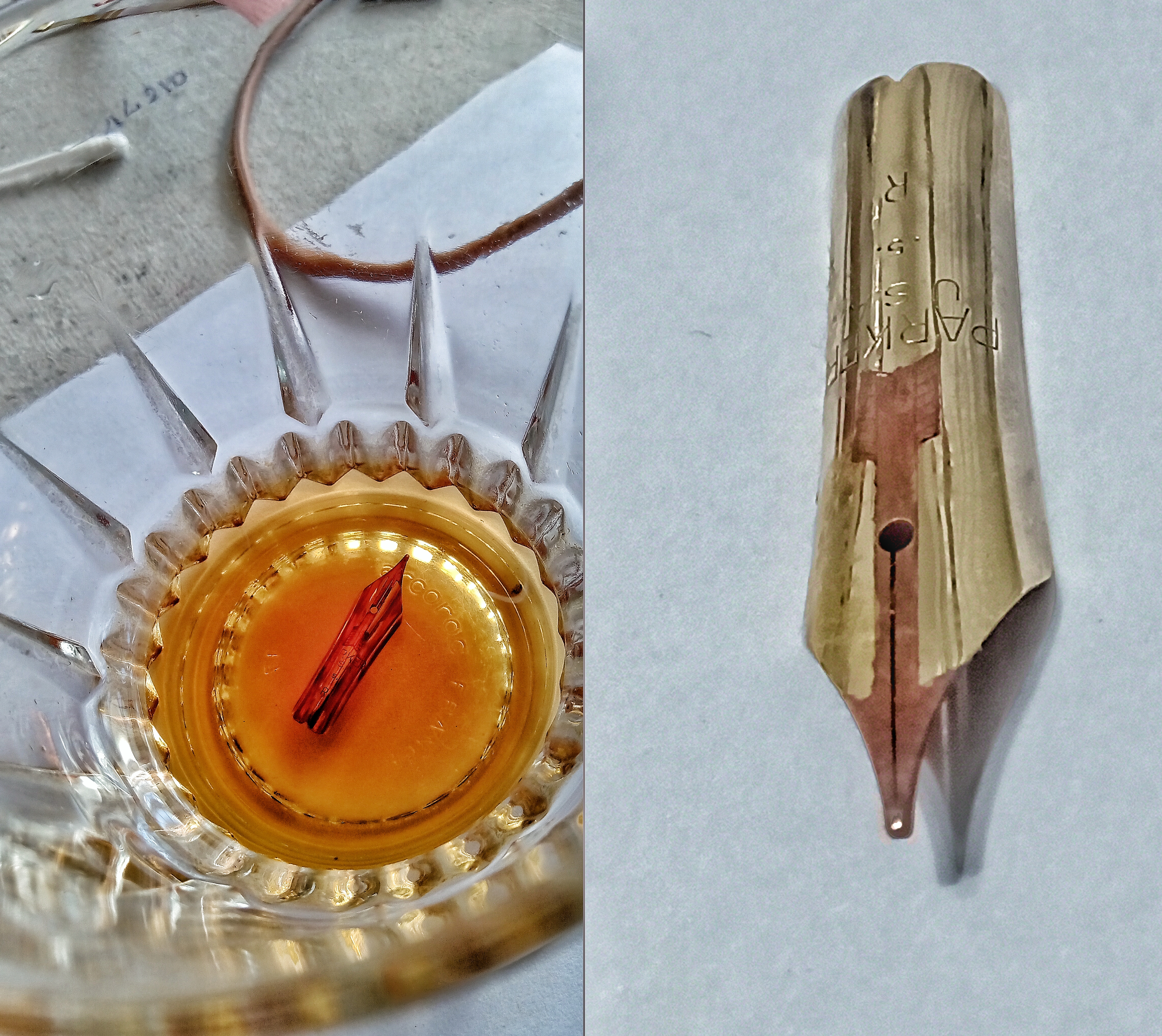 Once the deposition is finished, the nib must be washed well to remove all traces of acid, and then we remove the lacquer with a good organic solvent (acetone or thinner) with a very interesting result...