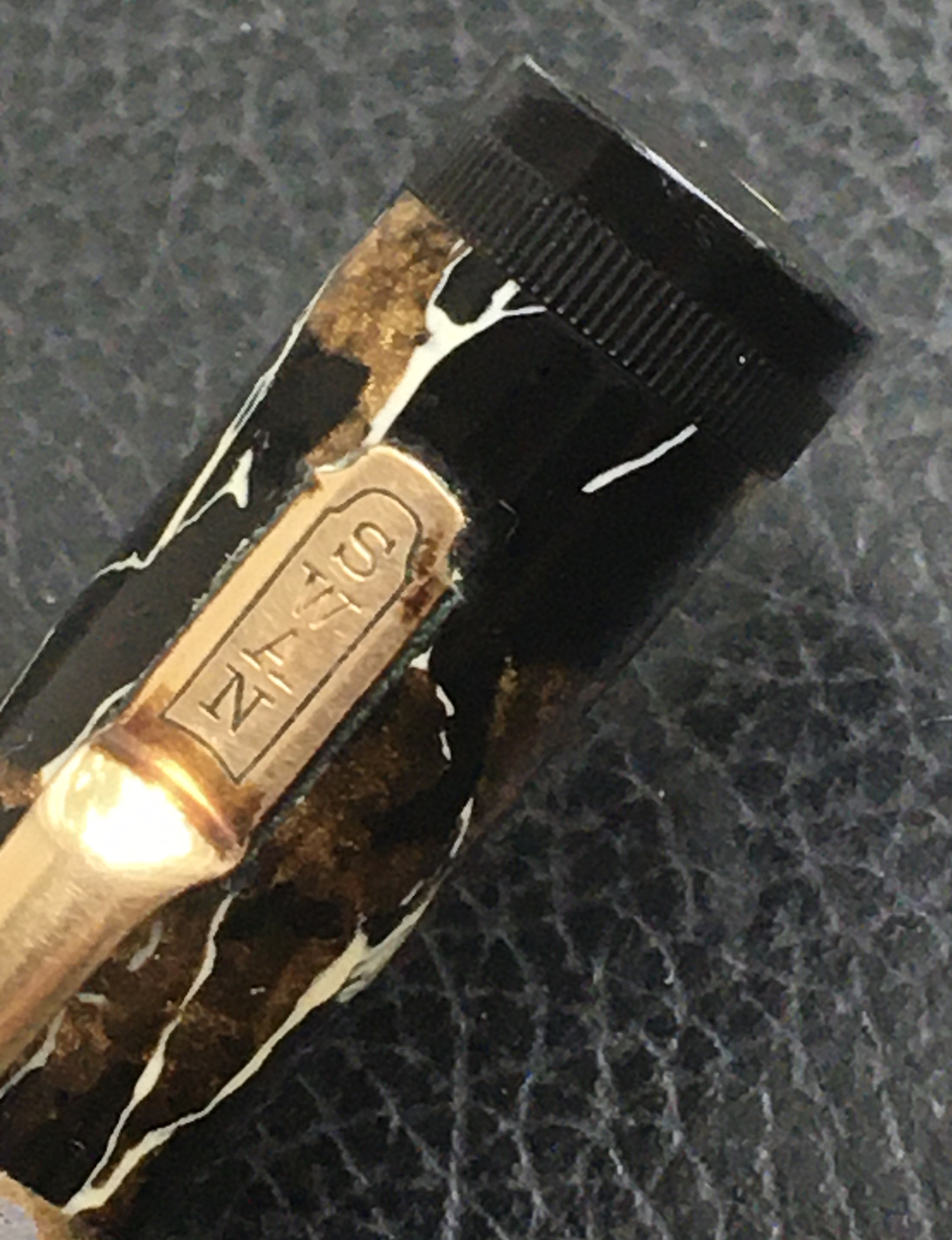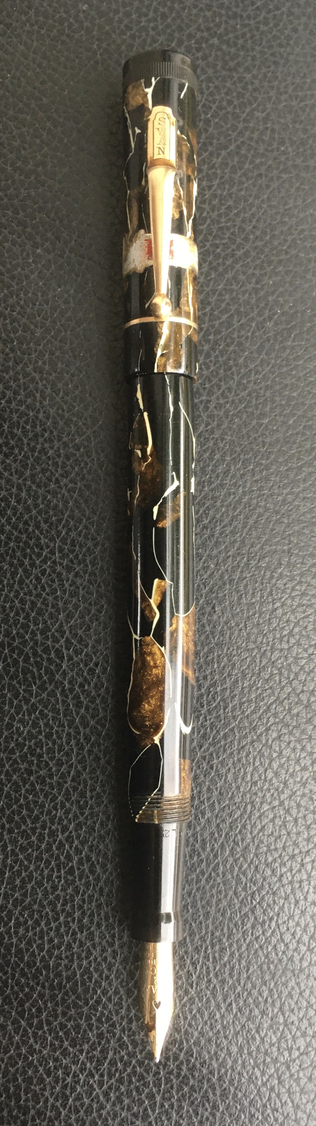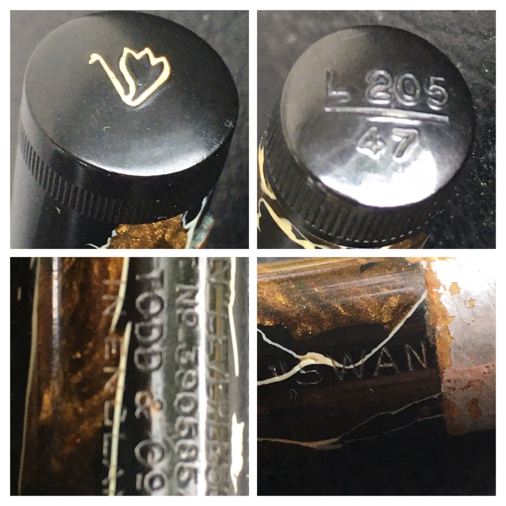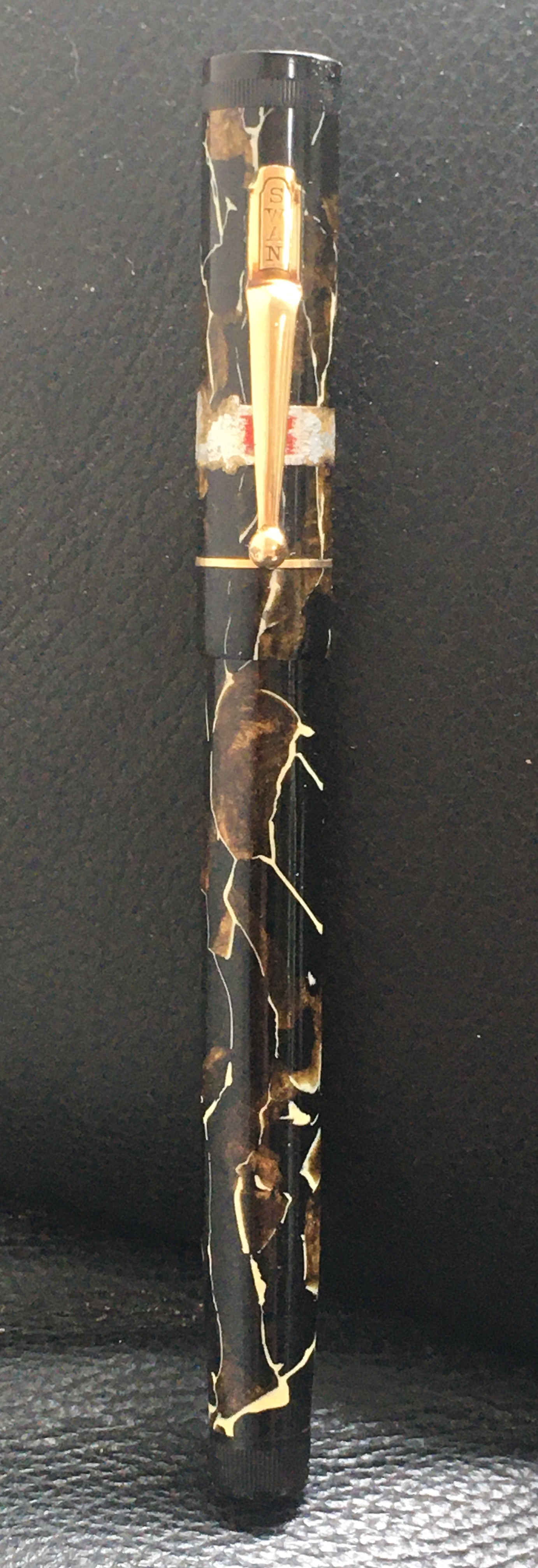 Cari amici, oggi ho un'altra penna Swan. Per molti versi questo modello è la mia stilografica vintage preferita, la forma, l'equilibrio, il bellissimo pennino e il design aggraziato rendono la penna quasi perfetta. Si tratta di una Swan L205/47 senza leva. Il collezionista inglese John Brindle data questo modello al 1927 quindi è molto presto, il prezzo originale è ancora sul cappuccio.L205 è il numero del modello e 47 si riferisce al colore. Ha i colori più belli, marmo bronzo con macchie d'oro e venature bianche che ricordano alcune immagini del cielo notturno visto dal telescopio Hubble. Per favore godetevi le fotografie.