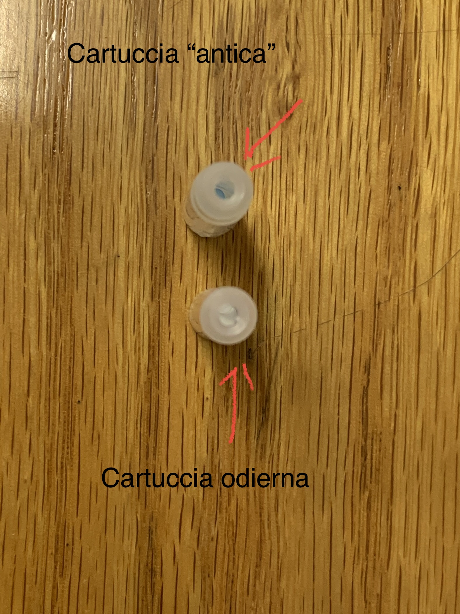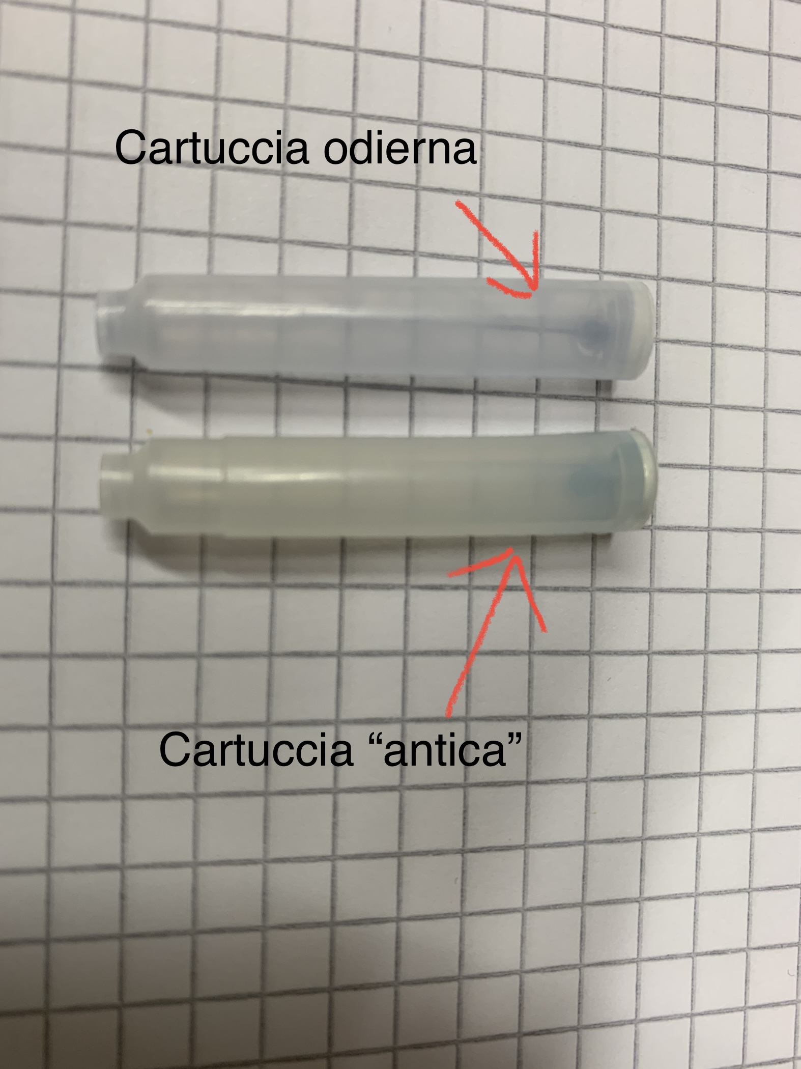 Poi mi cade l’occhio sulla cartuccia “vecchia “ che nel frattempo avevo lavato e mi accorgo che sebbene marcata Pelikan è diversa, un pelino più “tozza” e anche l’imboccatura è un pochino più grande….