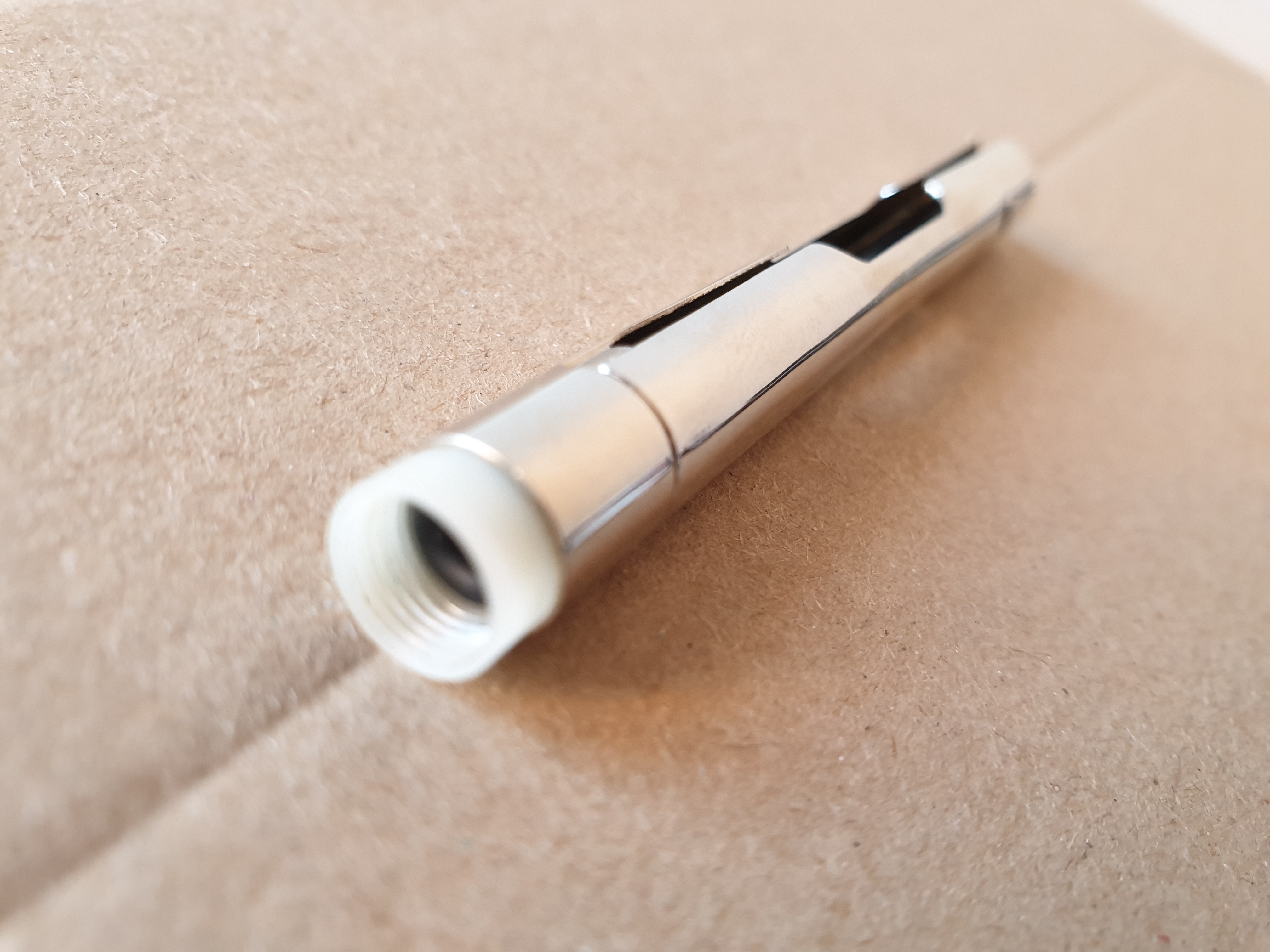All'imboccatura del converter, che ha un filetto e si avvita all'alimentatore, c'è anche una piccola guarnizione. La parte in plastica bianca sembra ben fissata alla struttura di metallo (ho provato a tirare e svitare ma senza risultato) per cui al momento mi sa che non farò nessun tentativo di reinserimento del sacchetto, anche perché non ho intenzione di tenere la Baracca nella mia collezione, le penne dal tratto extra-fine non fanno per me.