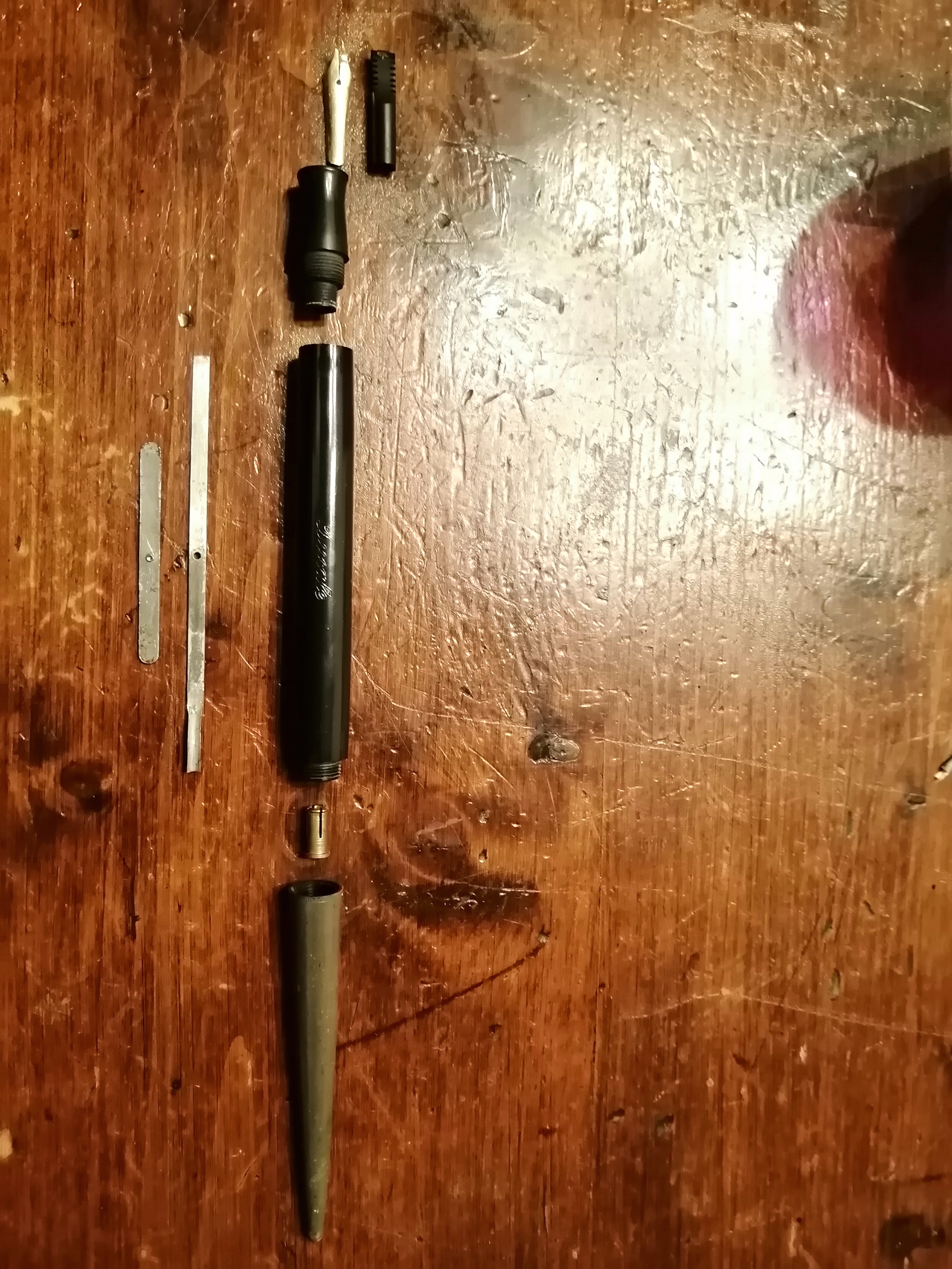 Buonasera, mi è stato regalato questo stiloforo Ducale con caricamento a pulsante. Alimentatore e pennino (marcato Amica 585 3, non so se potesse essere l'originale o un ricambio postumo) sono entrambi spezzati, e andranno sostituiti.