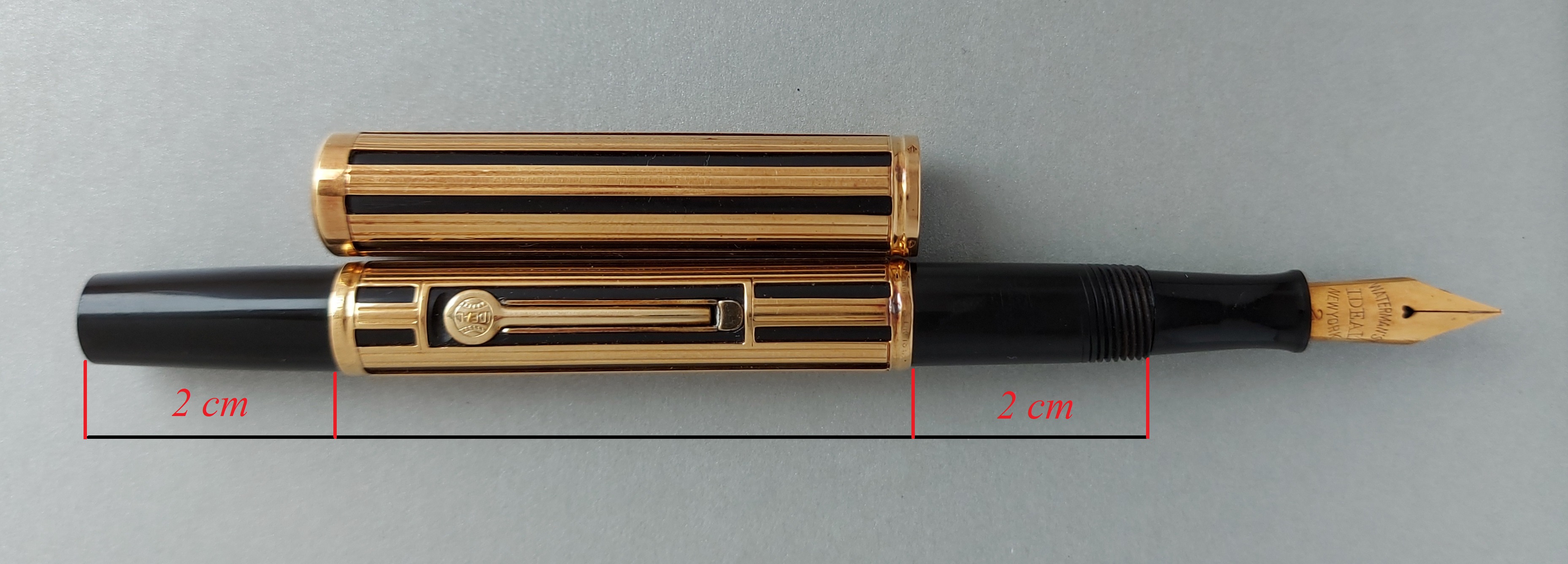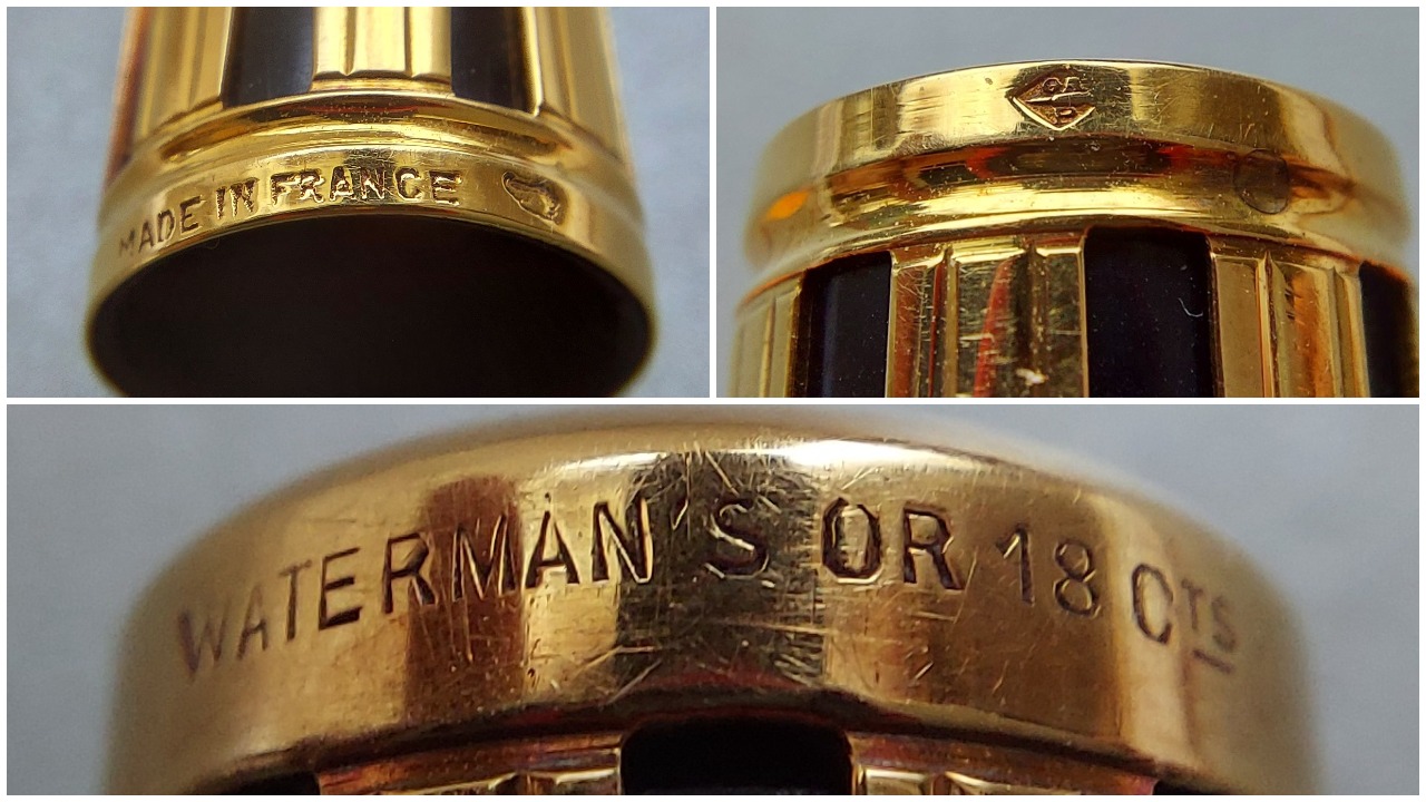 WATERMAN [552½] in ebanite nera liscia (BHR), rivestimento in oro massiccio 18 carati con decoro “J” (ajouré = a giorno = night and day), cappuccio a vite senza clip, corretto pennino Waterman Ideal #2 in oro 18 carati, caricamento a levetta, produzione U.S.A./Francia, anno 1924.