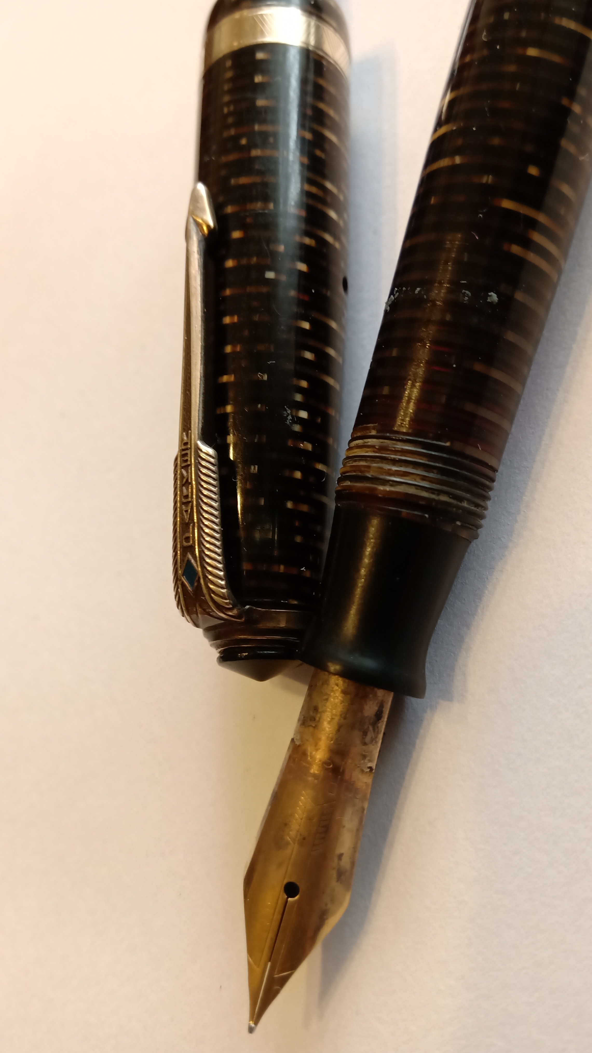 Dear friends of the forum, I want to share with you this time, the restoration of a Parker Vacumatic Tiger Eye Speedline from the 1930s, which I was able to acquire at a reasonable price (US$38) since its nib was intact and the barrel was in very good condition, without cracks and with the entire imprint...