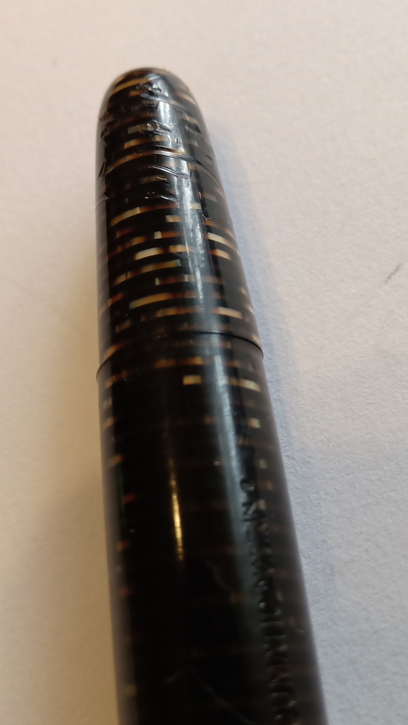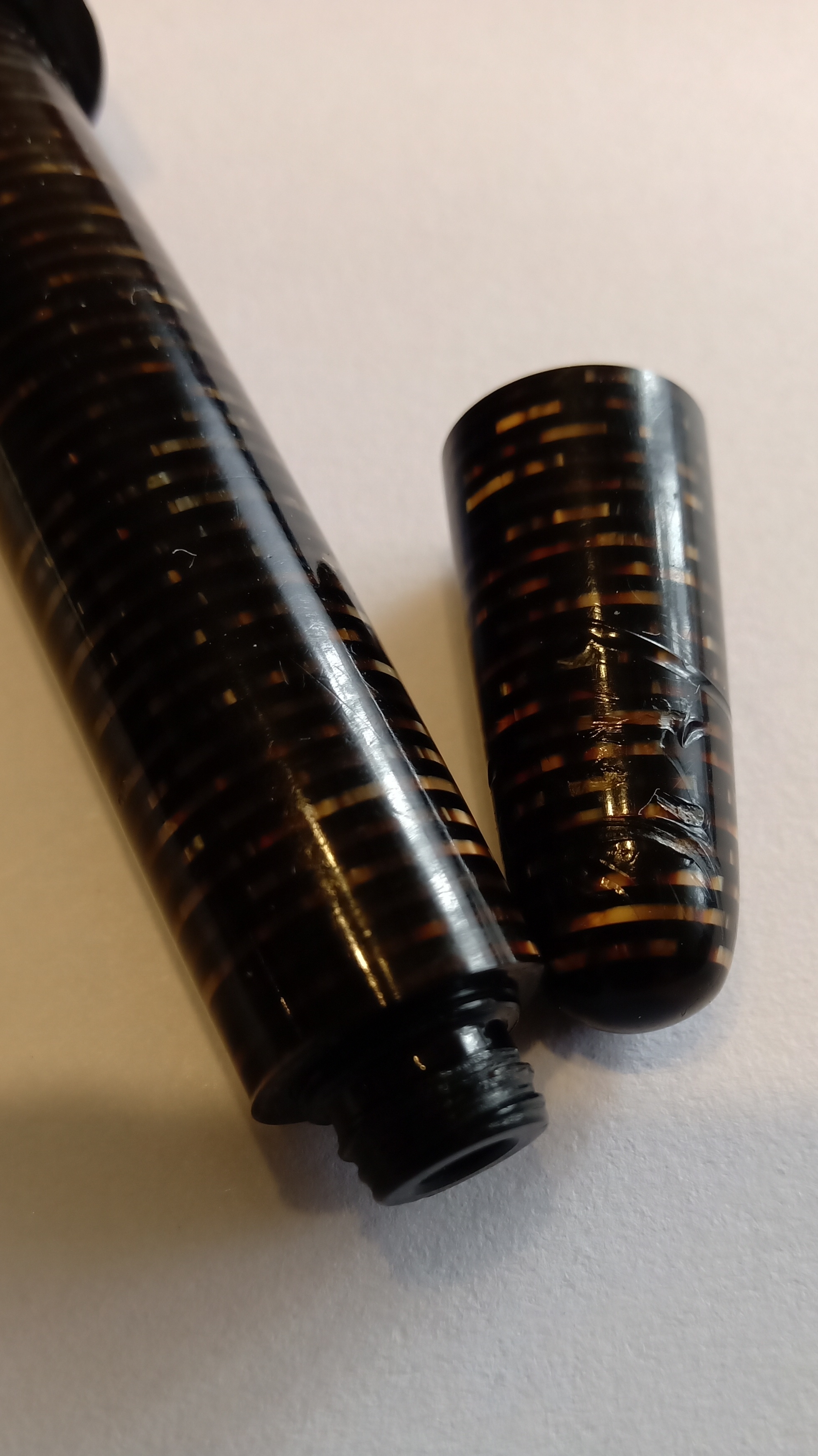 Cari amici del forum, voglio condividere con voi questa volta il restauro di un Parker Vacumatic Tiger Eye Speedline degli anni '30, che ho potuto acquistare ad un prezzo ragionevole (US $ 38) poiché il suo pennino era intatto e la canna era in ottime condizioni, senza crepe e con tutta l'impronta...