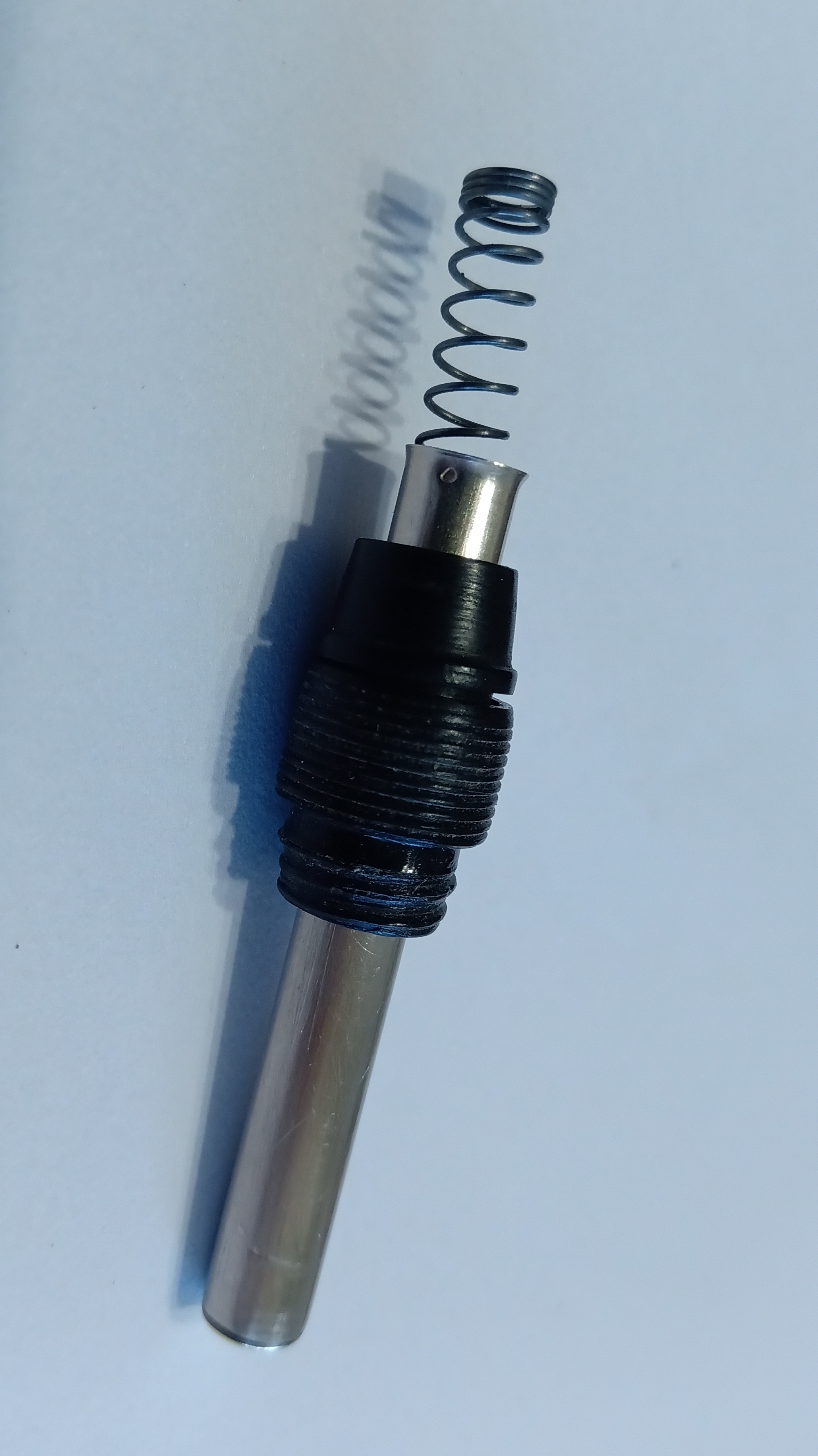 Once the bronze head of the push button was secured, I checked its sliding inside the guide ring and the adjusting ring, and I looked for a spring that would fit inside the button (a ballpoint spring).