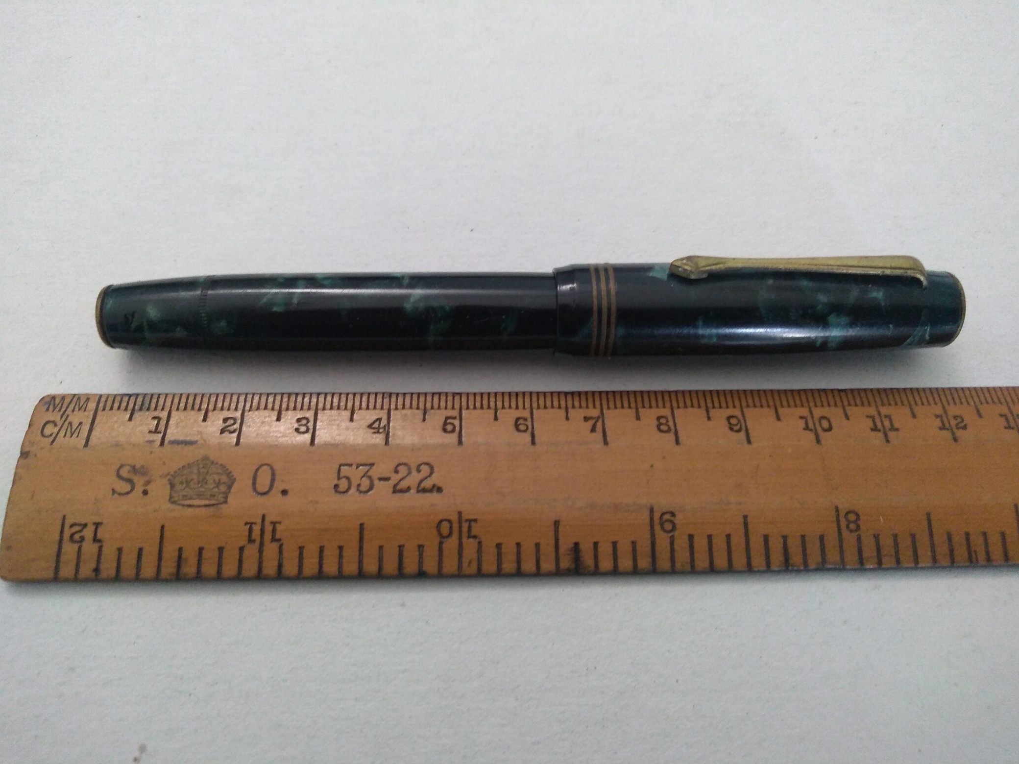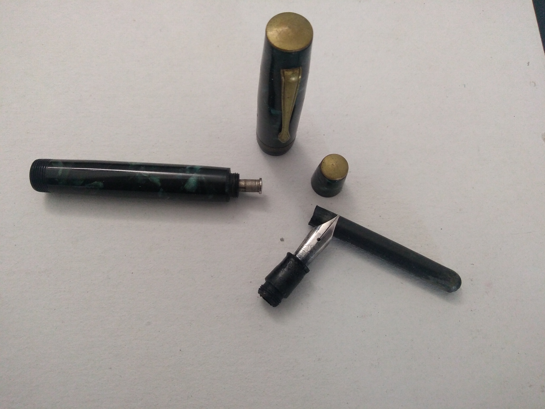 Direi coeva, in medie condizioni di conservazione purtroppo, non è una penna di valore, non lo sarebbe neanche fosse perfetta, fa parte di quella serie di stilografiche degli anni '40/50 fatte per utilizzo puro, non di marca e non di pregio, comunque se rimessa in marcia può ancora dare ottime soddisfazioni utilizzandola.