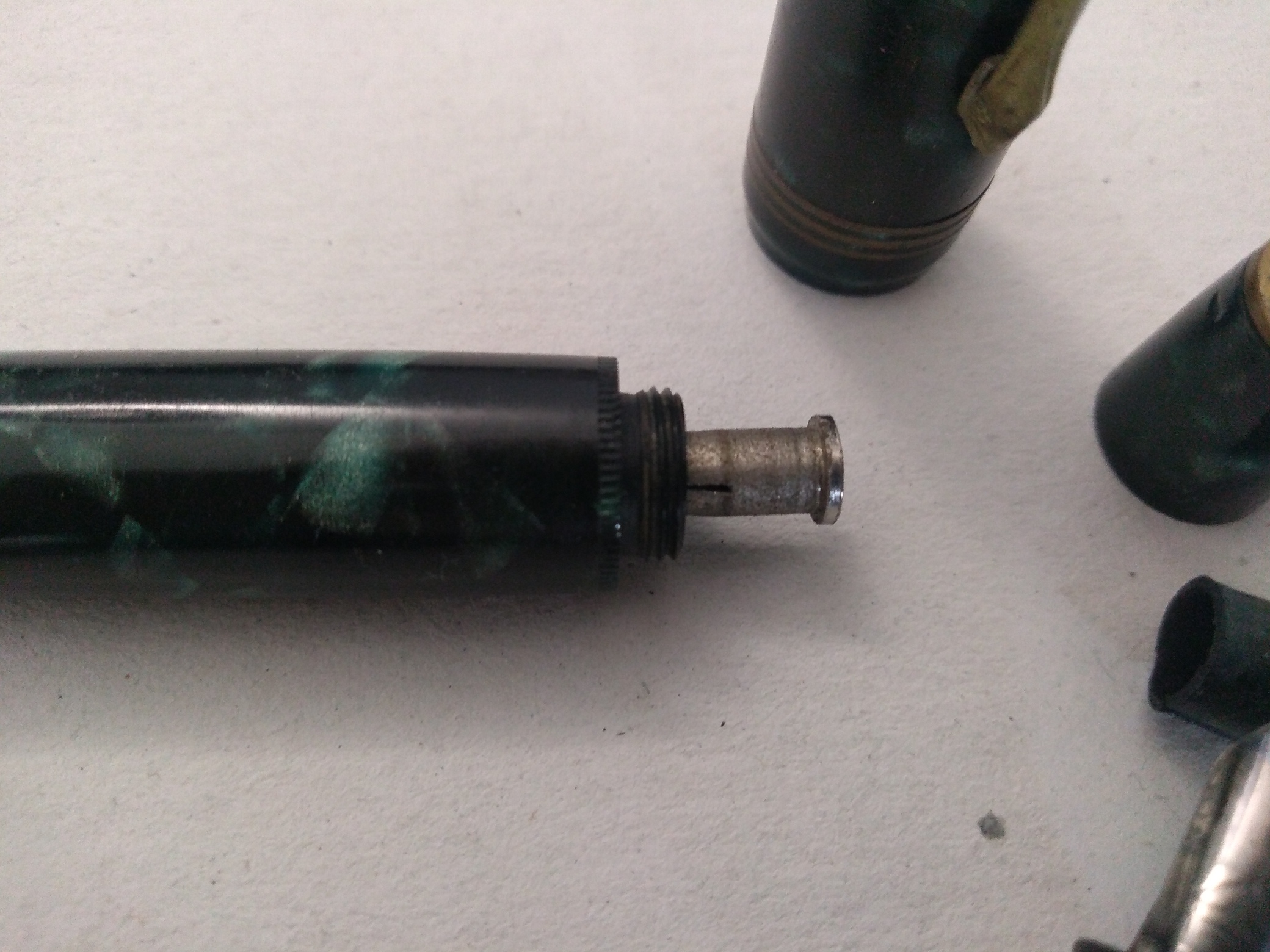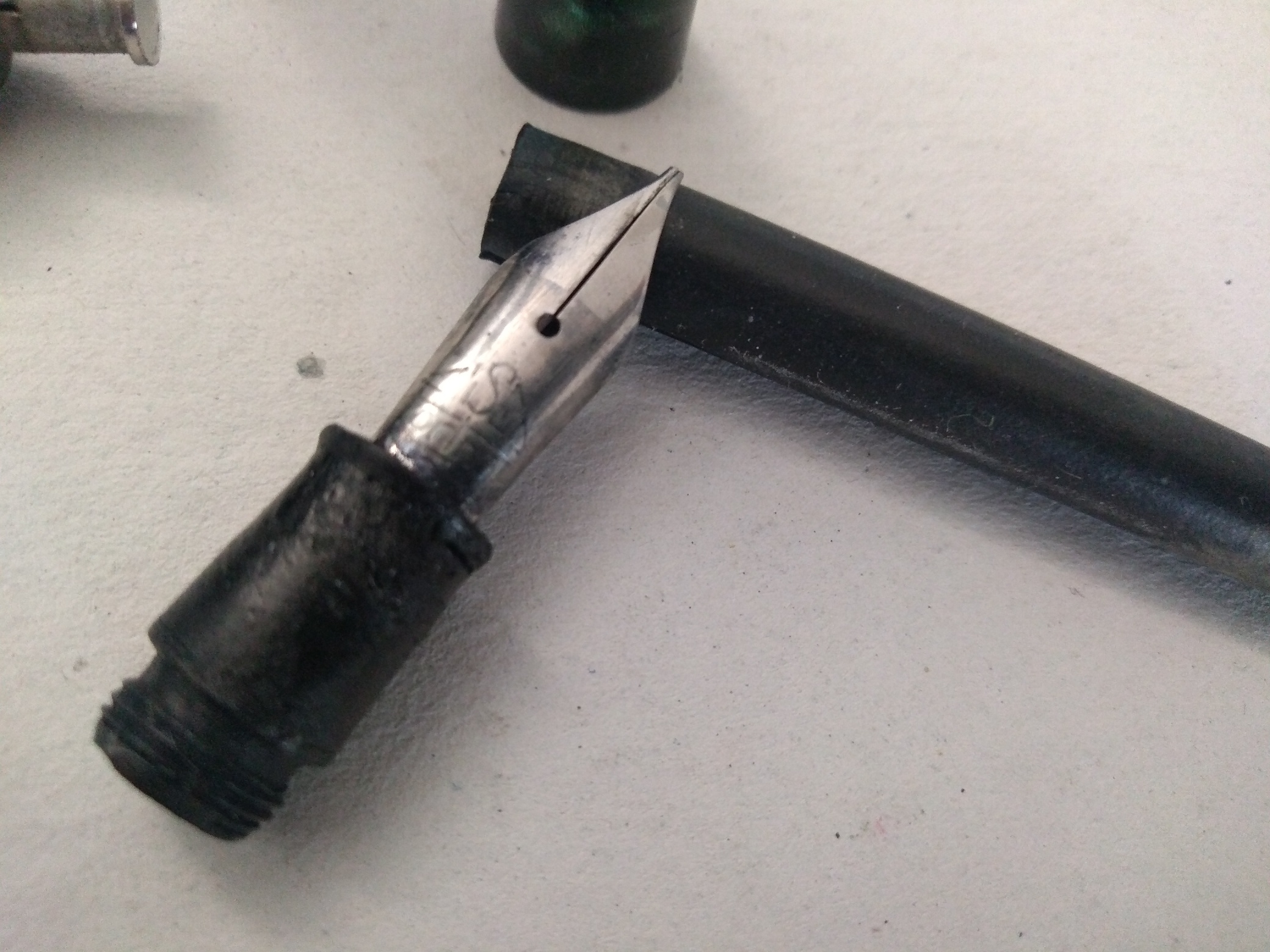 Si tratta di una penna in celluloide probabilmente degli anni '50, monta un pennino marchiato CISEA Torino, la filettatura della sezione del gruppo scrittura è molto lasca circa mezzo millimetro, forse la plastica con il tempo e l'uso di inchiostro si è ristretta? Purtroppo il condotto di alloggio per il sacchetto in gomma sembrerebbe mancante/spezzato.
