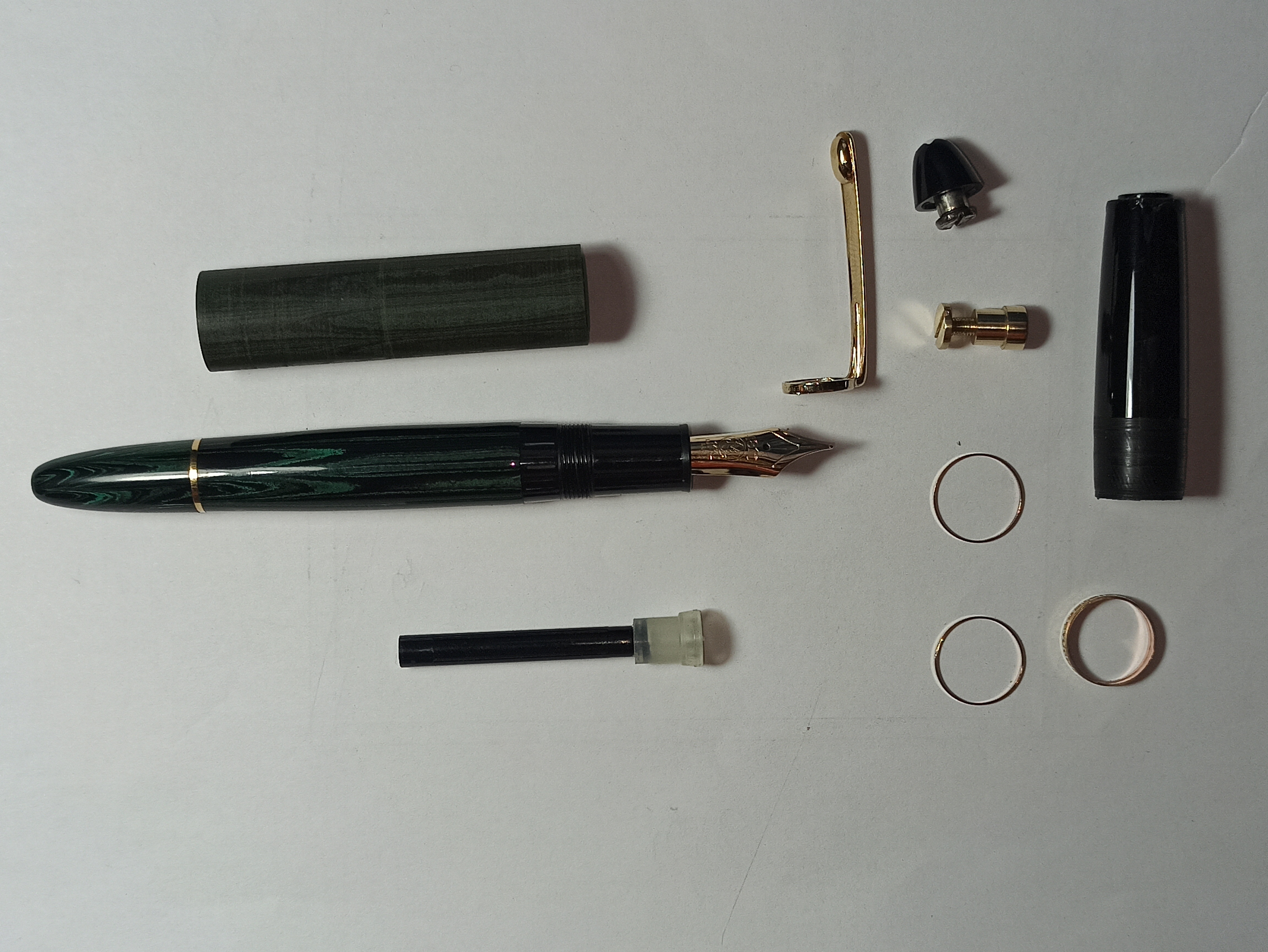 Una MB verde striata in ebanite a fase di costruzione,annelli clip gruppo pennino e pistone originali .Spero di finirla fino al penshow di Firenze ,si ci saro anch'io