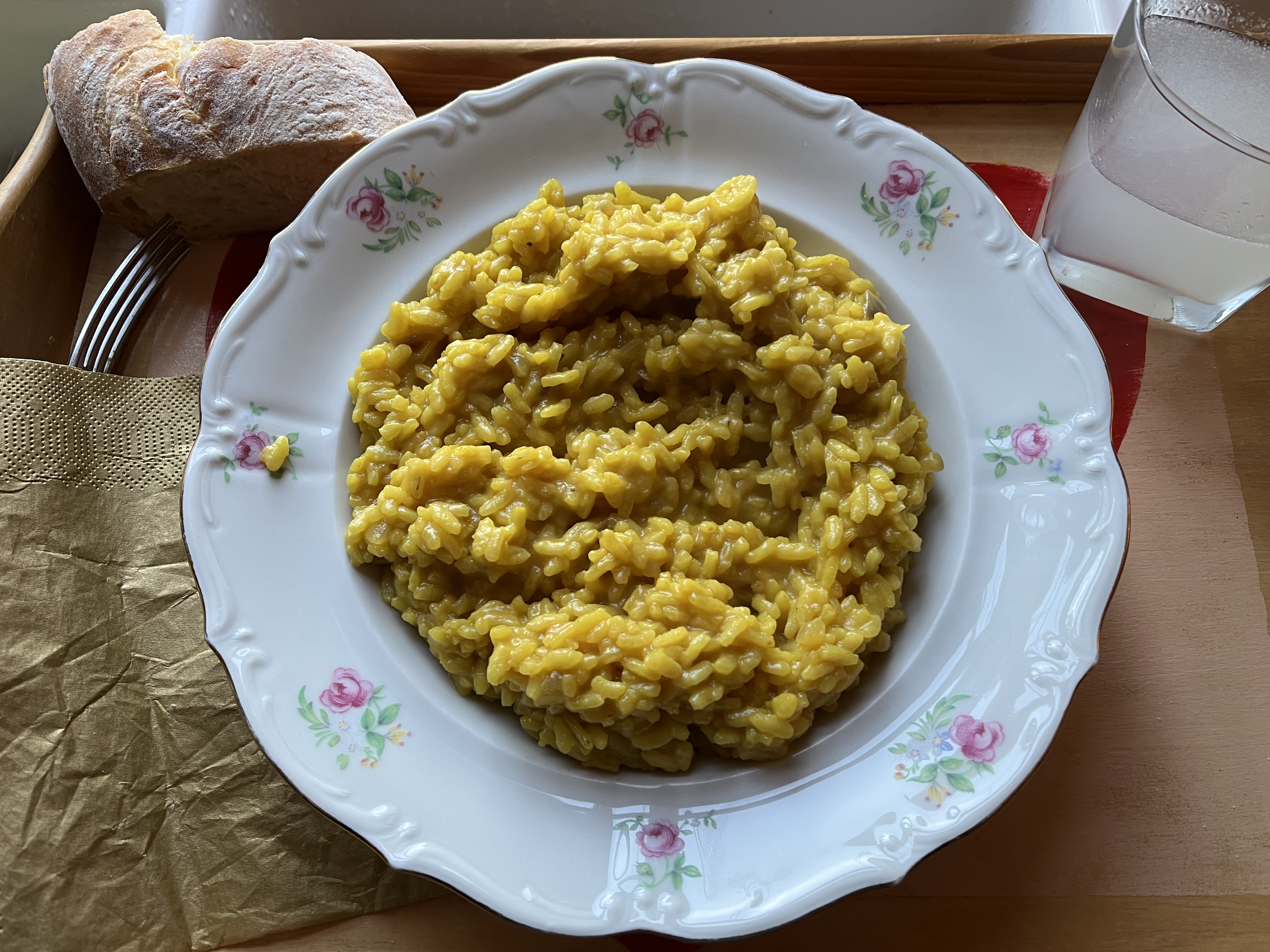 ), ma è probabile che si sciolga benone anche nel latte, nel burro fuso o nell’olio (panna e latte contengono anche una percentuale di acqua, quindi sciolgono anche una eventuale parte aromatica polare dello zafferano). Tutti questi sono anche un aiuto alla mantecazione, essendo grassi: l’importante è che dei grassi inglobino l’amido rilasciato dal riso. È questo che lo rende cremoso