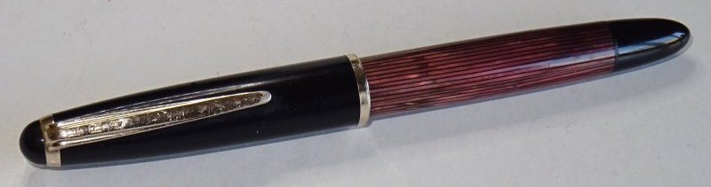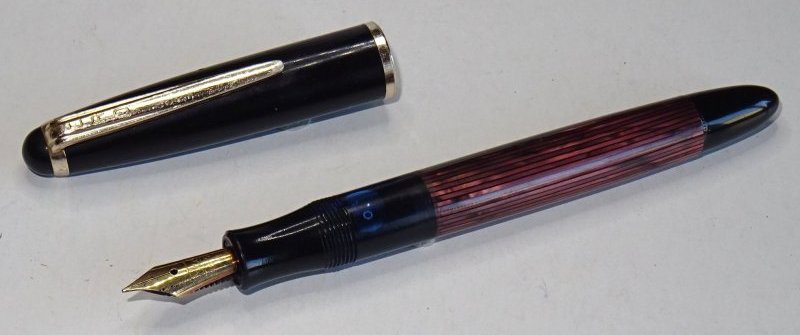 Il fusto non è trasparente (hanno forse anticipato di qualche decennio il nuovo corso Pelikan? :lol: ); inoltre svitando il pomello posteriore, anche con un discreto ingrandimento, non riesco a scorgere lo spessore di una pellicola. Infine, lo stantuffo della mia non ha la testa in sughero, bensì è fatto in materiale plastico trasparente. Il pennino - misura medio piccola e di forma leggermente più sottile (ma più aggraziata) di quello delle Major - riporta sotto il solito marchio incorniciato le scritte 14K - 585 e sotto il numero 4.