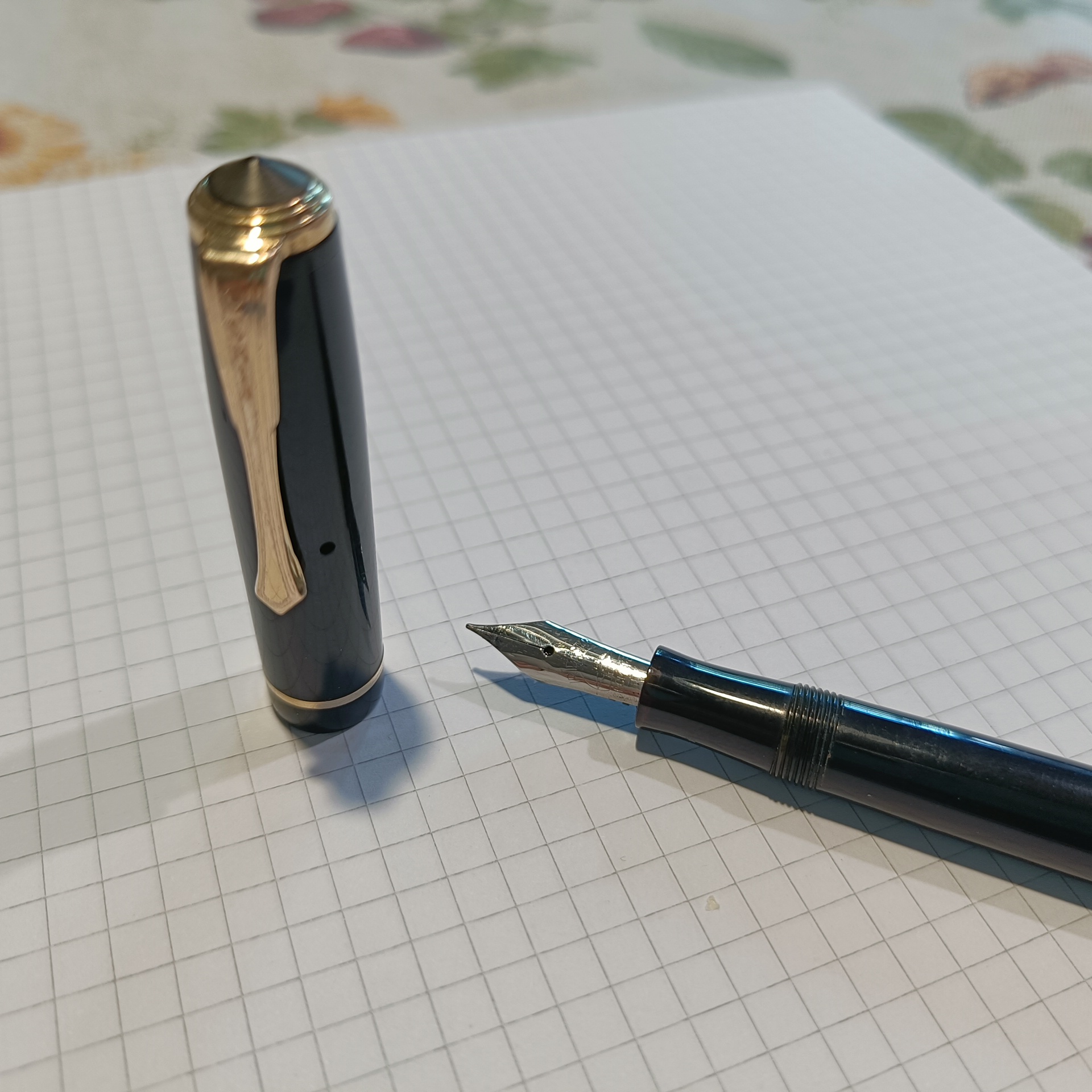 La penna da sensazione di ottima qualità costruttiva: corpo e cappuccio robusti, di una buona celluloide, clip resistente. Mi piace il codolo finale in ebanite. Il pennino è solo cromato, ma abbastanza flessibile e da buone sensazioni in scrittura (un rebbio era un po' storto, ho dovuto registralo un po'). Gratta appena tracciando linee in alcune direzioni, non escludo che debba lavoraci ancora un po', ma globalmente scrive bene. Il tratto è un medio/fine, direi.