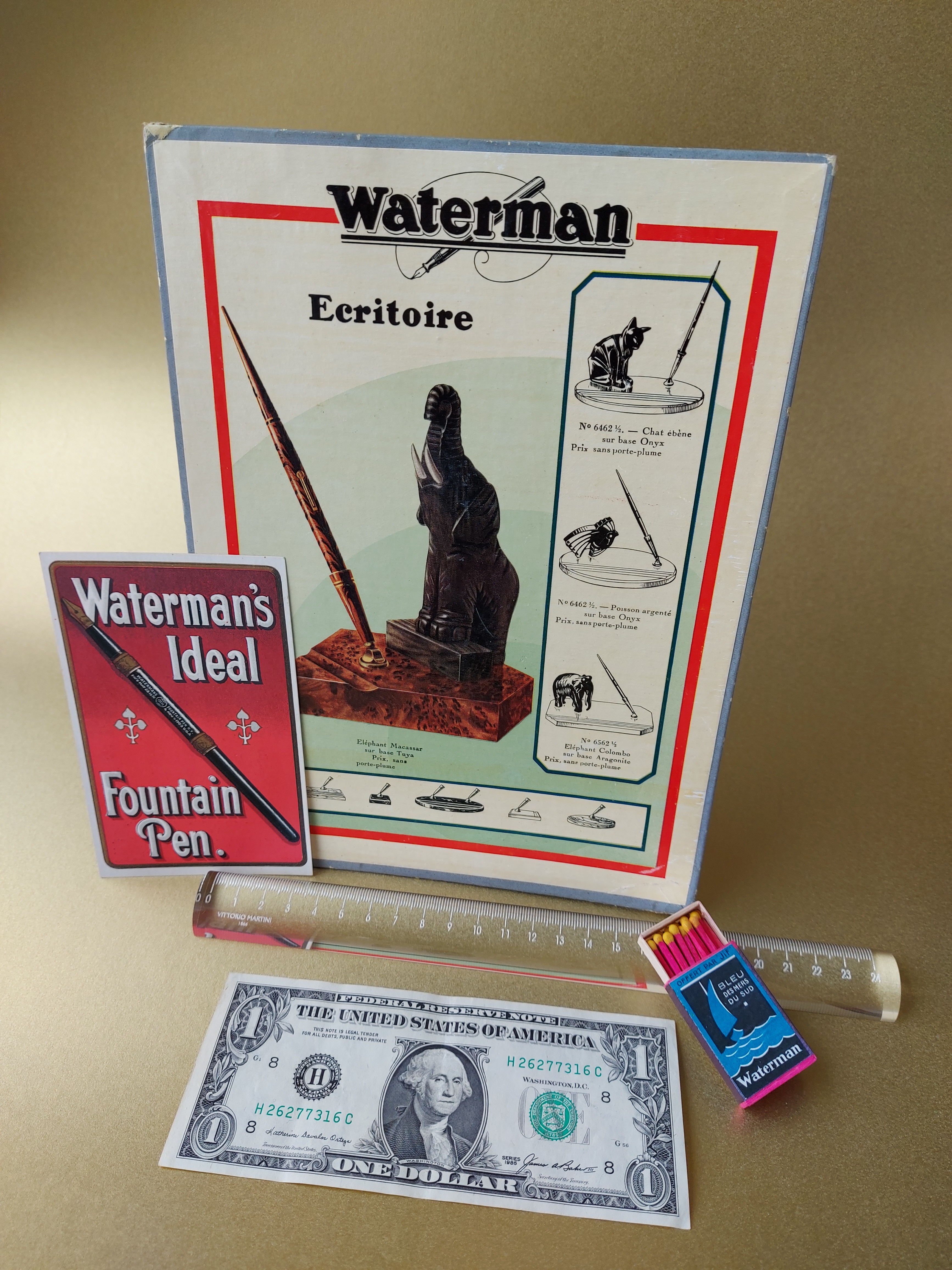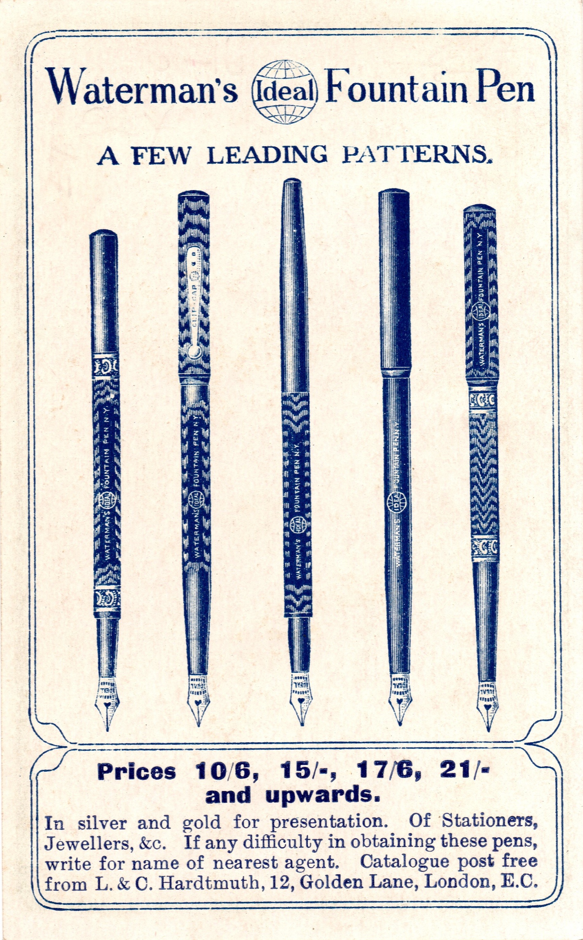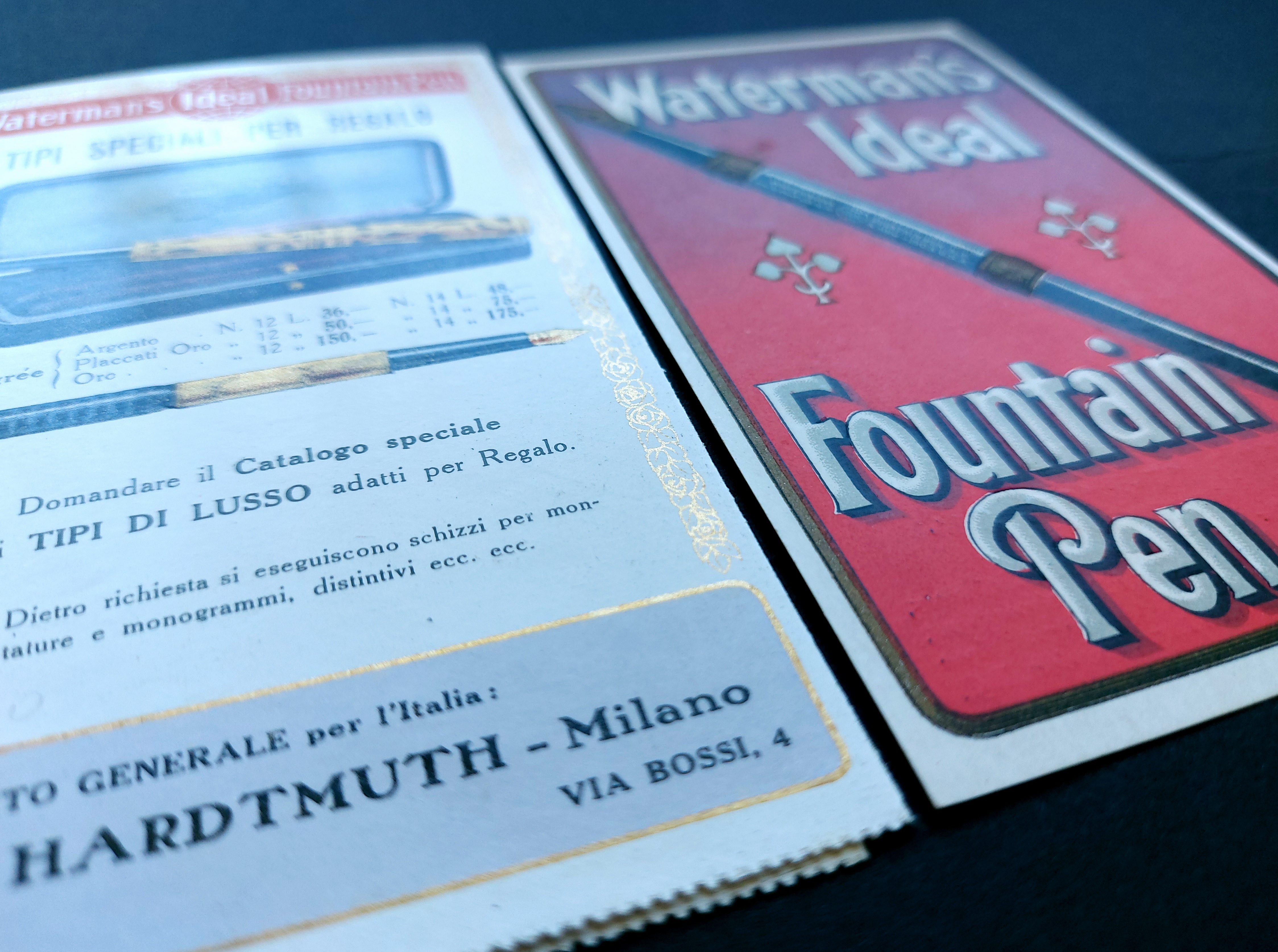 Raffigurate in inchiostro bluastro sul retro, le stilografiche (di cui ci vengono comunicati solo i prezzi) sono tutte con caricamento a contagocce (Eyedropper), “early models” per noi sul Wiki (https://www.fountainpen.it/Modelli_iniziali_Waterman). Confrontando i modelli “presenti” (e notando quelli “assenti” perché non ancora commercializzati, come le rientranti) e i prezzi riportati, daterei questa pubblicità intorno al 1908.