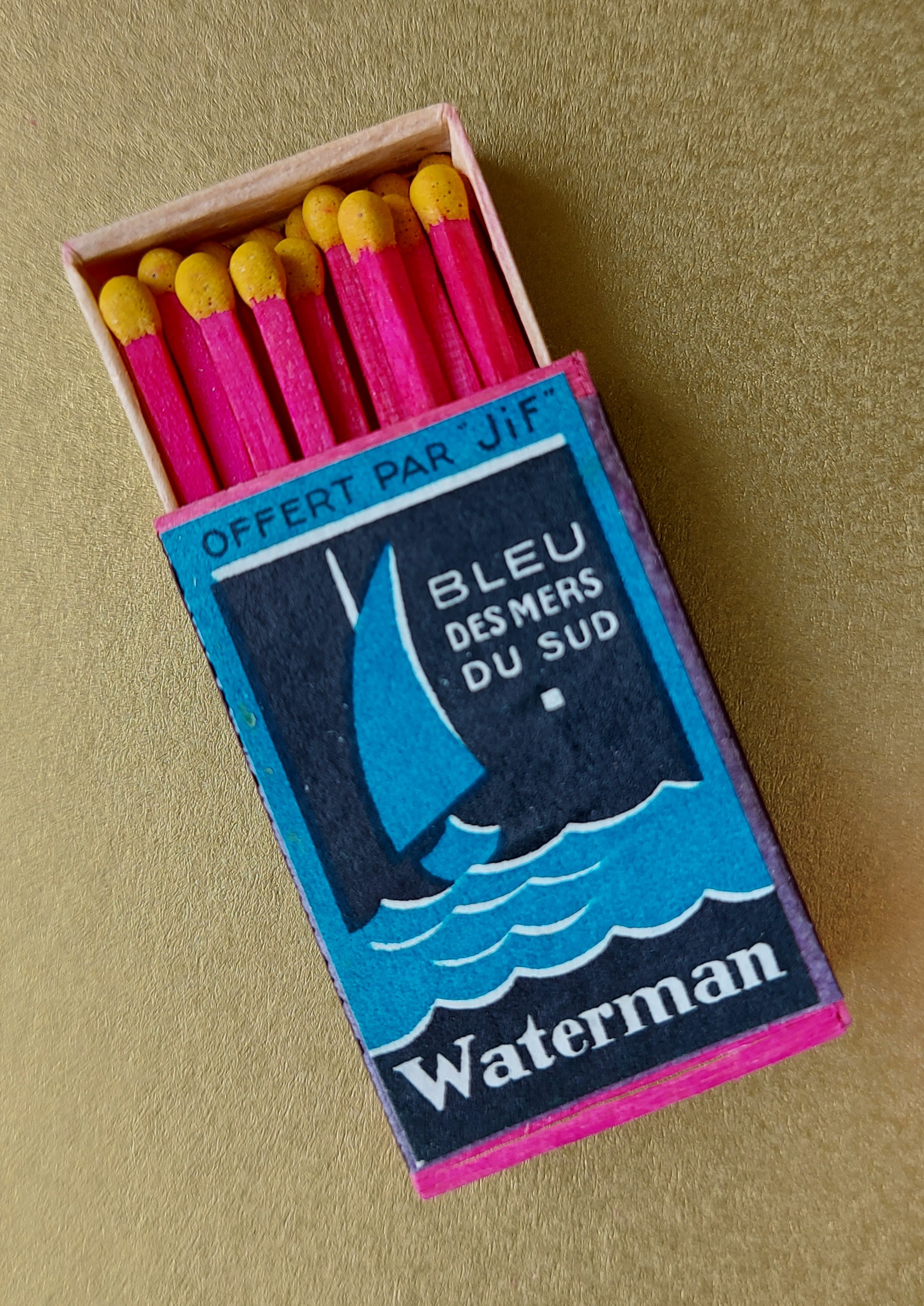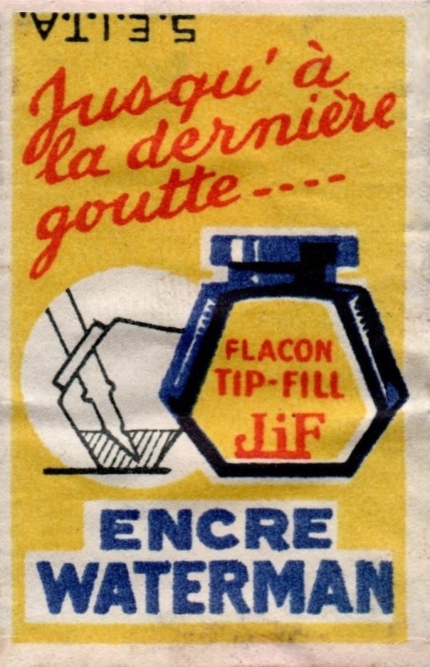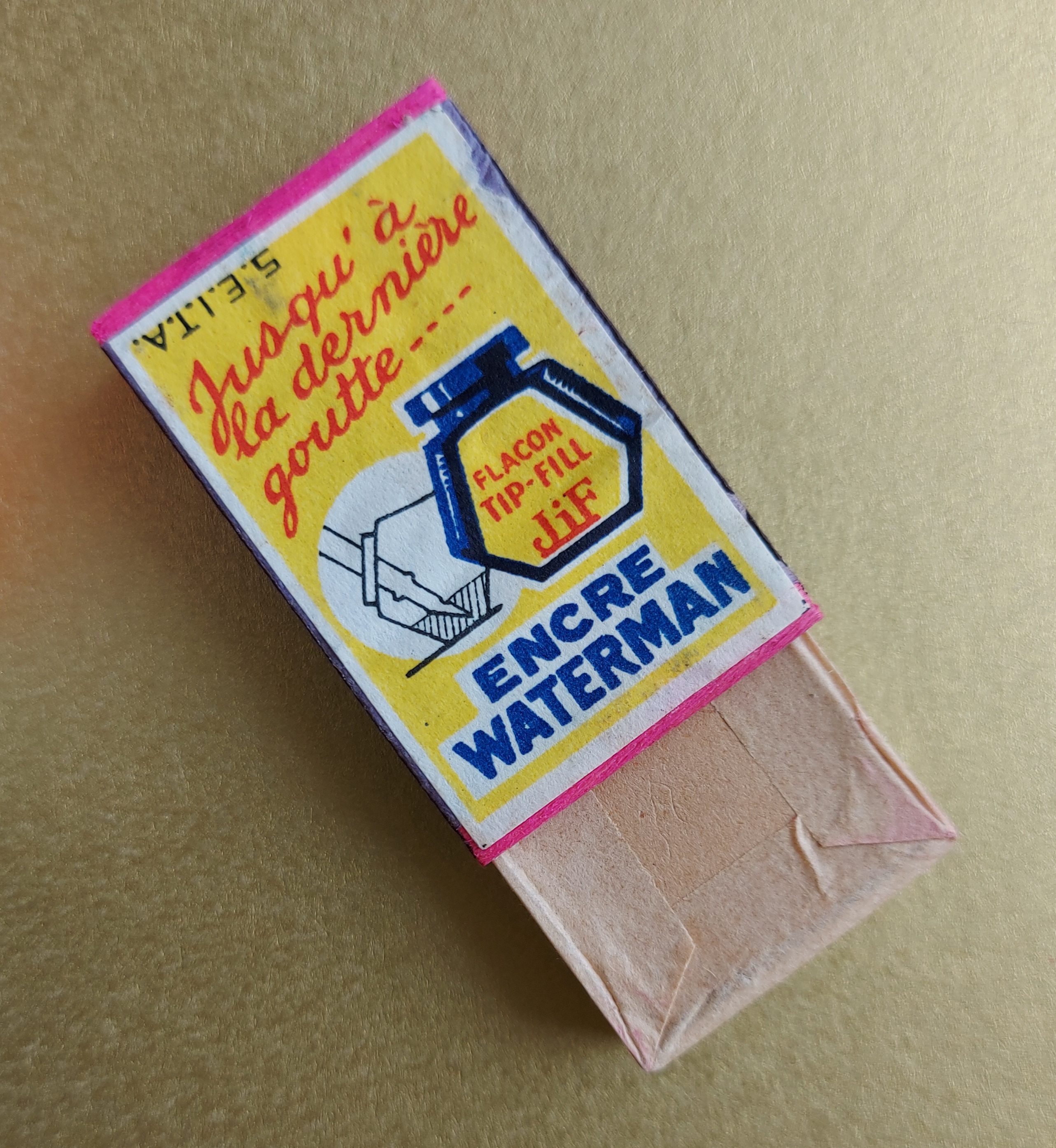 Raffigurate in inchiostro bluastro sul retro, le stilografiche (di cui ci vengono comunicati solo i prezzi) sono tutte con caricamento a contagocce (Eyedropper), “early models” per noi sul Wiki (https://www.fountainpen.it/Modelli_iniziali_Waterman). Confrontando i modelli “presenti” (e notando quelli “assenti” perché non ancora commercializzati, come le rientranti) e i prezzi riportati, daterei questa pubblicità intorno al 1908.
